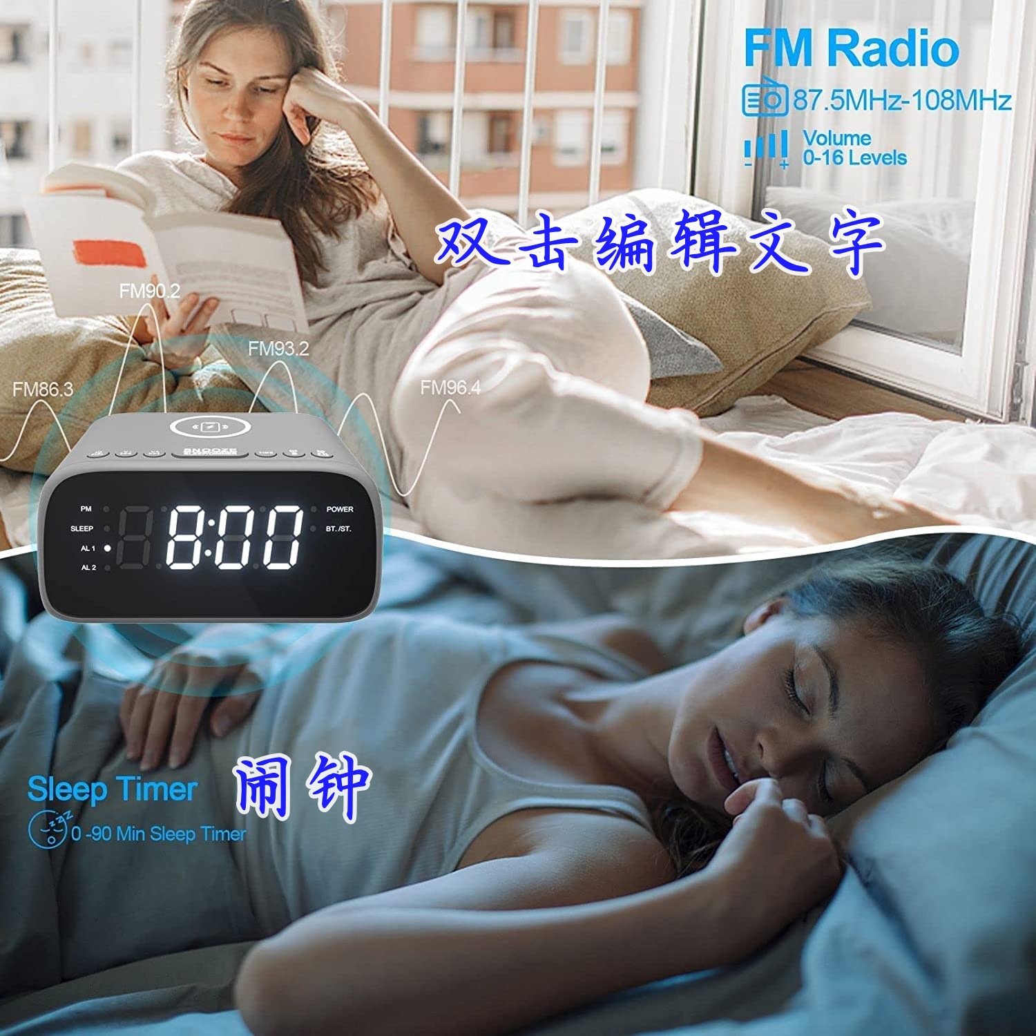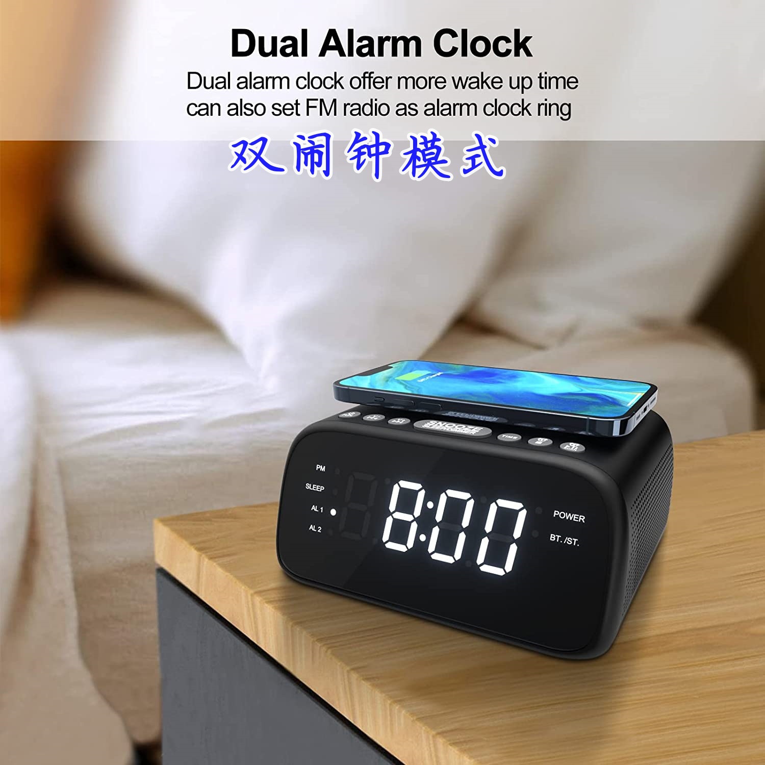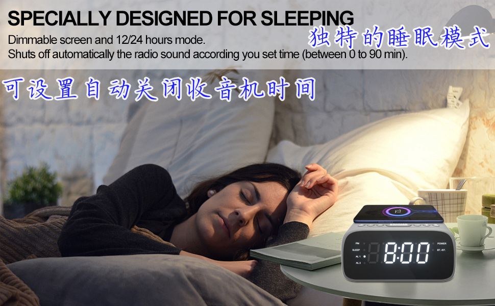 블루투스 라디오 통합 기계, 듀얼 스테레오 스피커, 무선 슈퍼 빠른 충전, 듀얼 알람 시계스토어 가기