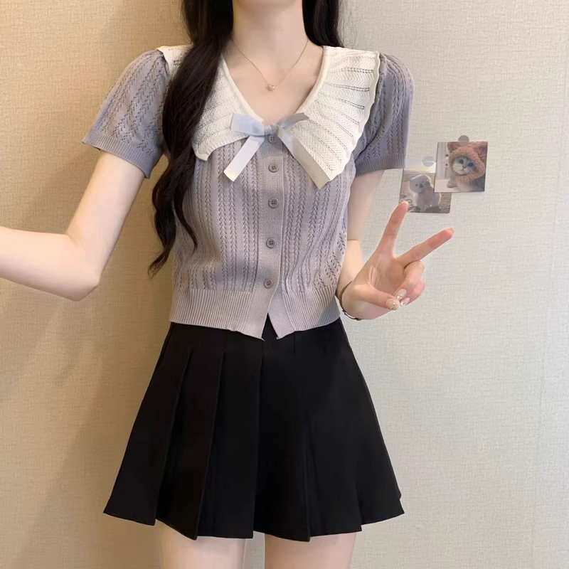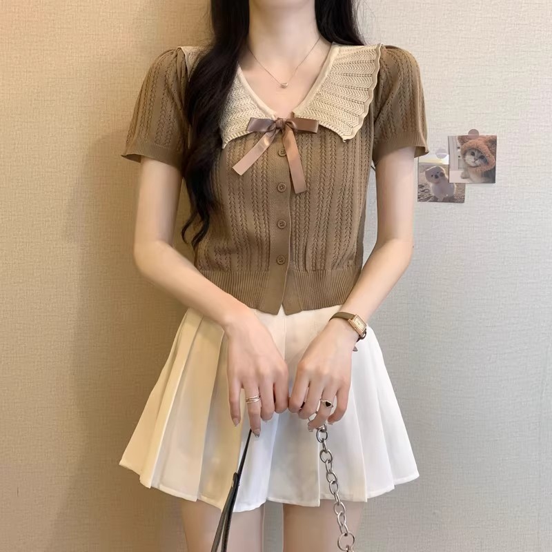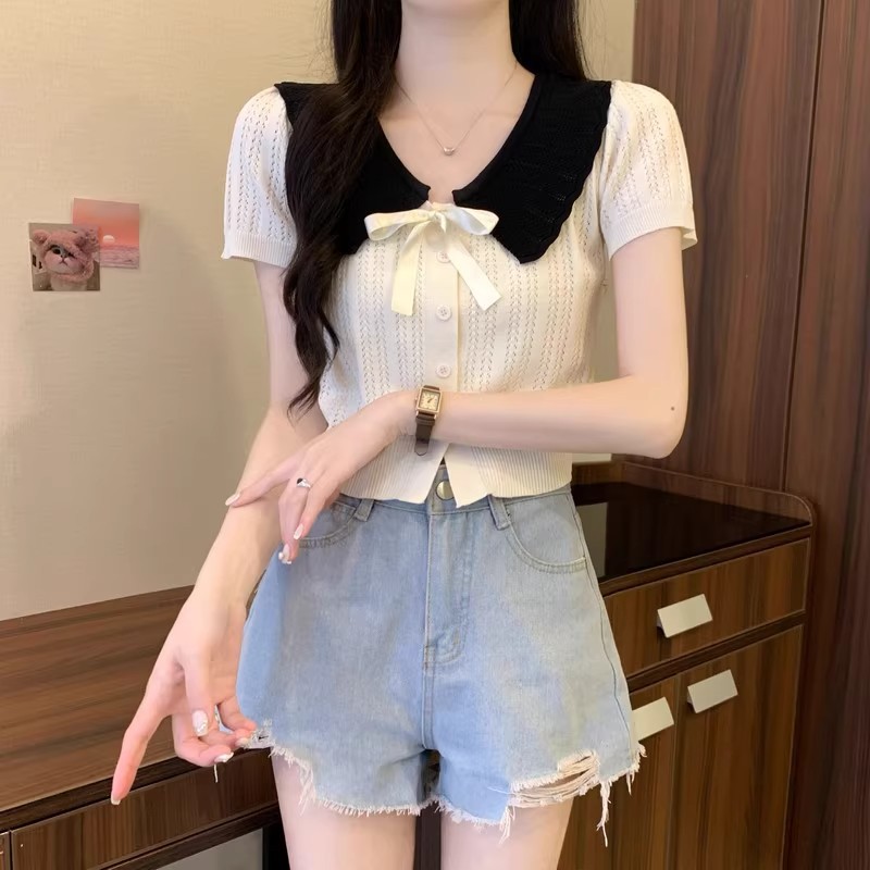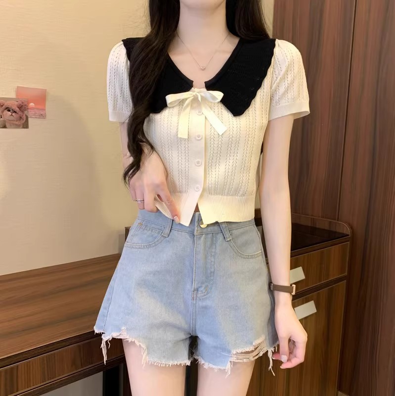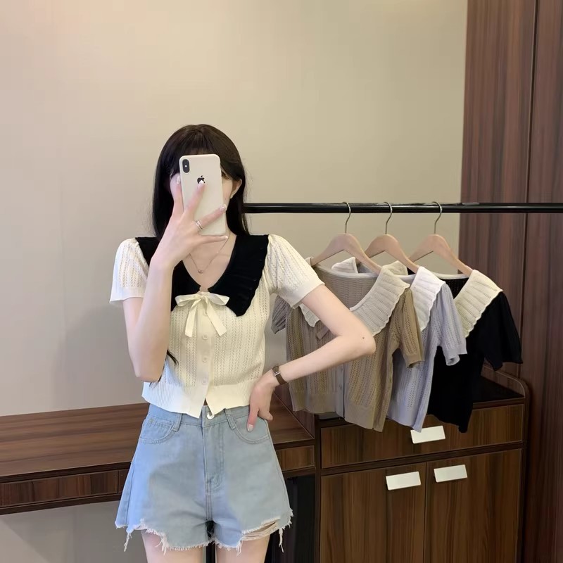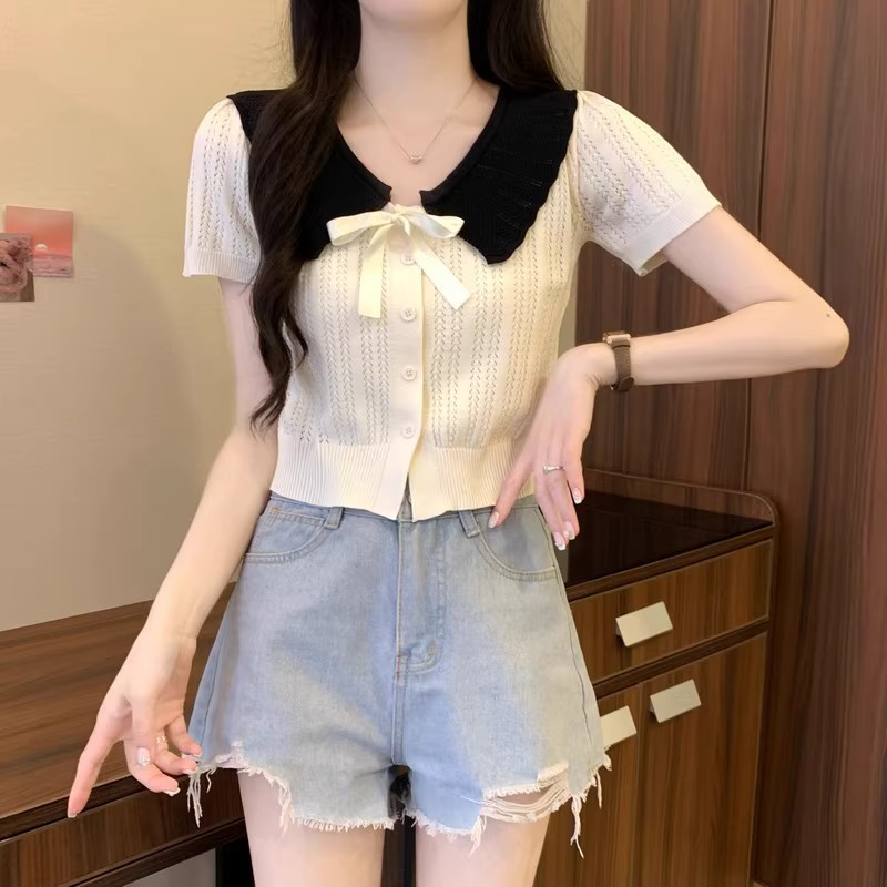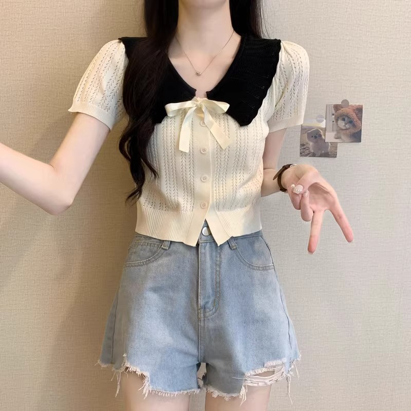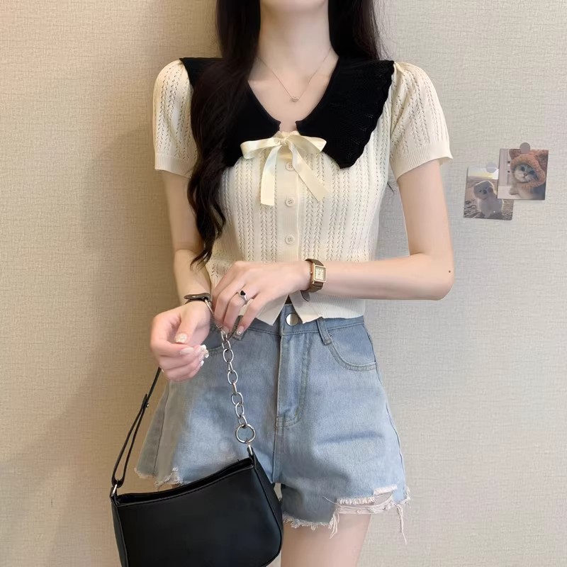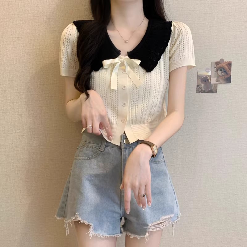 프랑스 스타일 활 인형 칼라 할로우 반팔 스웨터 여성 여름 대학 스타일 연령 감소 서양식 짧은 얇은 탑스토어 가기