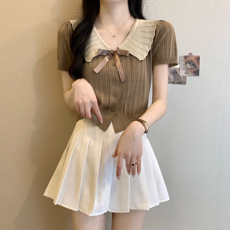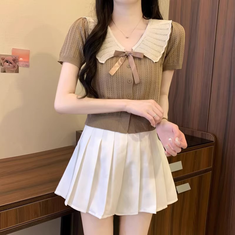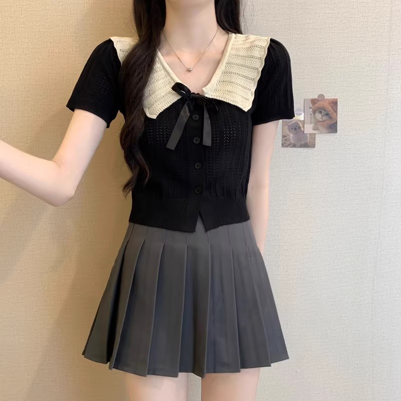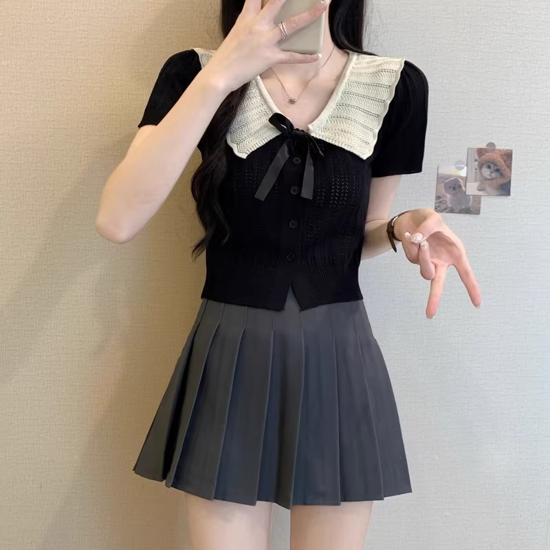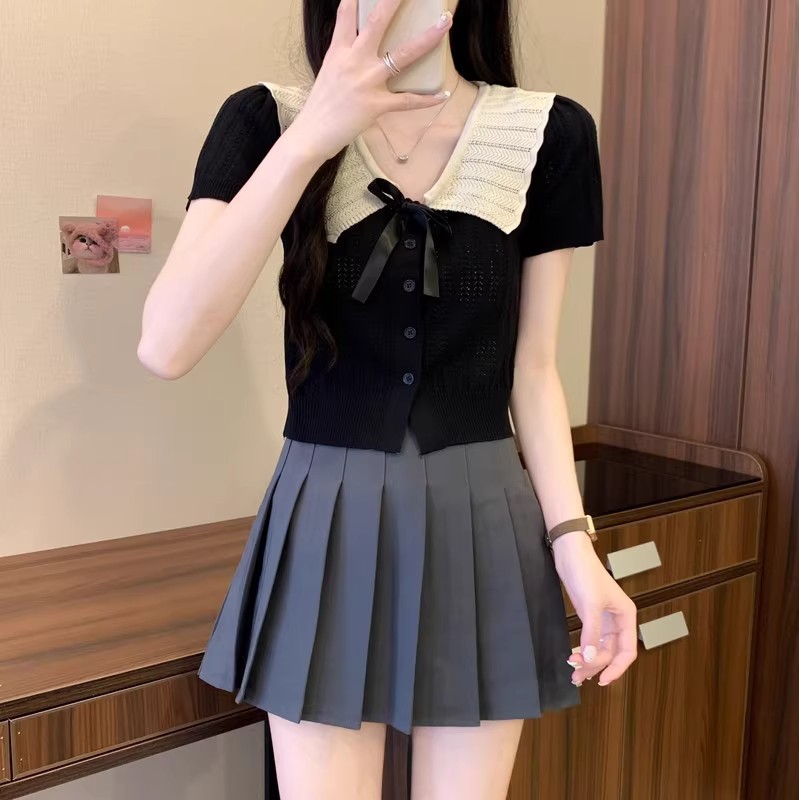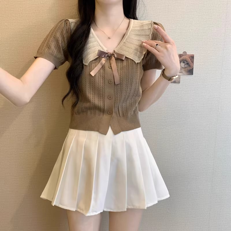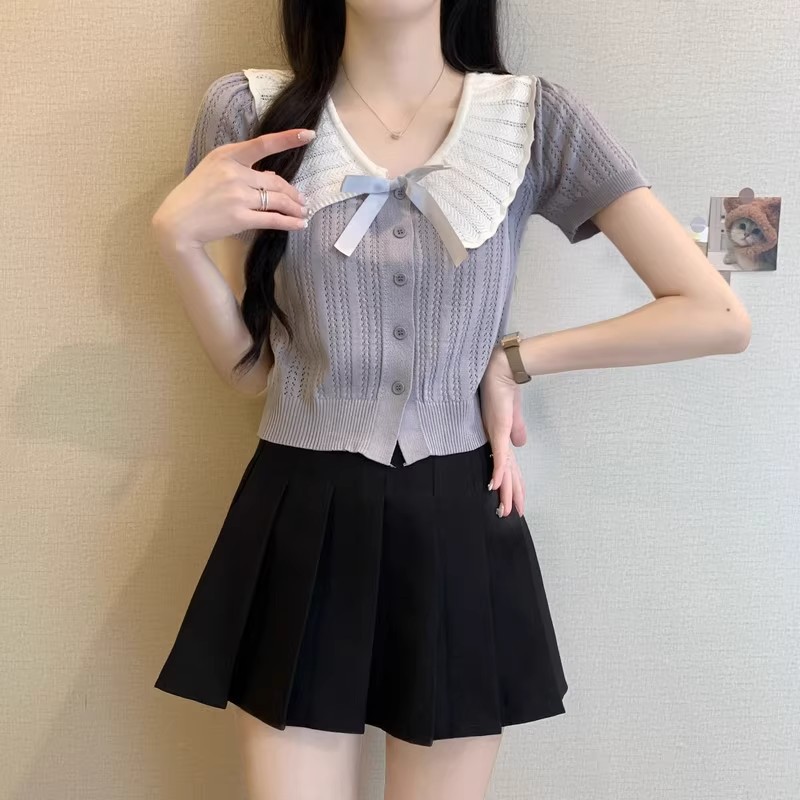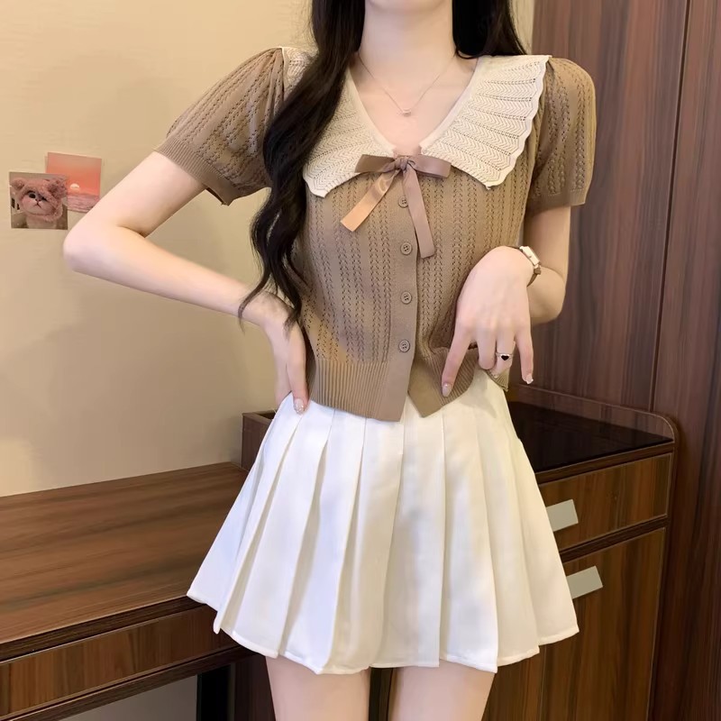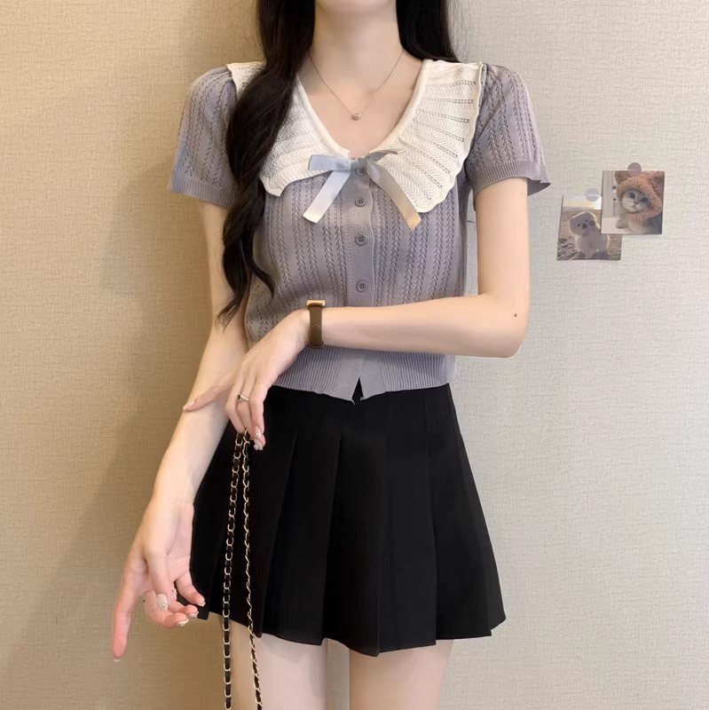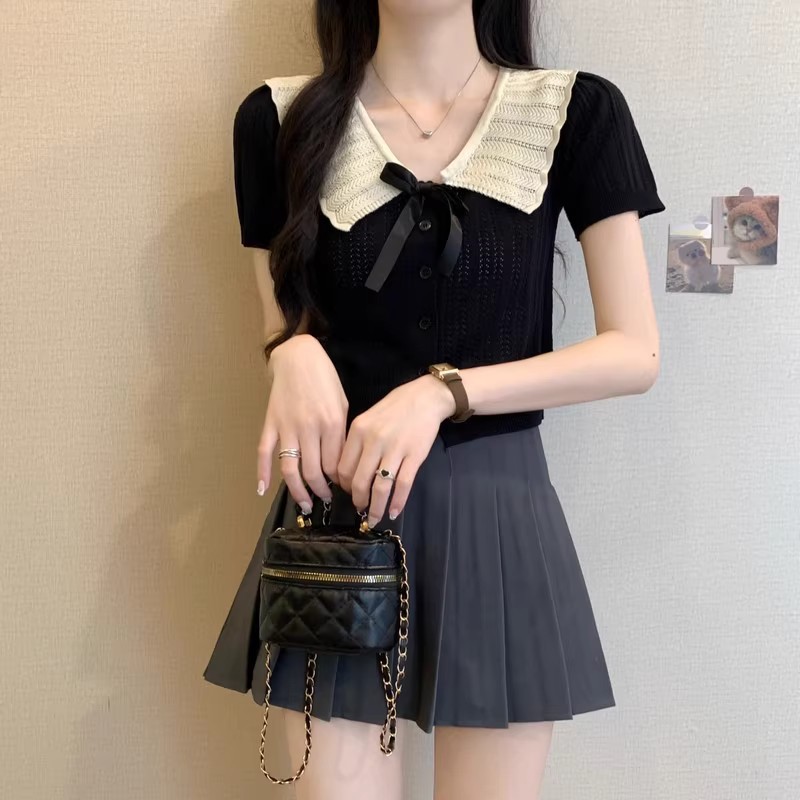 프랑스 스타일 활 인형 칼라 할로우 반팔 스웨터 여성 여름 대학 스타일 연령 감소 서양식 짧은 얇은 탑스토어 가기