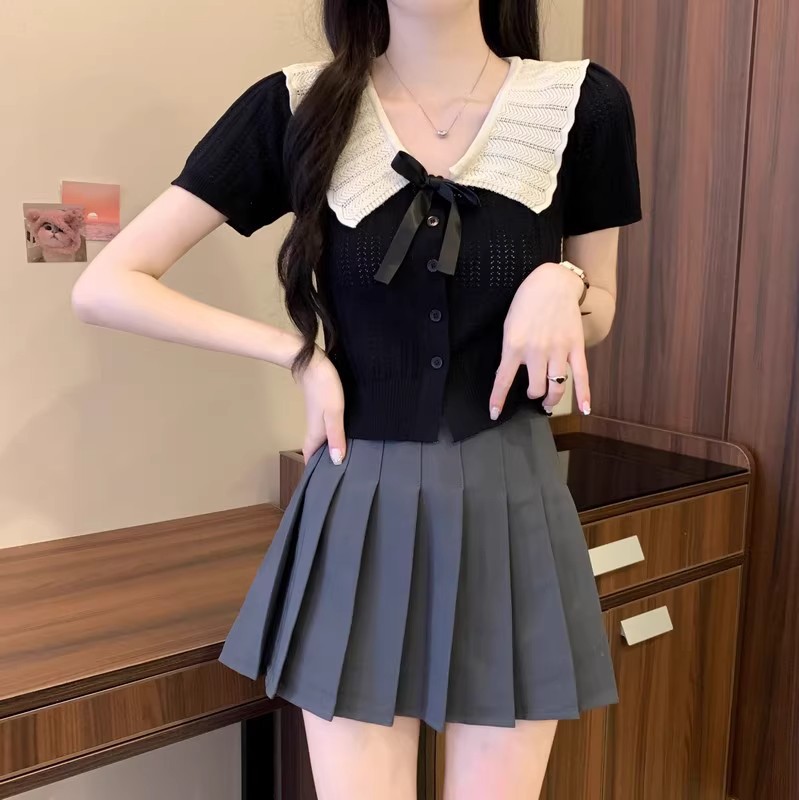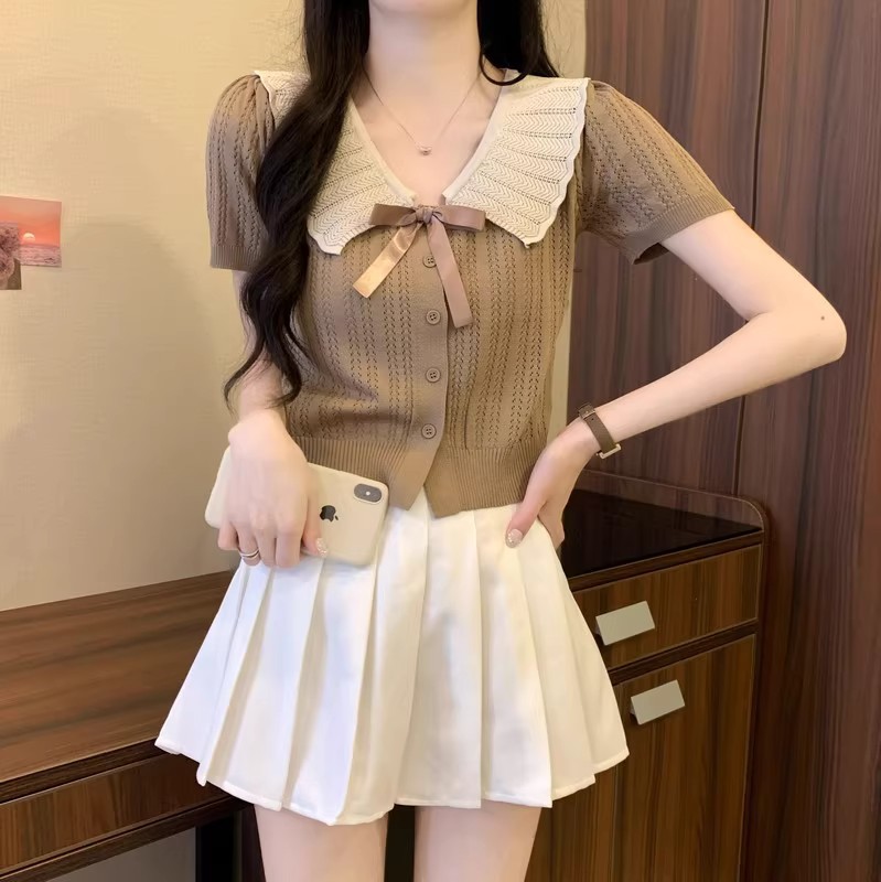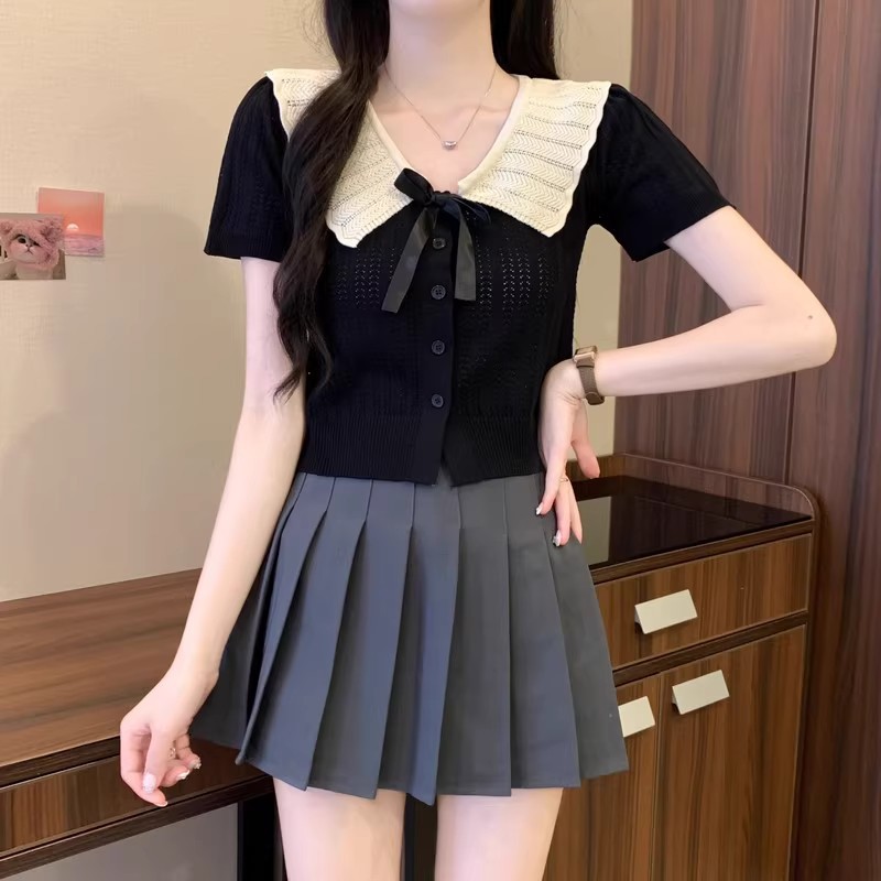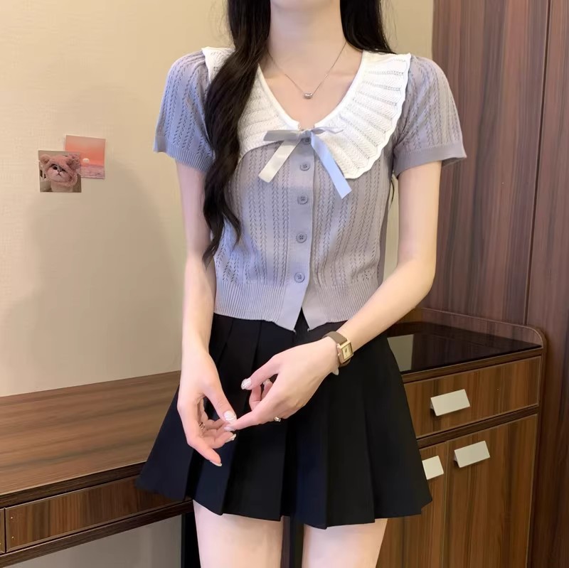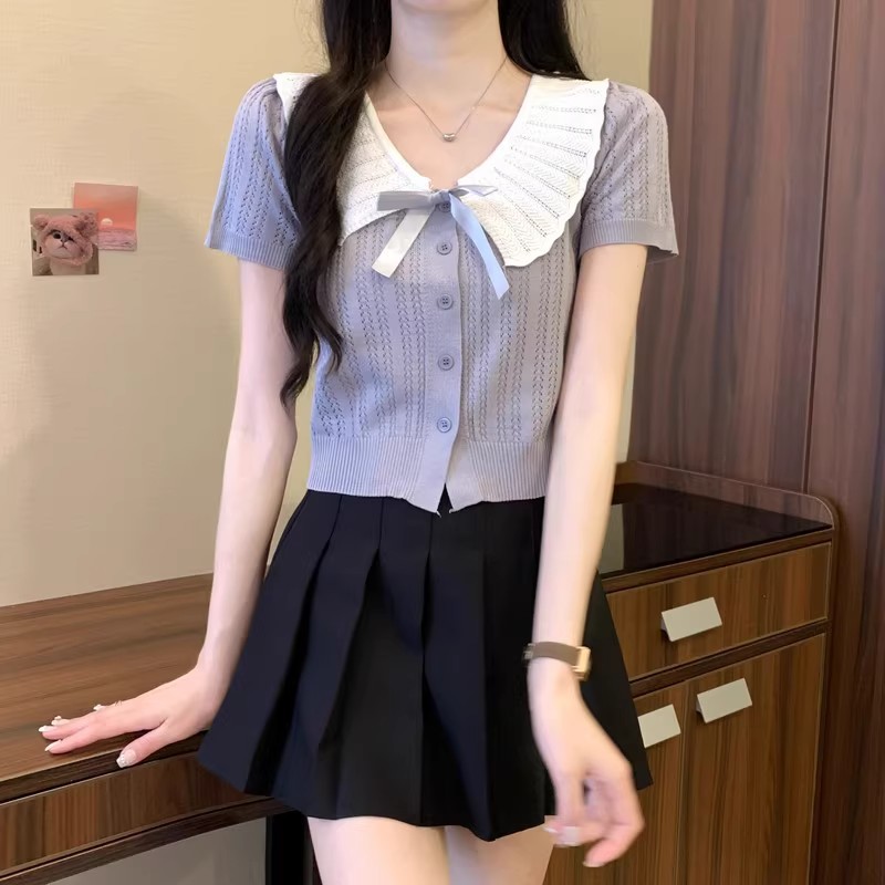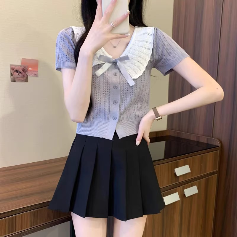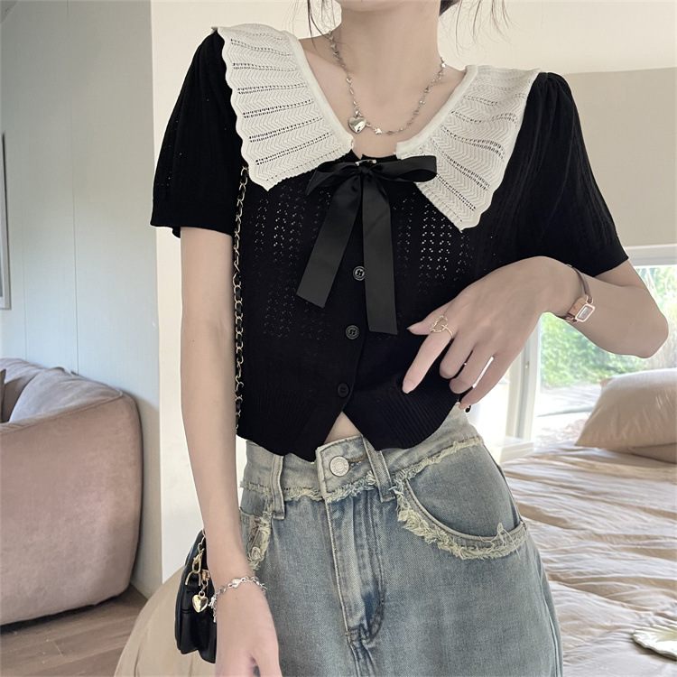 프랑스 스타일 활 인형 칼라 할로우 반팔 스웨터 여성 여름 대학 스타일 연령 감소 서양식 짧은 얇은 탑