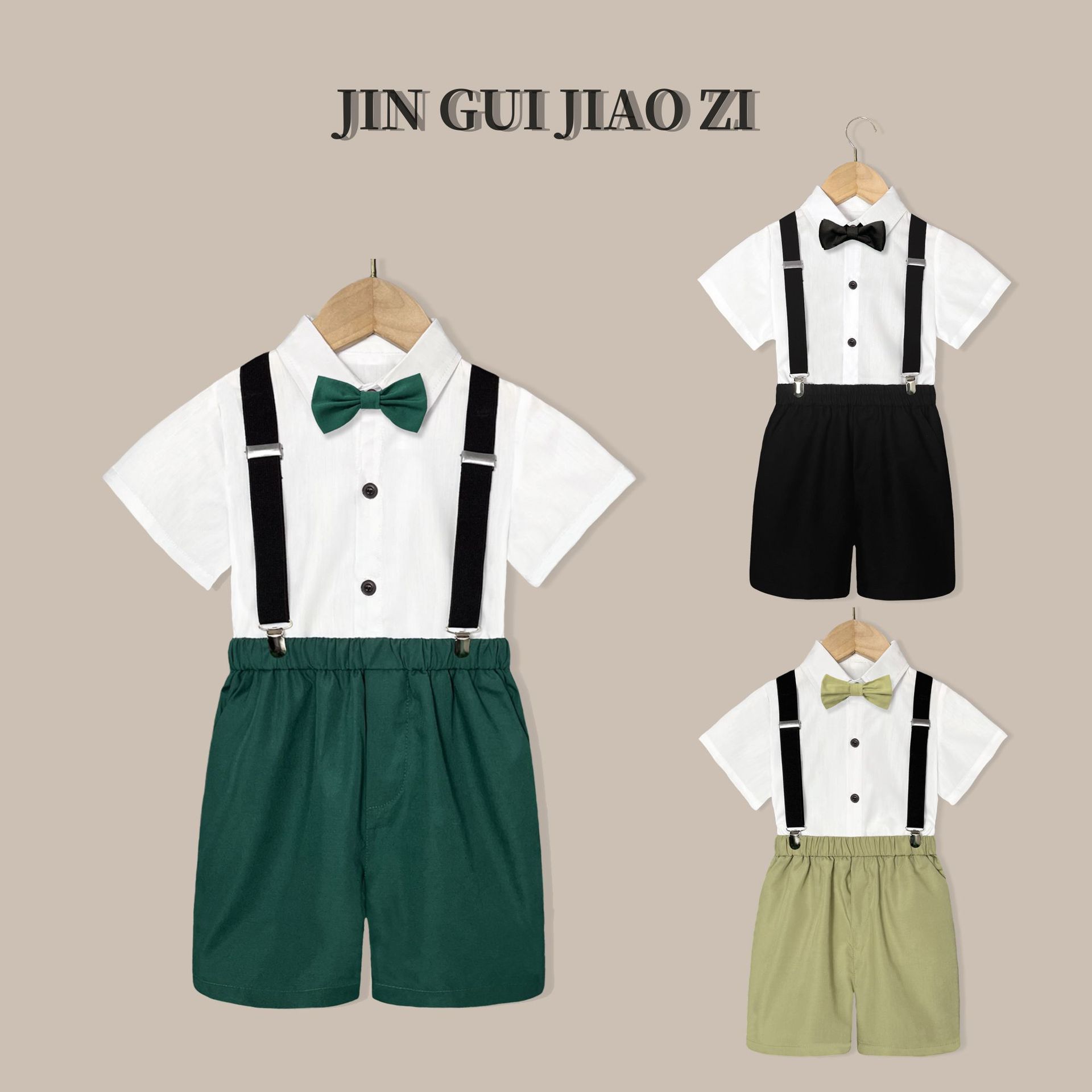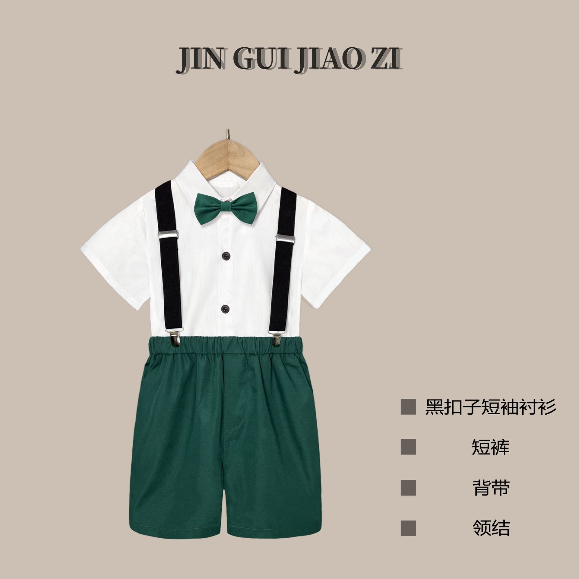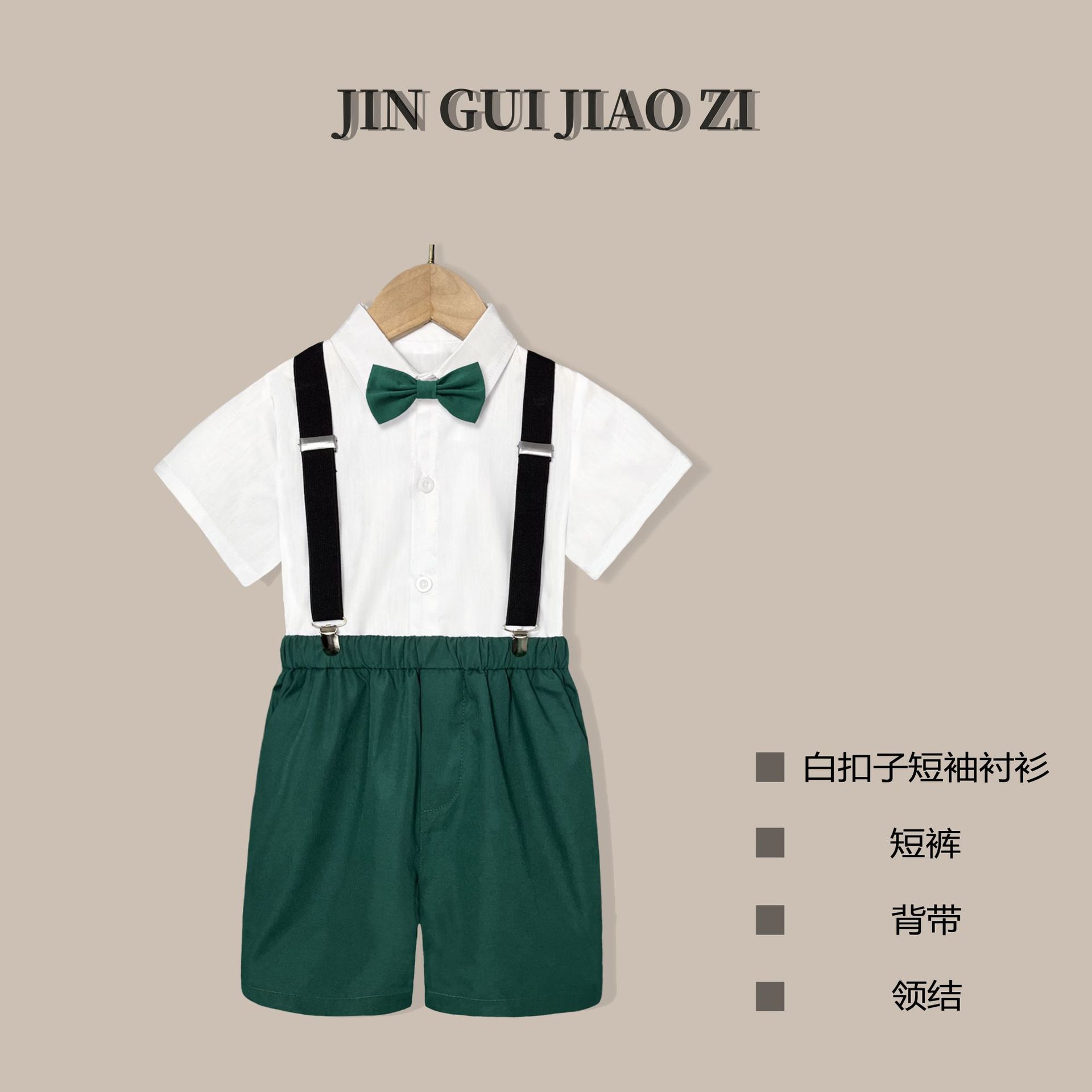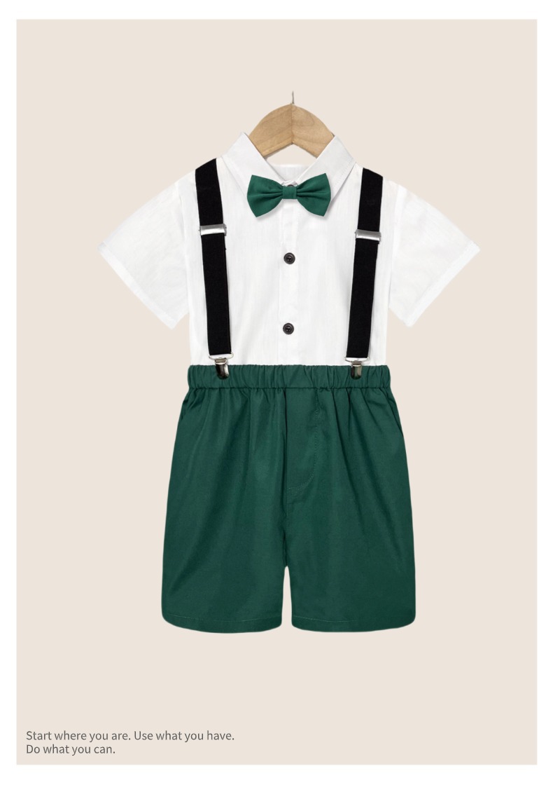 • 다크 그린 바지 (흰색 버튼 셔츠 반바지 백 스트랩 나비 넥타이)