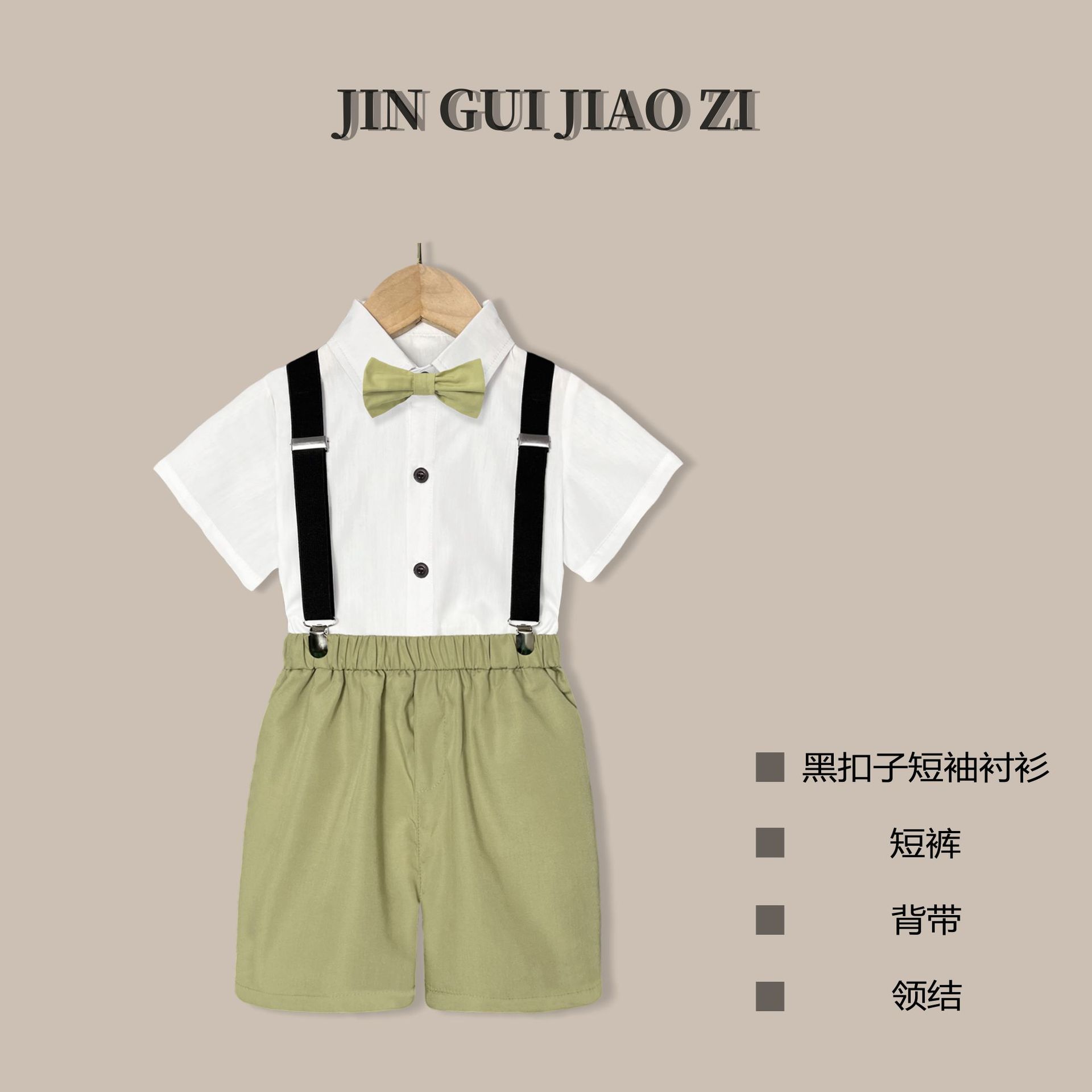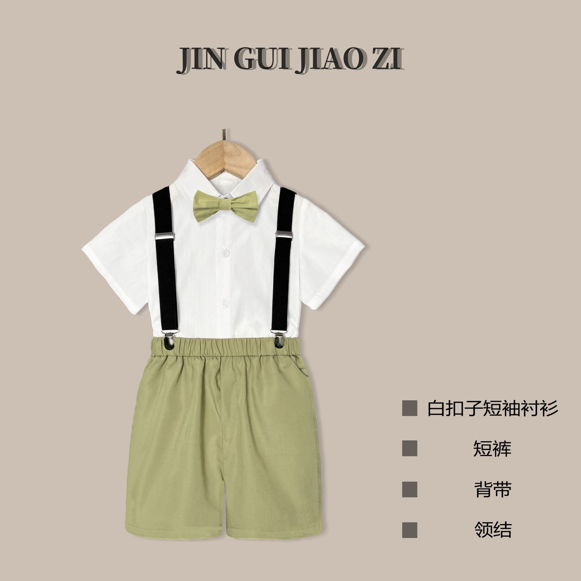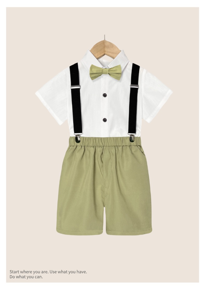 • 라이트 그린 바지 (흰색 버튼 셔츠 반바지 백 스트랩 나비 넥타이)