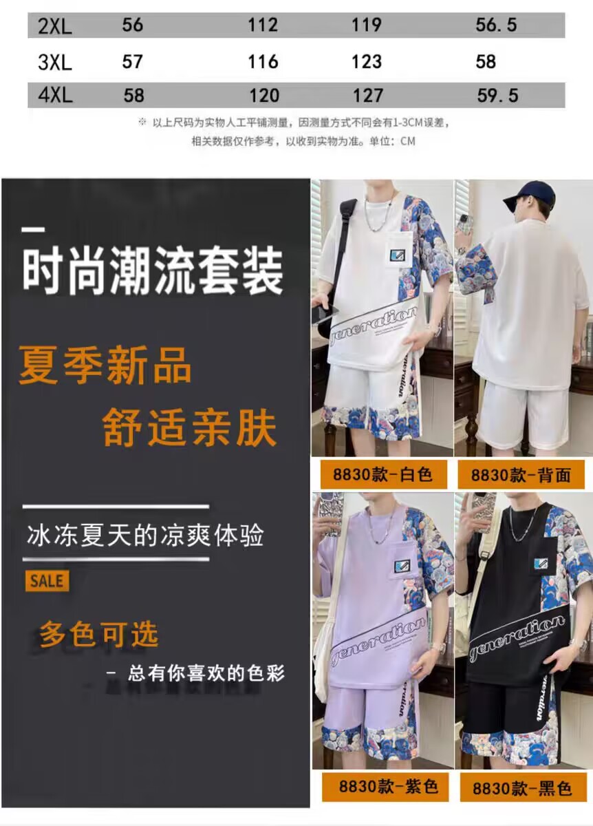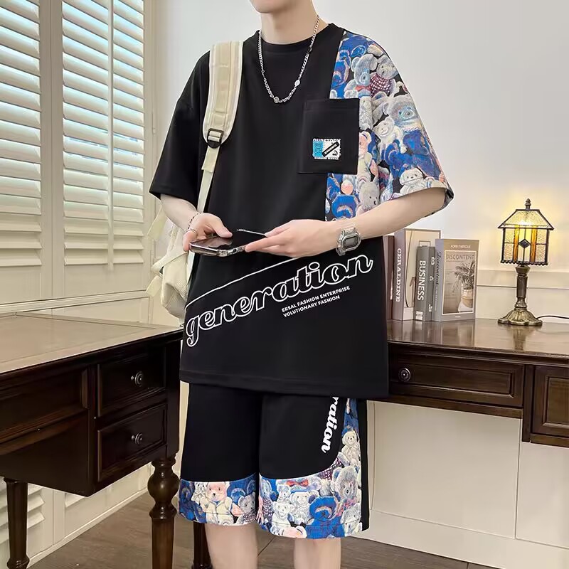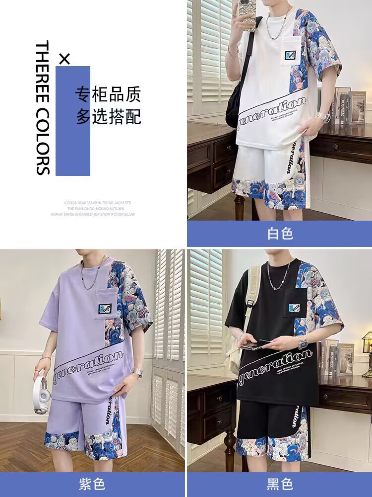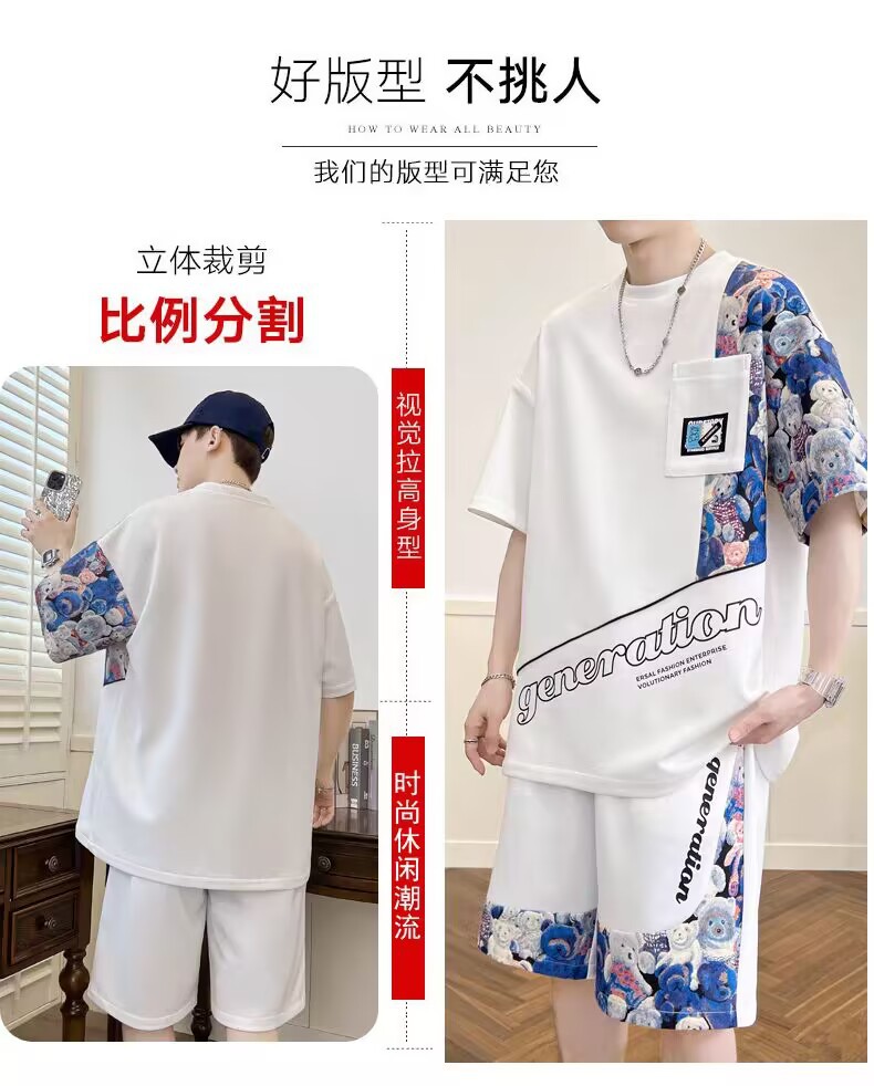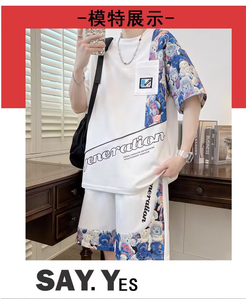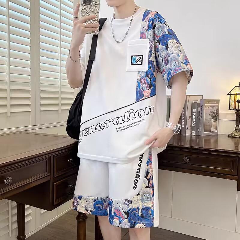남성 캐주얼 스포츠 반팔 세트 느슨한 플러스 사이즈 통기성 여름 성격 인쇄 패션 홍콩 스타일 공장 아울렛스토어 가기