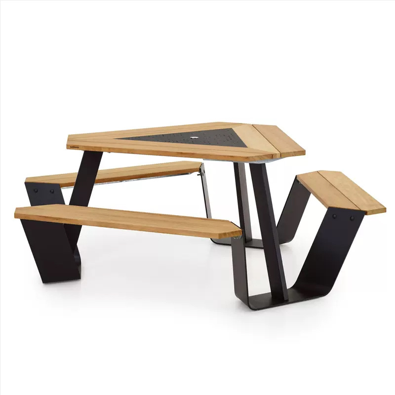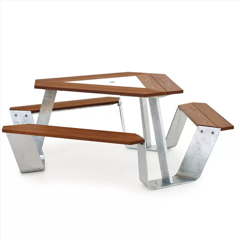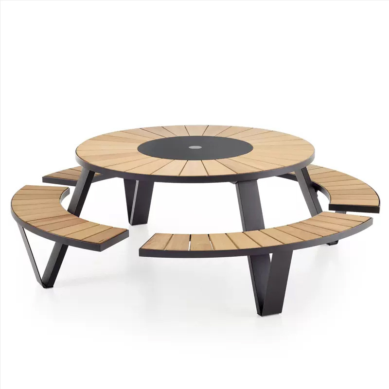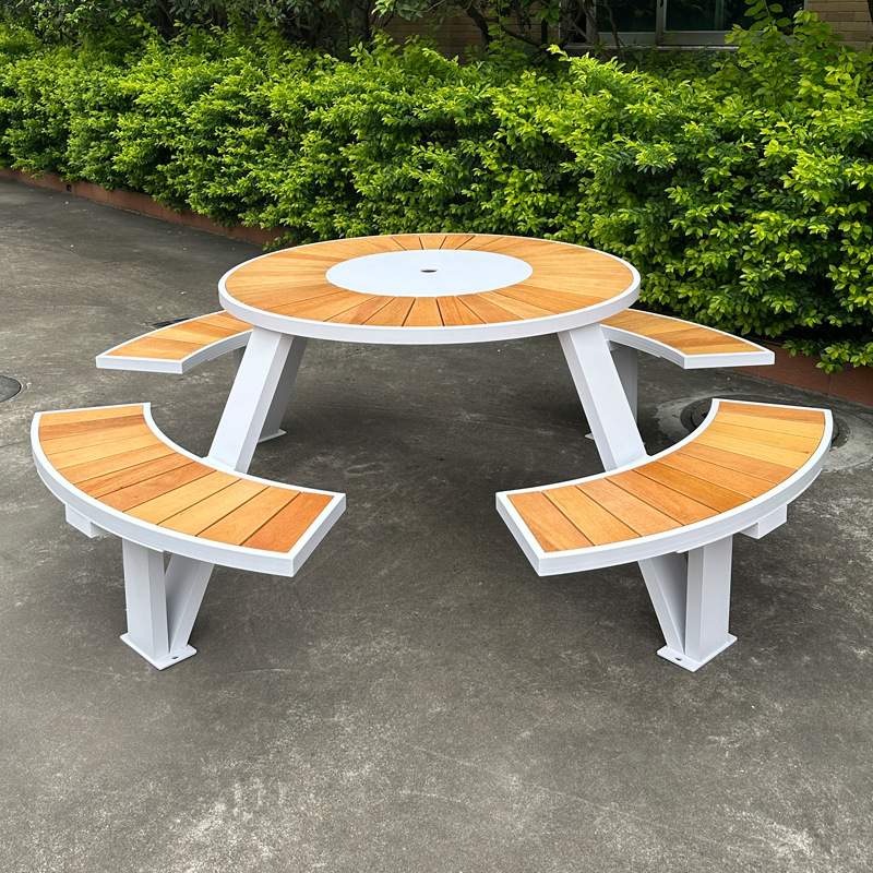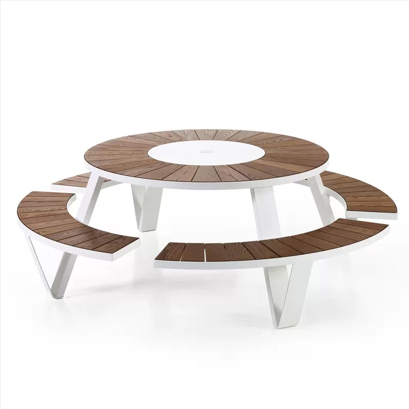 창의적인 야외 원형 테이블, 파크 체어, 우산, 방수 및 자외선 차단, 레스토랑 야외 일체형 스테인레스 스틸 플라스틱 목재 테이블과 의자