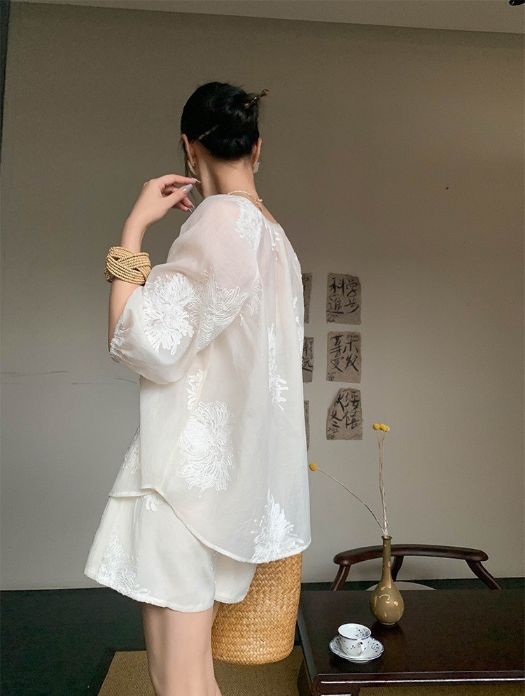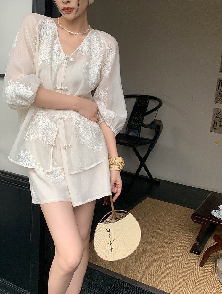 새로운 중국 스타일 국가 스타일 유행 우아한 투피스 세트 여성 여름 새로운 자수 최고 치마 넓은 다리 반바지 유행스토어 가기