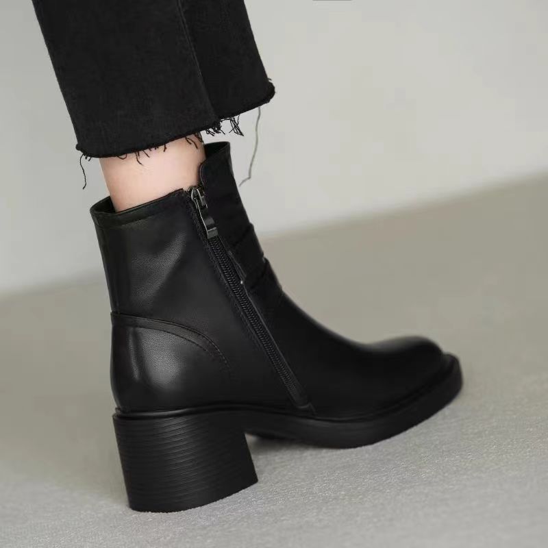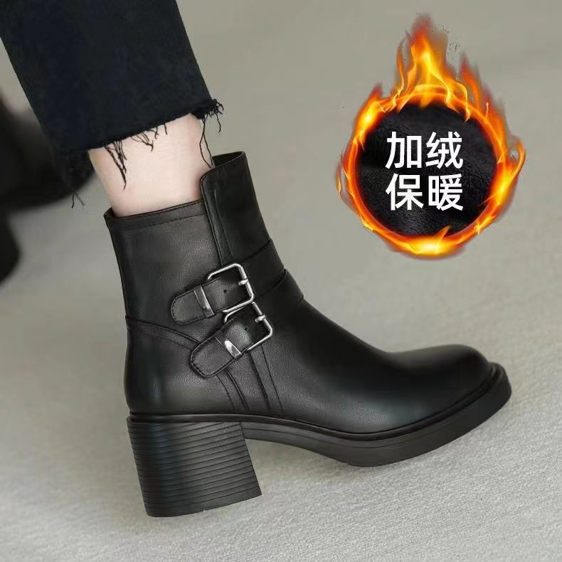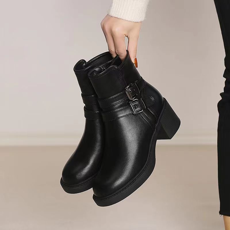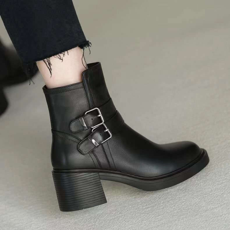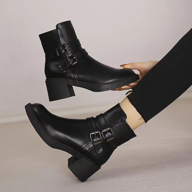 마틴 부츠 블랙 벨트 버클 소프트 가죽 라운드 발가락 미드 힐 발목 부츠 여성 두꺼운 힐 발목 부츠 2024 새로운 가을 여성 부츠스토어 가기