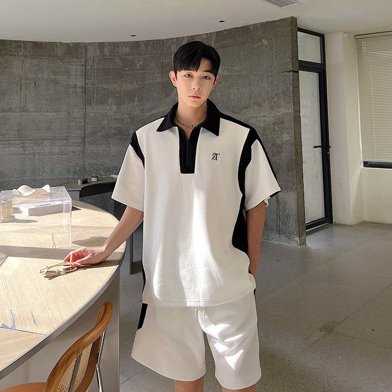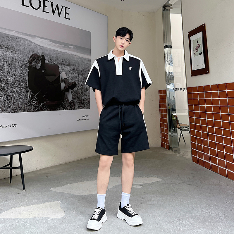 Summer Ins 트렌디 한 브랜드 캐주얼 스포츠 세트 남자 폴로 셔츠 티셔츠 명암 한국 스타일 반바지 투피스 세트