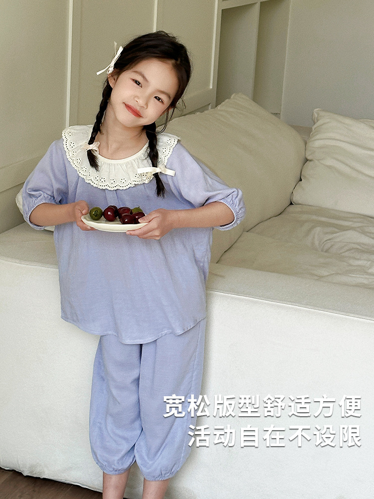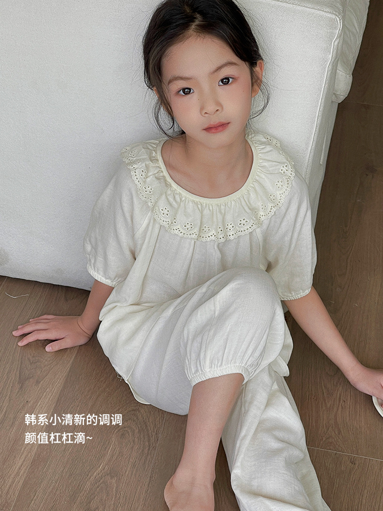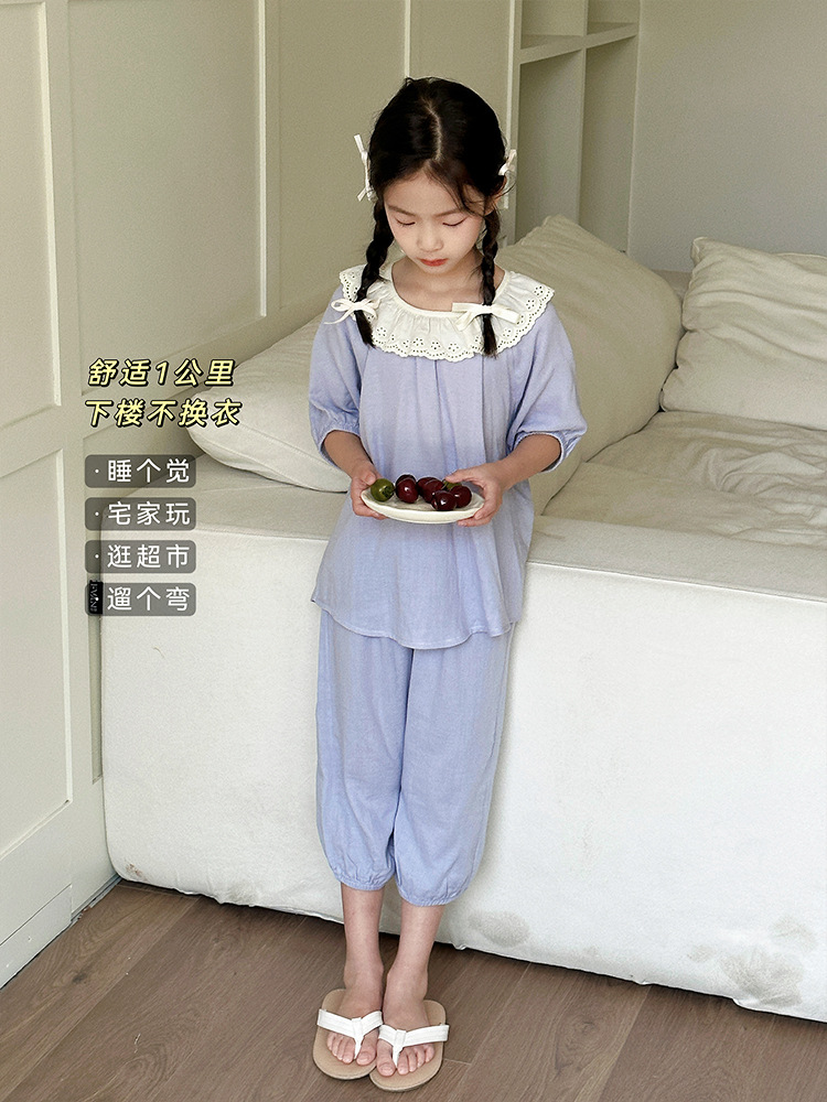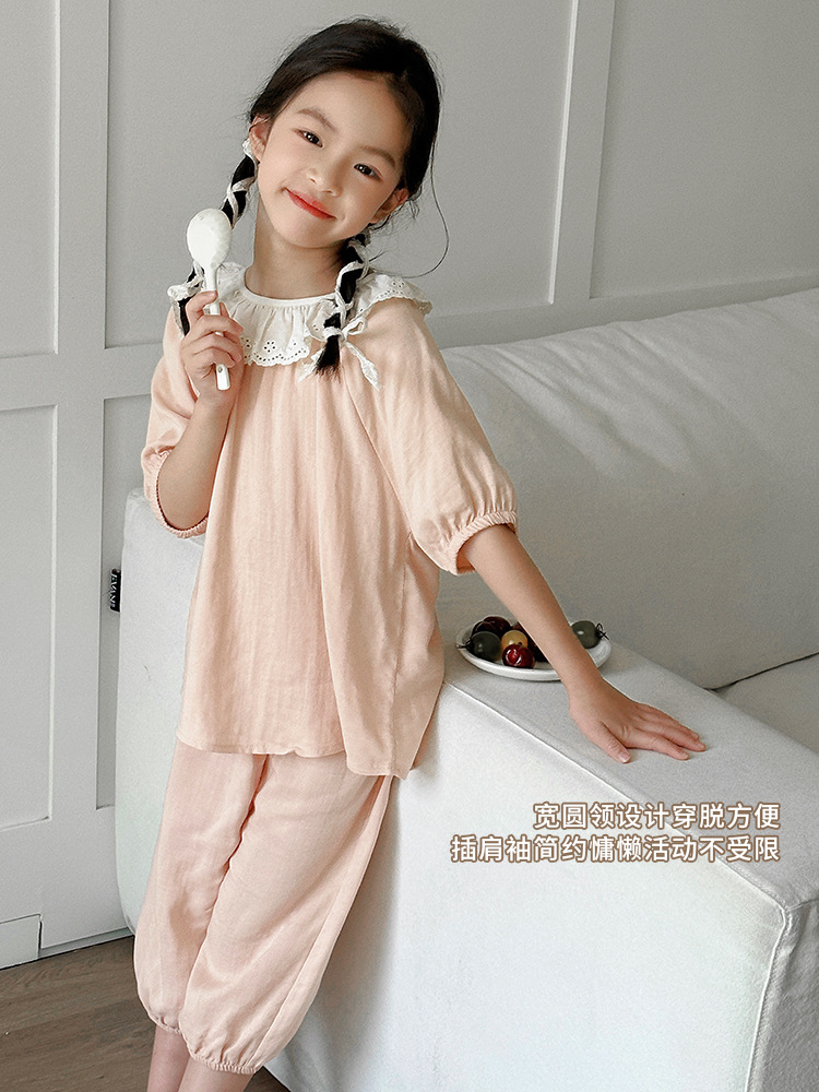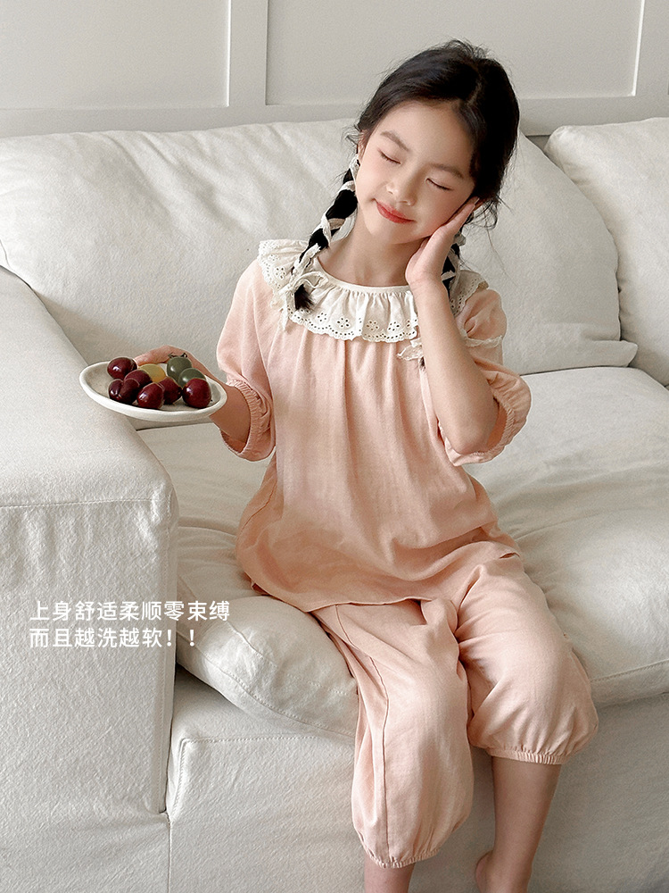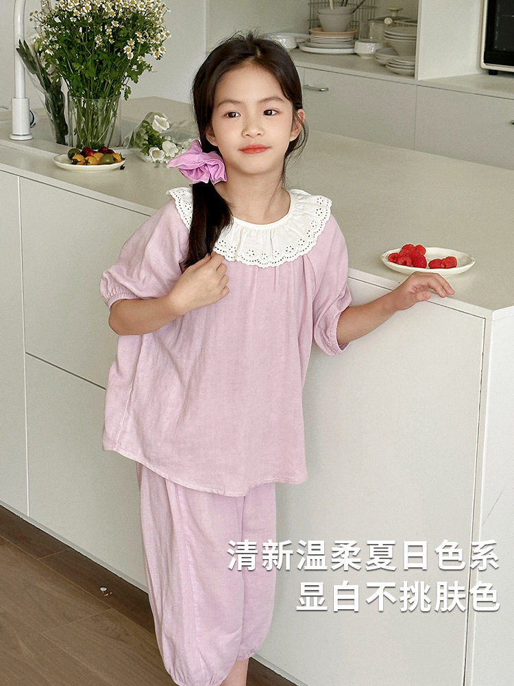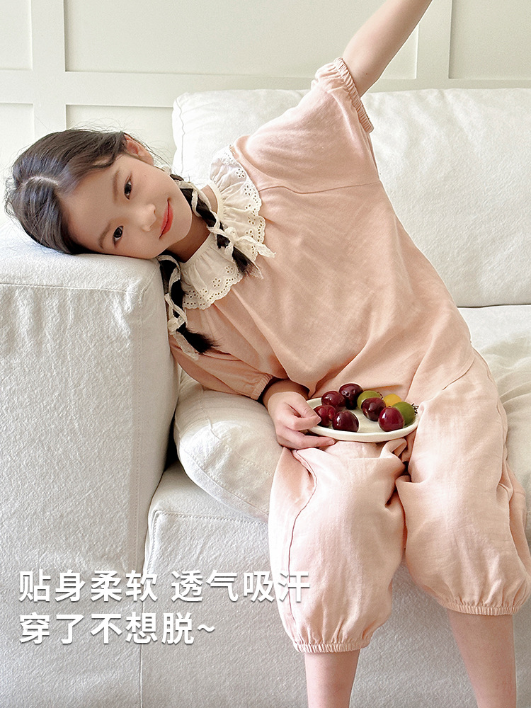여름 새로운 어린이 가정 옷 소녀의 대나무 면화 얇은 공주 스타일 작은 신선한 면화 잠옷 투피스 양복스토어 가기