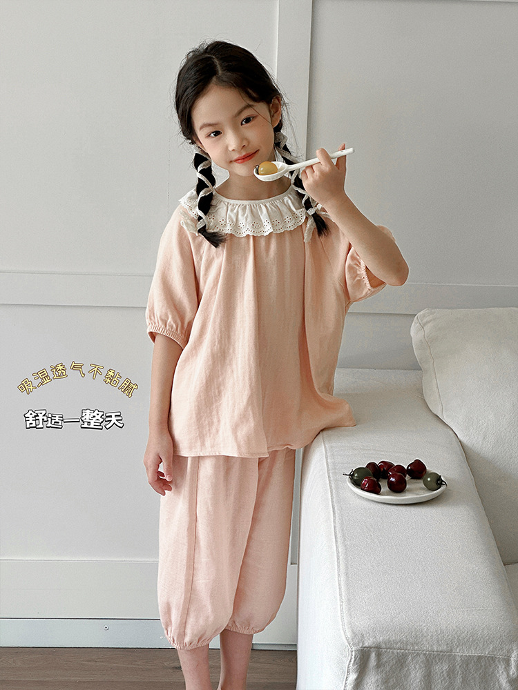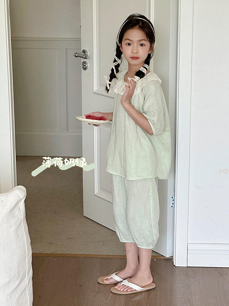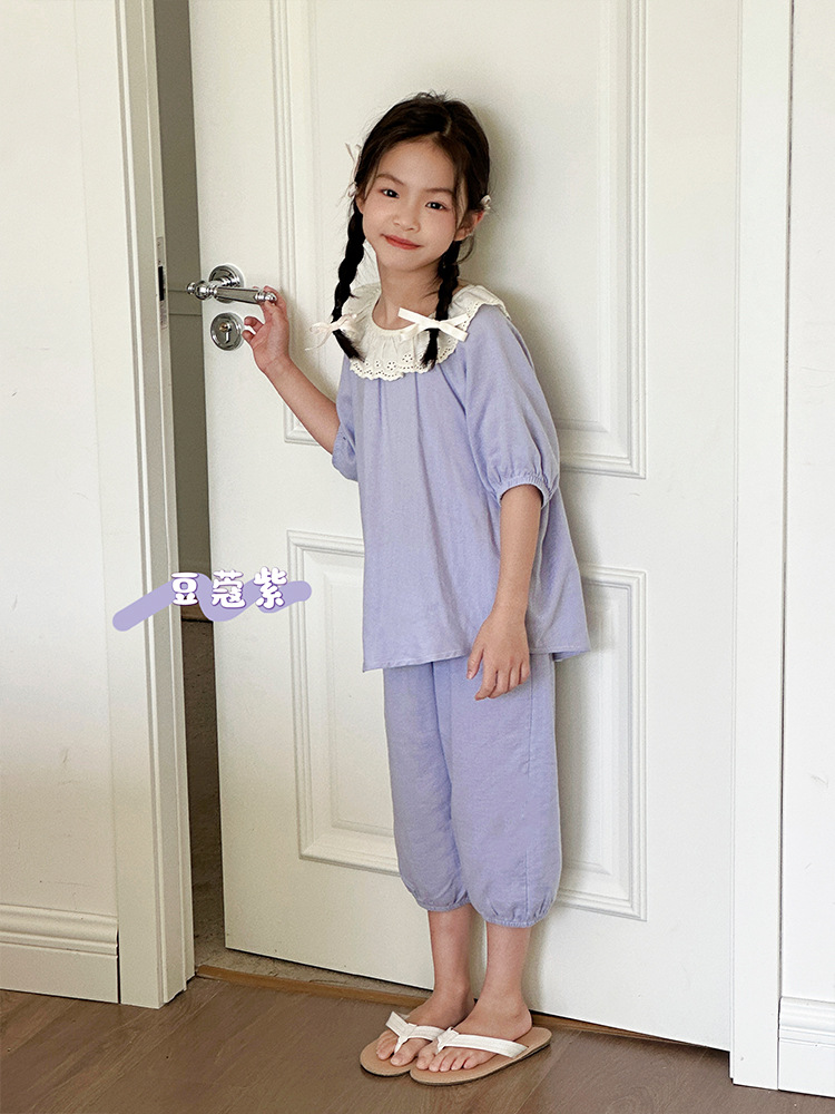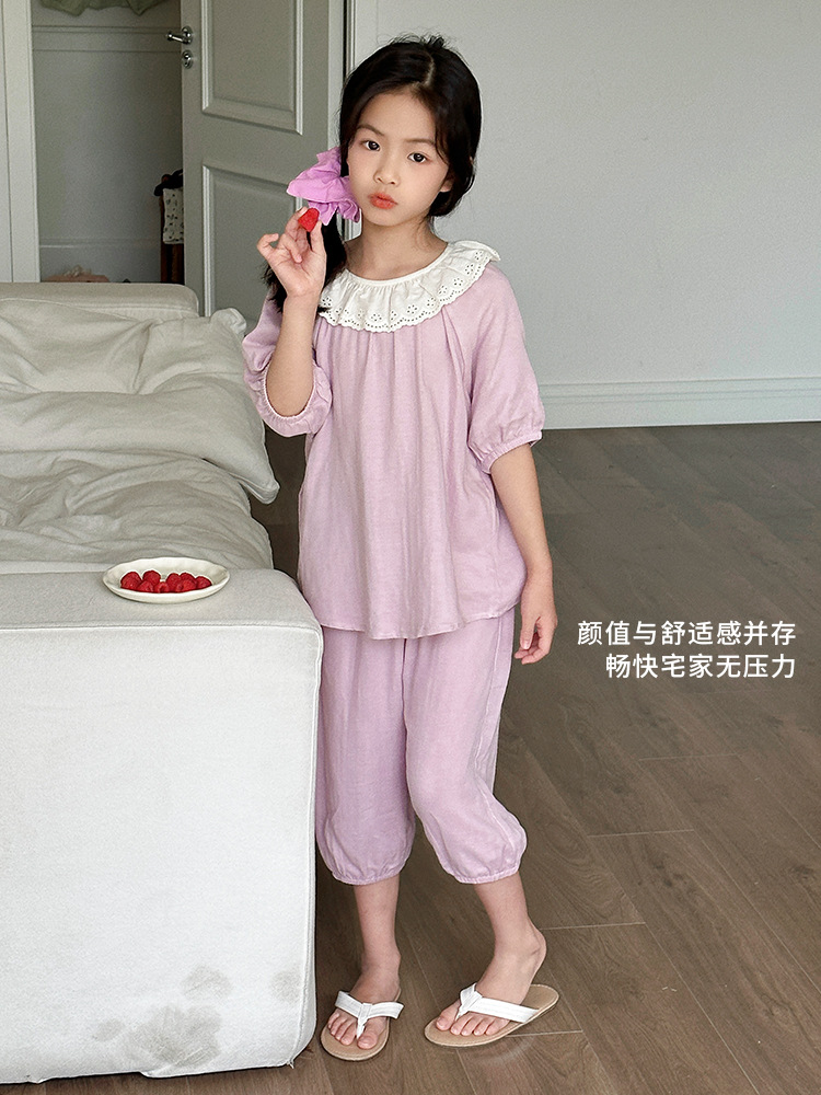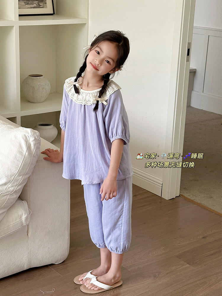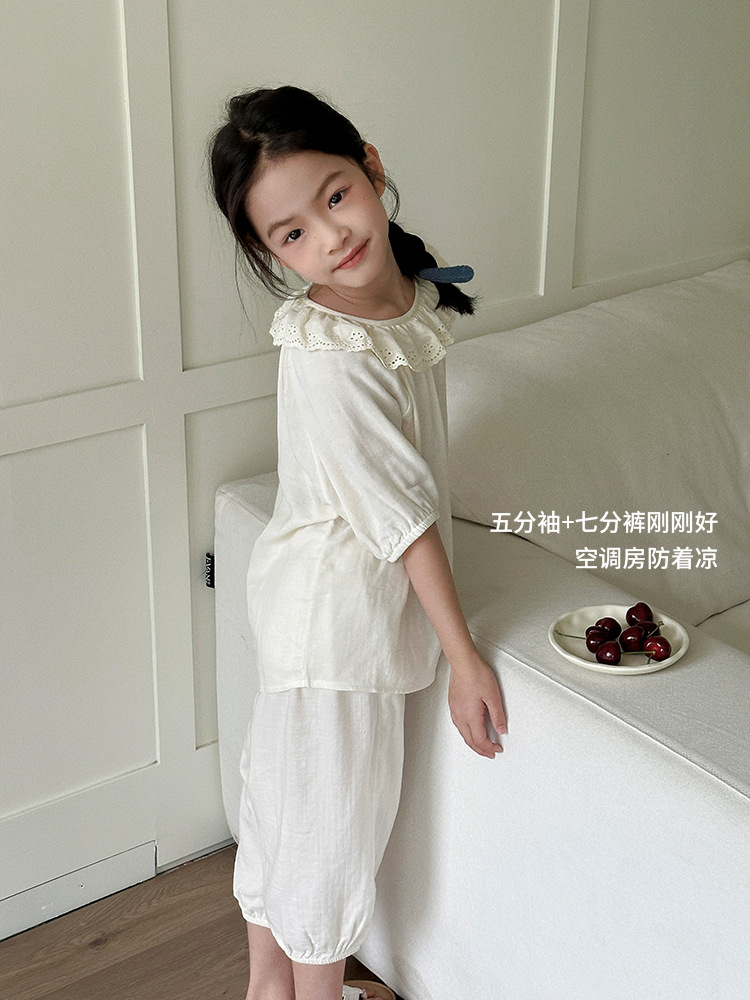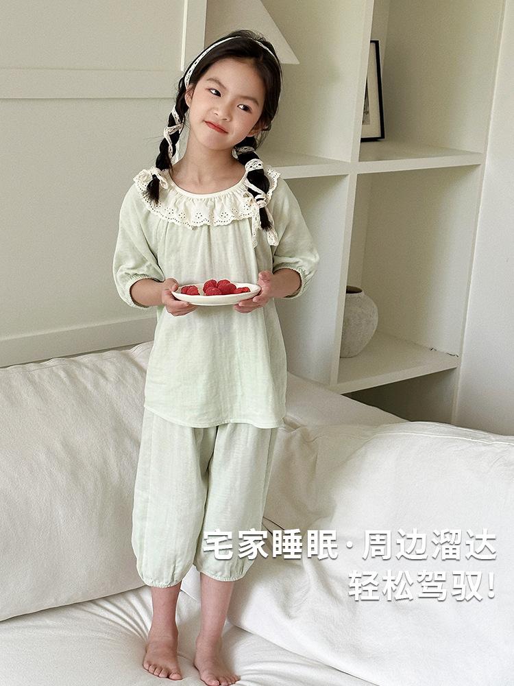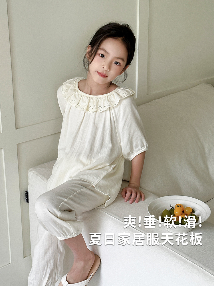 여름 새로운 어린이 가정 옷 소녀의 대나무 면화 얇은 공주 스타일 작은 신선한 면화 잠옷 투피스 양복스토어 가기