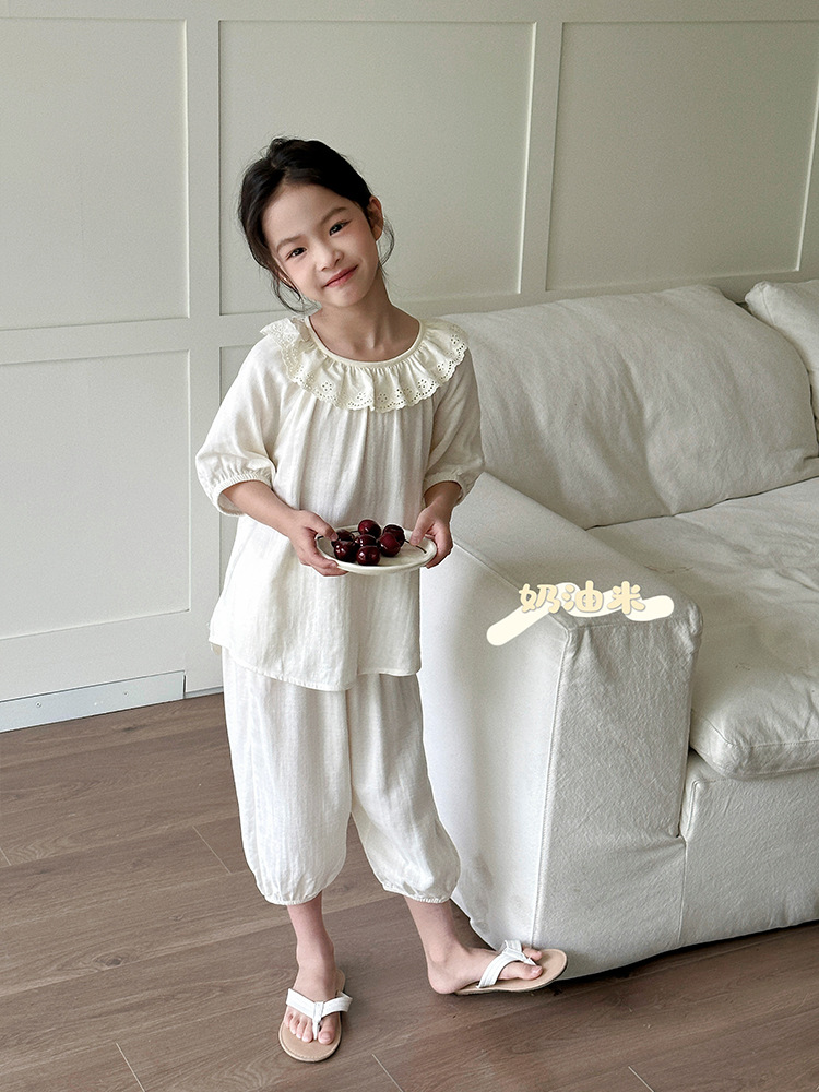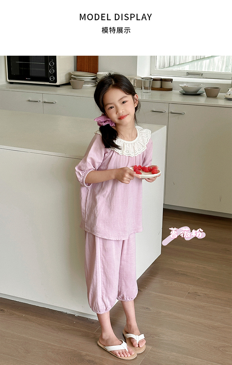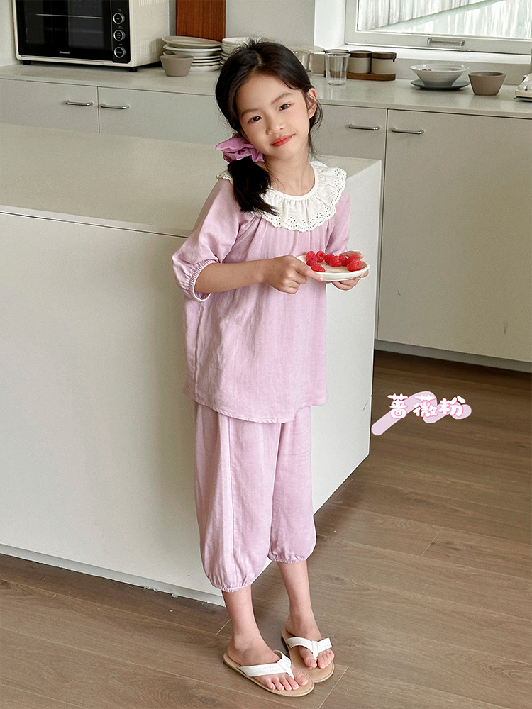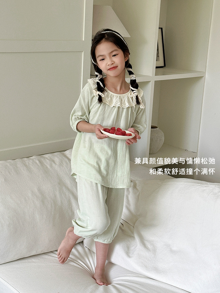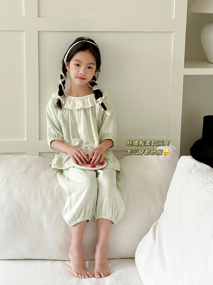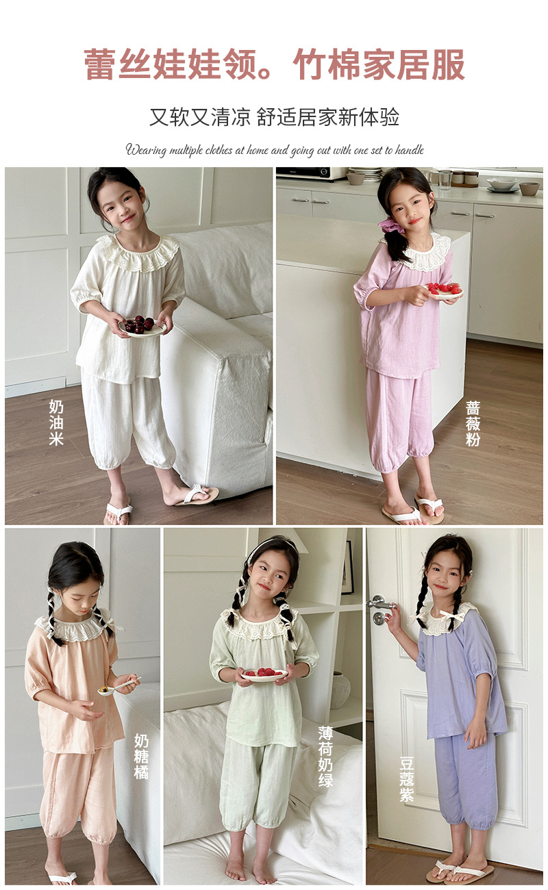 여름 새로운 어린이 가정 옷 소녀의 대나무 면화 얇은 공주 스타일 작은 신선한 면화 잠옷 투피스 양복