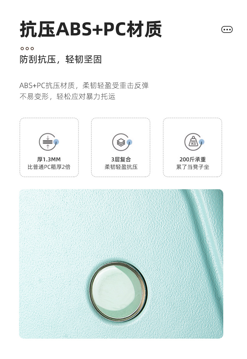 采用ABS PC复合材质 三层复合结构 厚度达2.5mm 柔韧轻盈 受重击反弹不易变形 200斤承重 轻松应对暴力托运 累了可当凳子坐