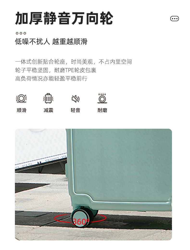 一体式创新贴合轮座 时尚美观不占内里空间 平稳坚固 TPE轮皮包裹 高负荷情况亦能轻盈平稳前行 顺滑减震轻音