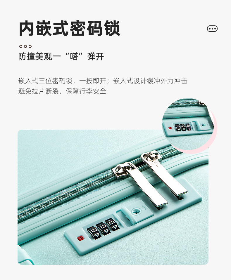 嵌入式三位密码锁 一按即开 嵌入式设计缓冲外力冲击 避免拉片断裂 保障行李 防撞美观