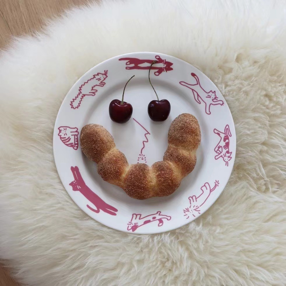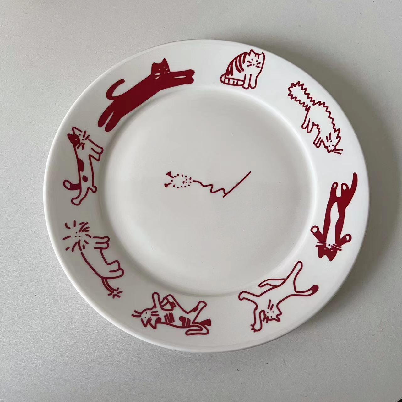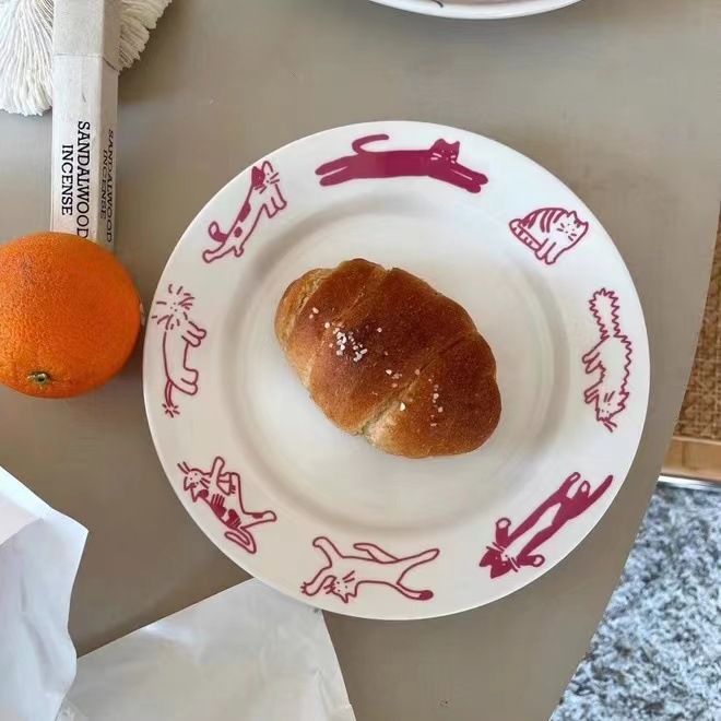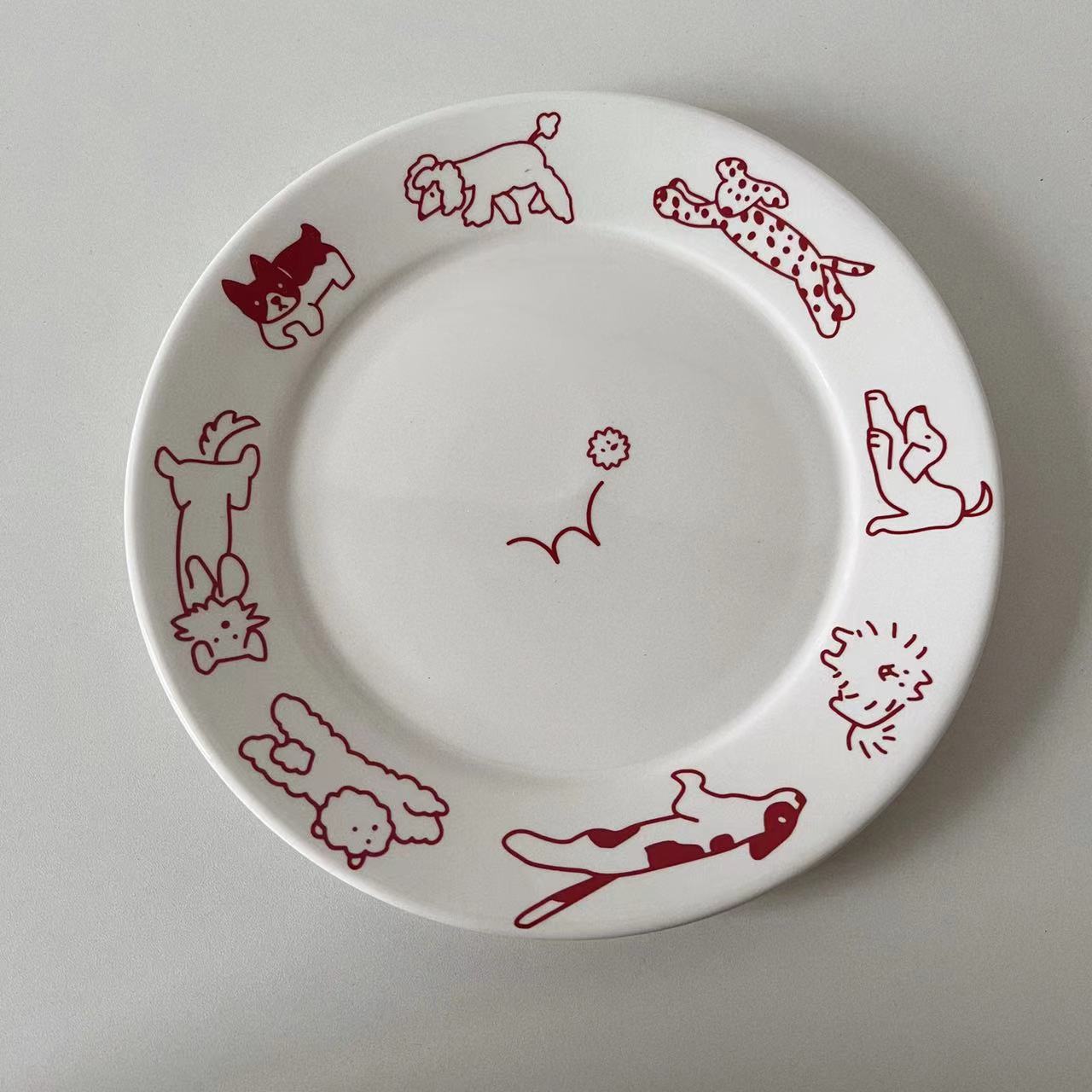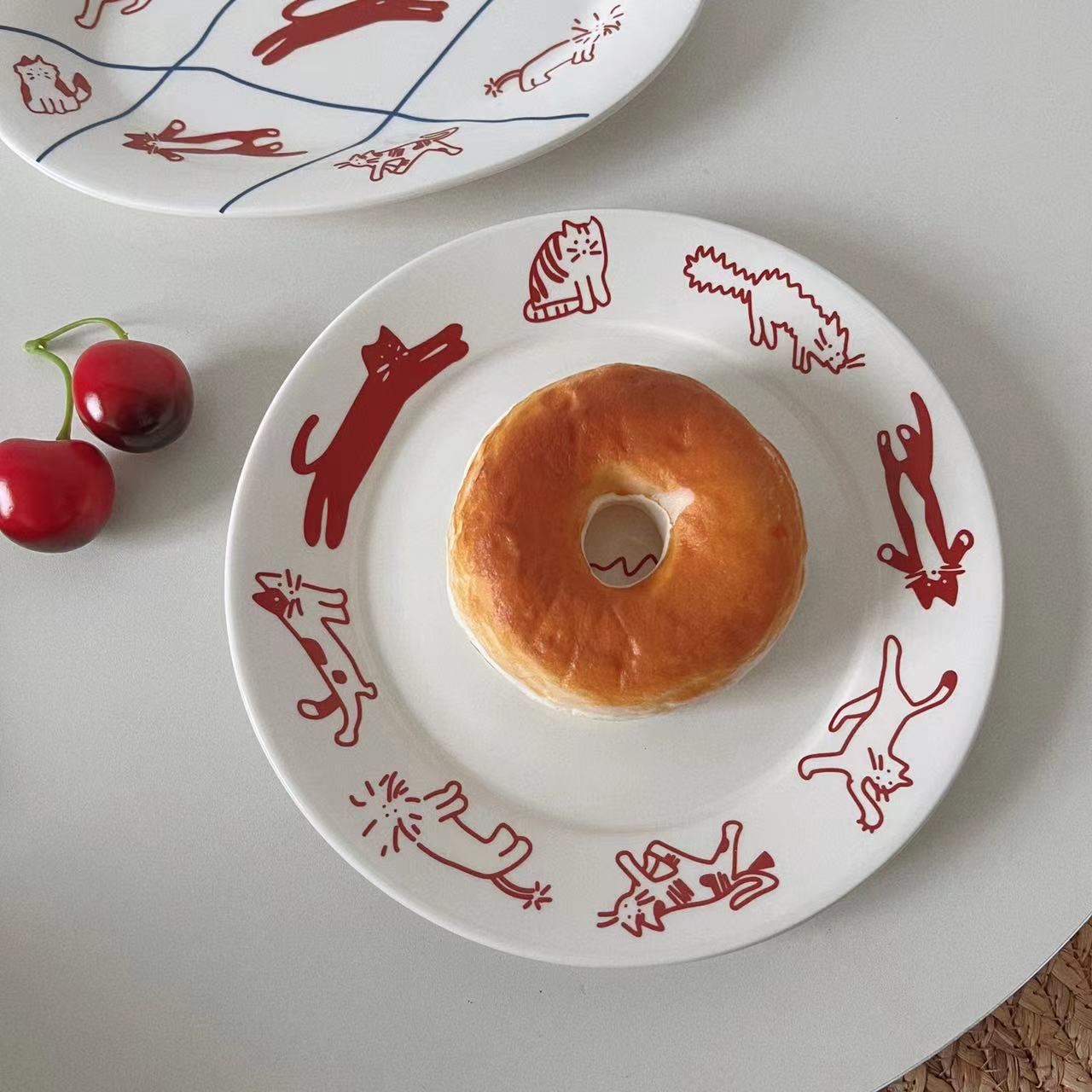 한국 귀여운 만화 고양이 개 세라믹 플레이트 디스크 아침 식사 플레이트 디저트 플레이트