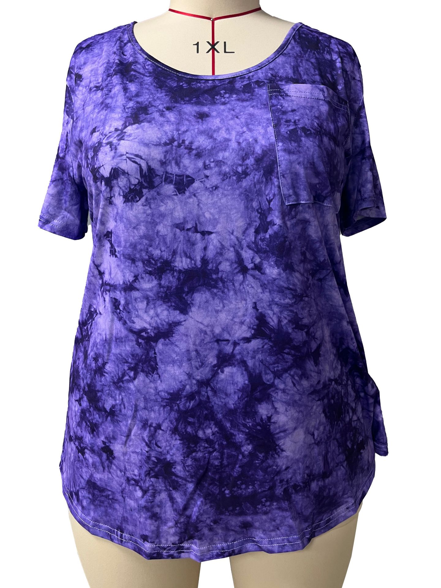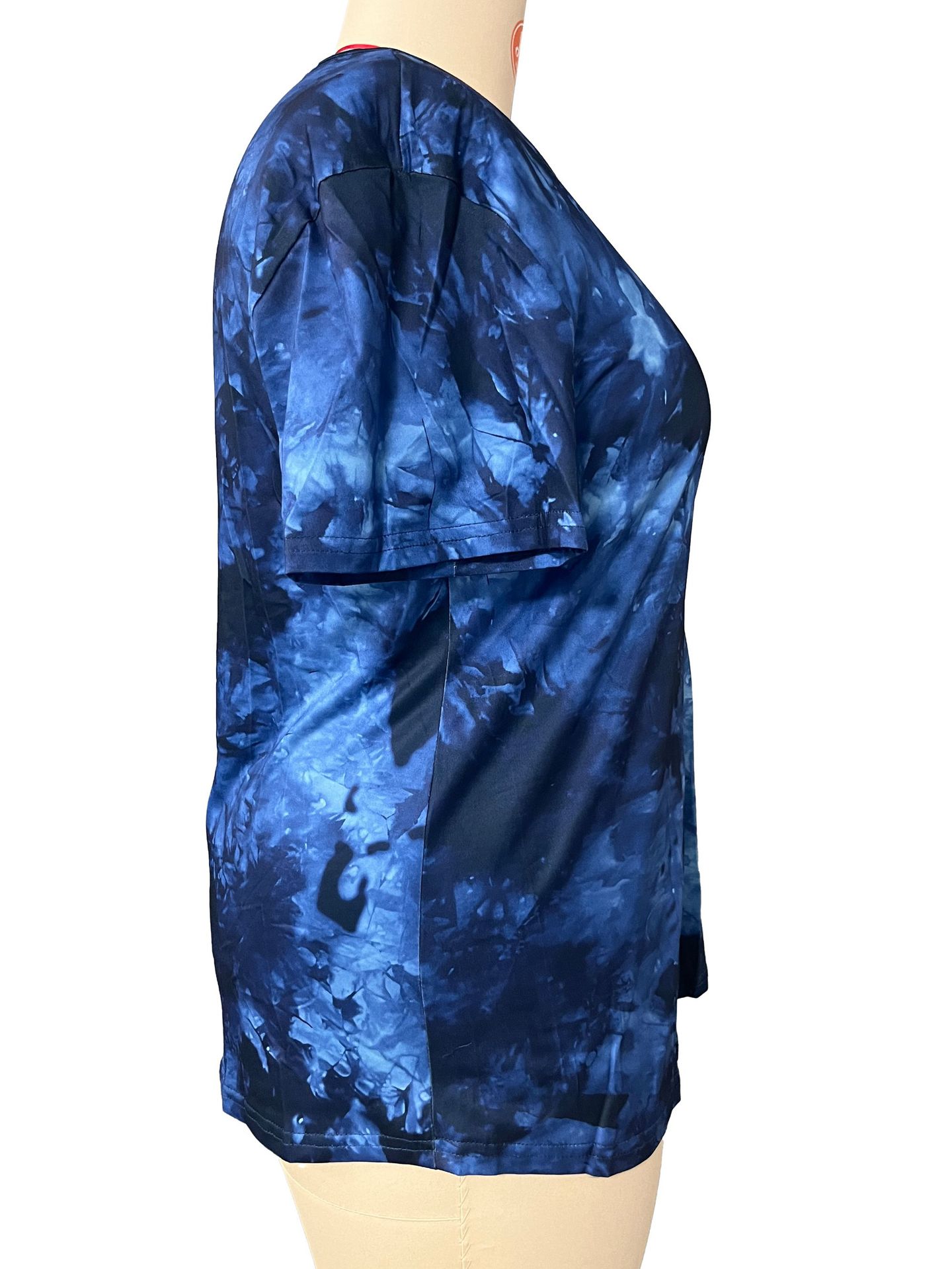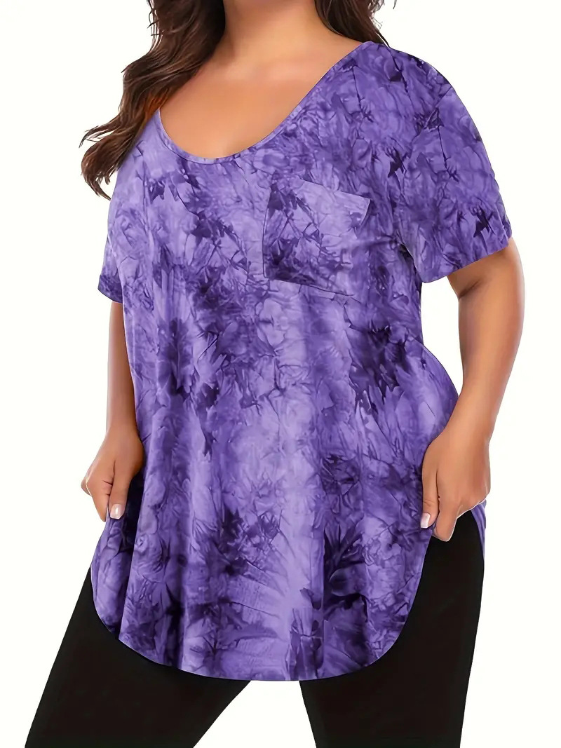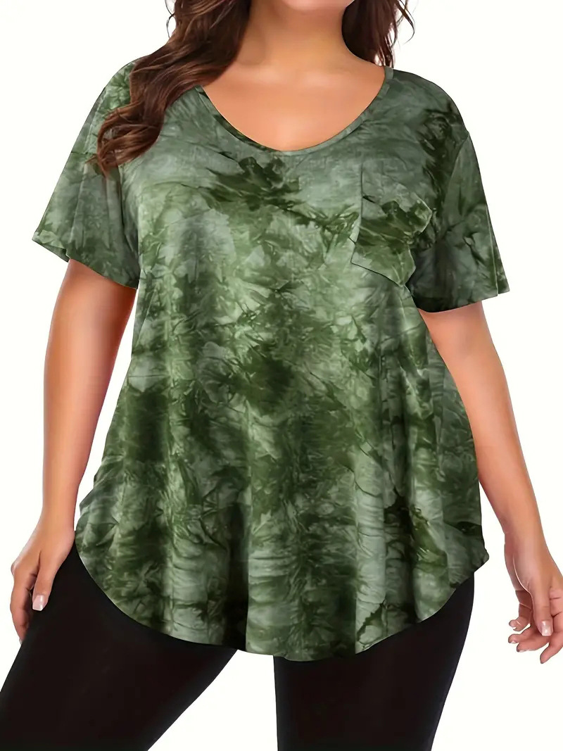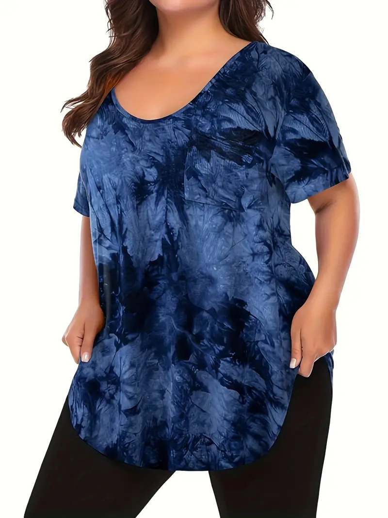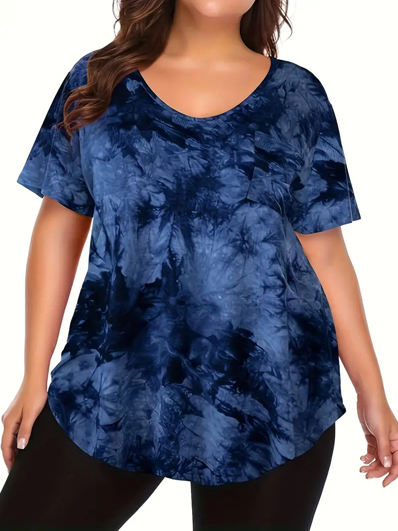 2025 Amazon 크로스보더 여름 패션 V 넥타이 포켓 타이 염색 플러스 사이즈 여성 티셔츠 포켓이 있는 반팔 탑