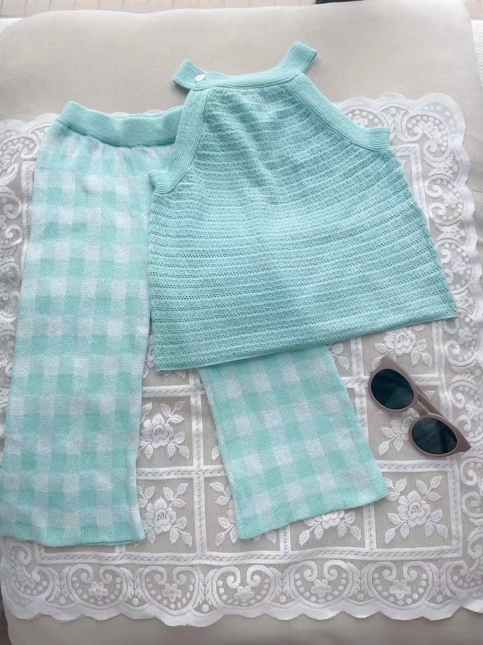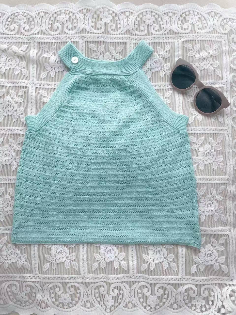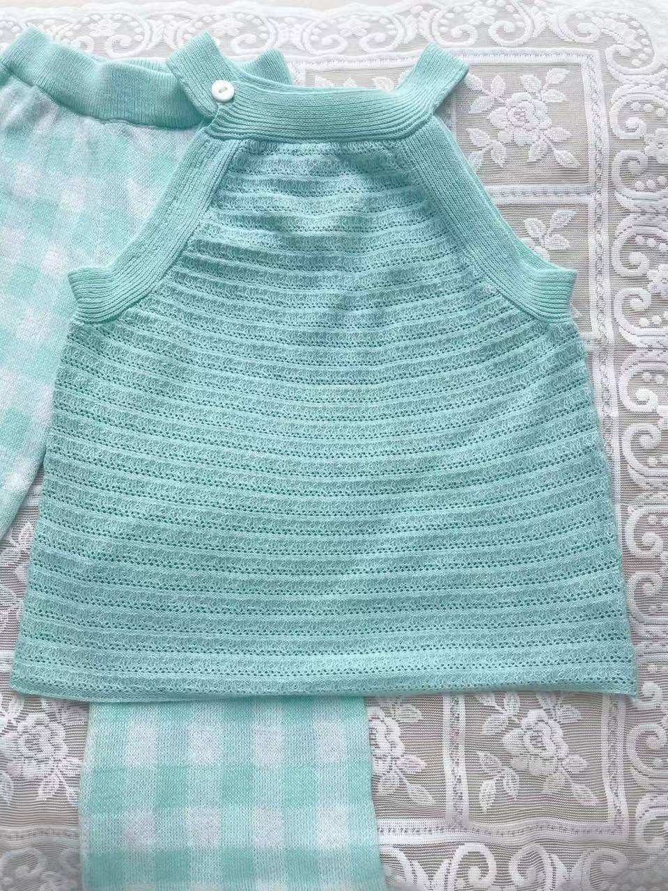소녀 여름 조끼 슬링 블루 카프리 바지 니트 세트 빈 니트 티셔츠 유치원 세트스토어 가기