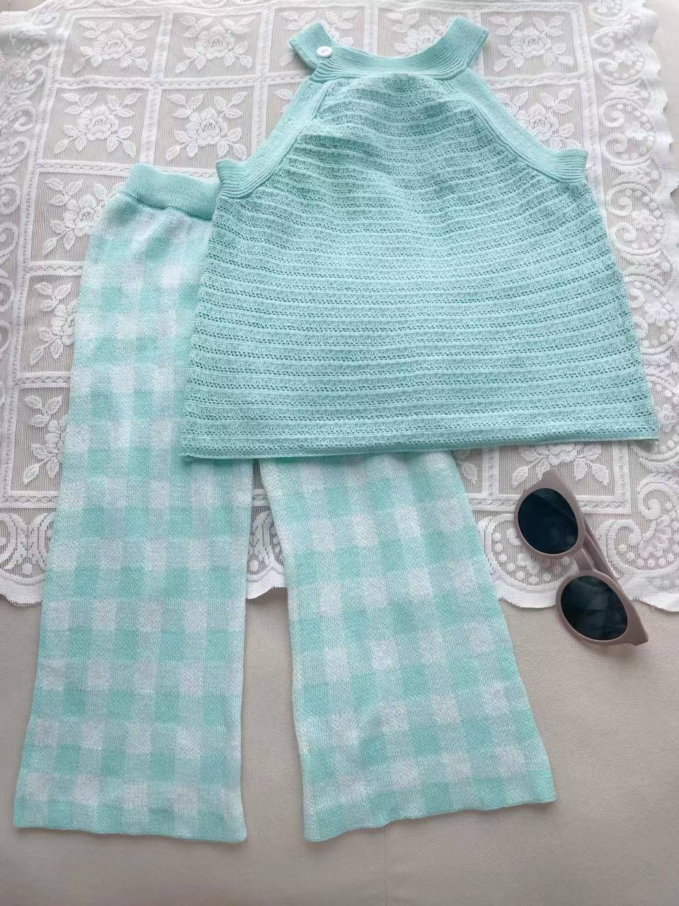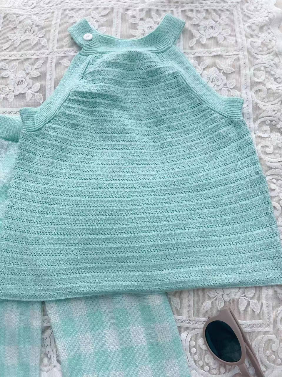 소녀 여름 조끼 슬링 블루 카프리 바지 니트 세트 빈 니트 티셔츠 유치원 세트