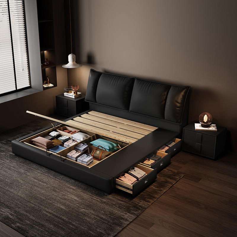 이탈리아 미니멀리스트 가죽 침대 더블 1.8m 다기능 인터넷 인기있는 스토리지 소프트 가방 침대 마스터 침실 가죽 웨딩 침대 조명 럭셔리