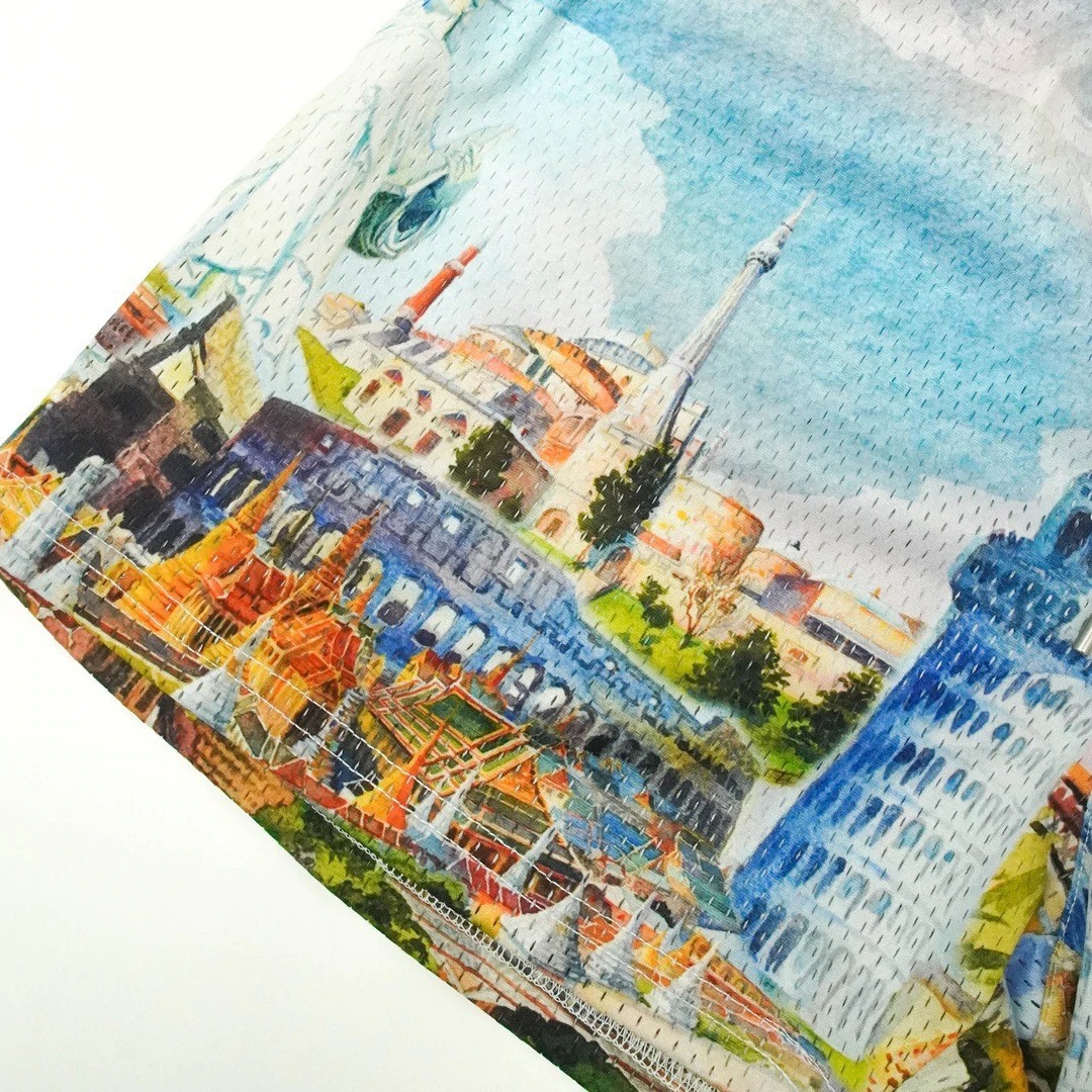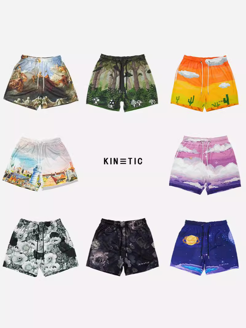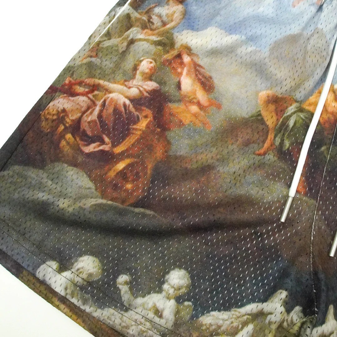 미국 스타일의 트렌디 한 브랜드 영화 캐주얼 스포츠 반바지 피트니스 메쉬 분기 바지 디지털 방식으로 인쇄 통기성 느슨한 반바지