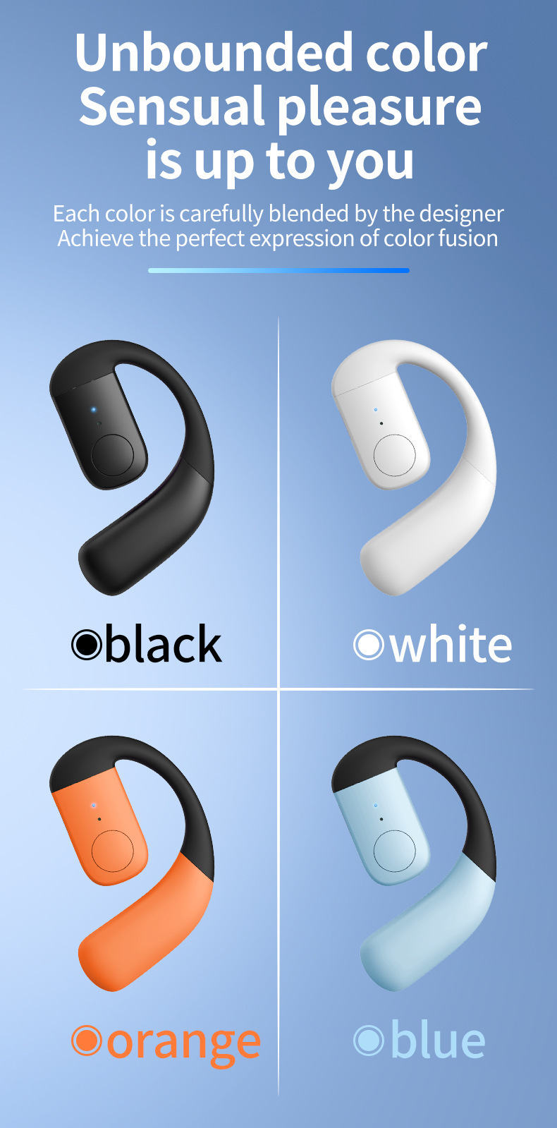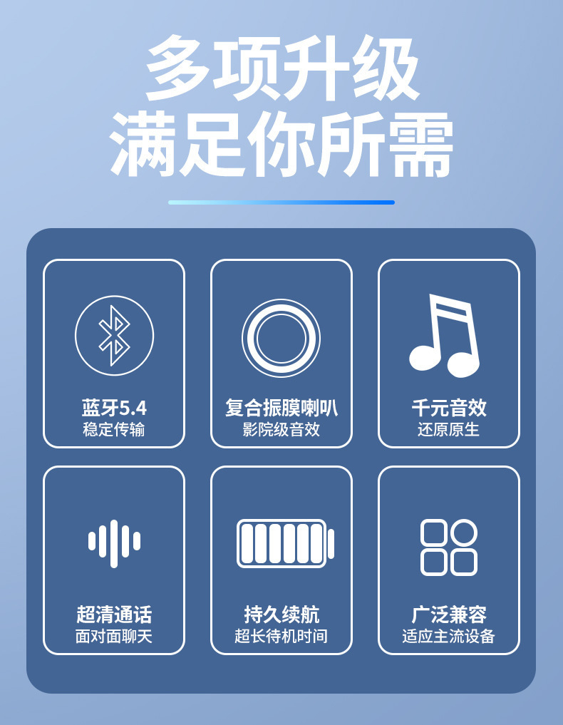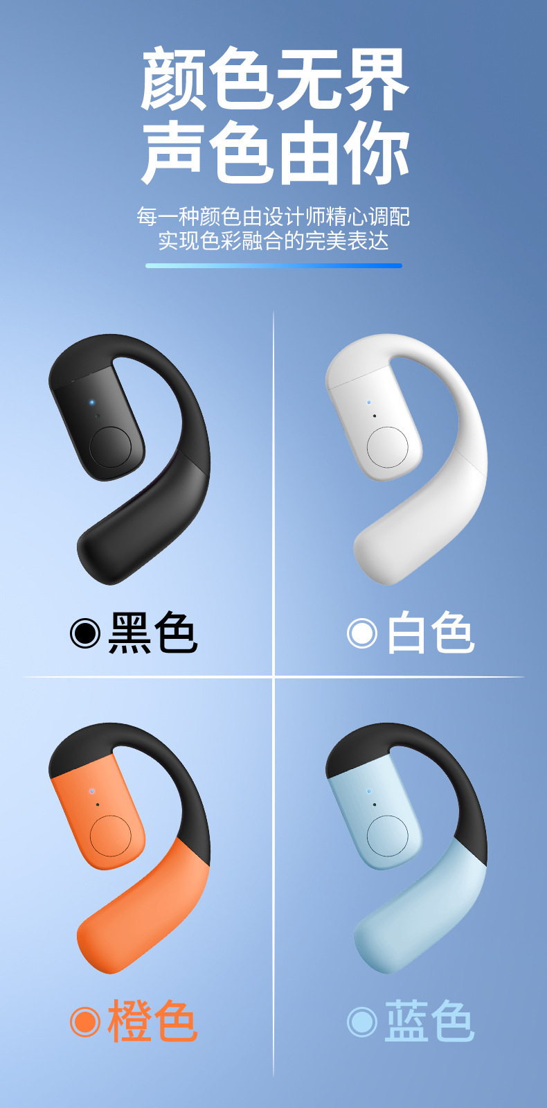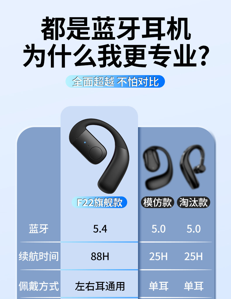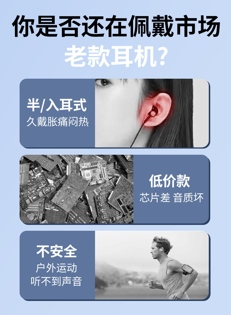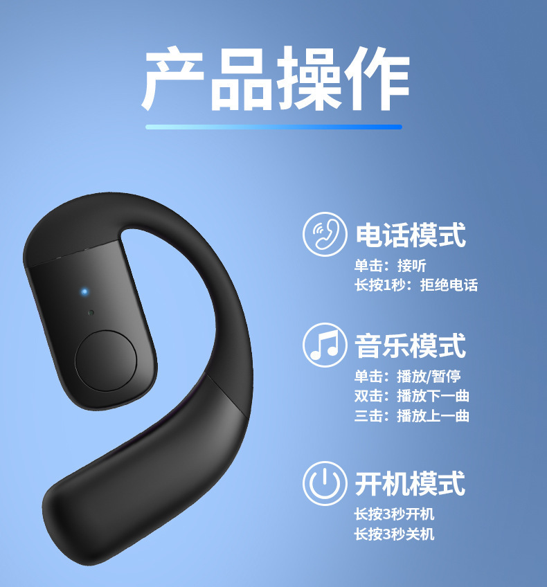 产品卖点:不入耳久戴不痛,左右耳可180°调节,超长续航可以连续听歌30小时