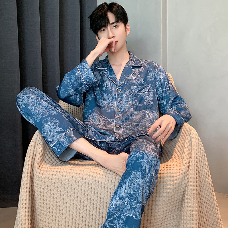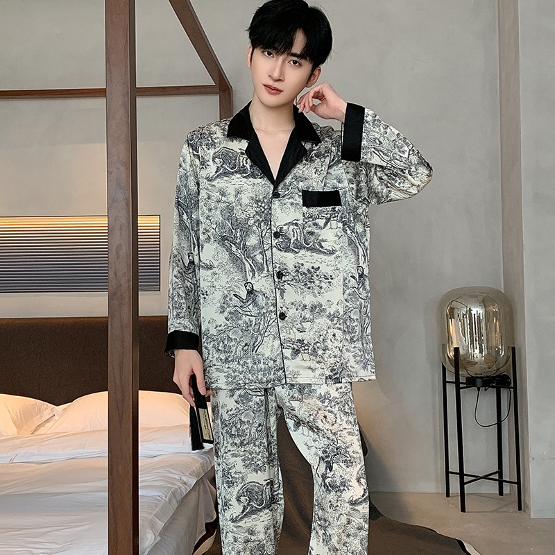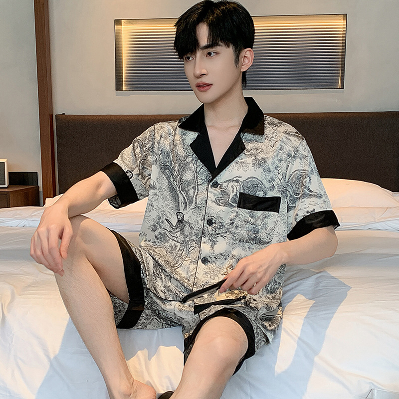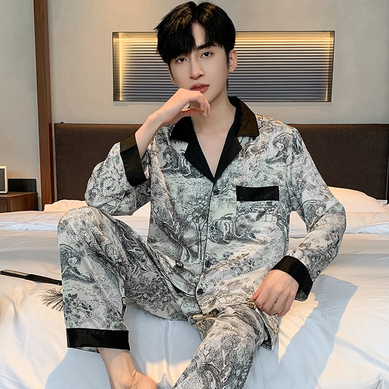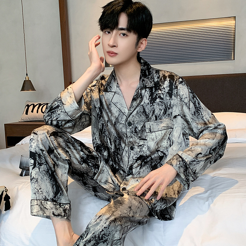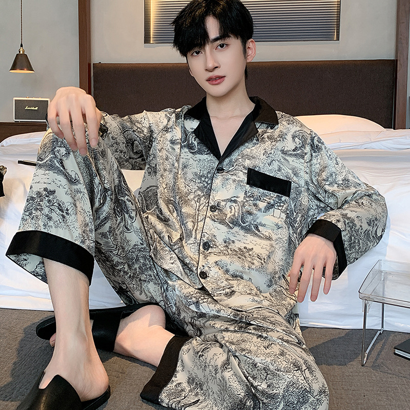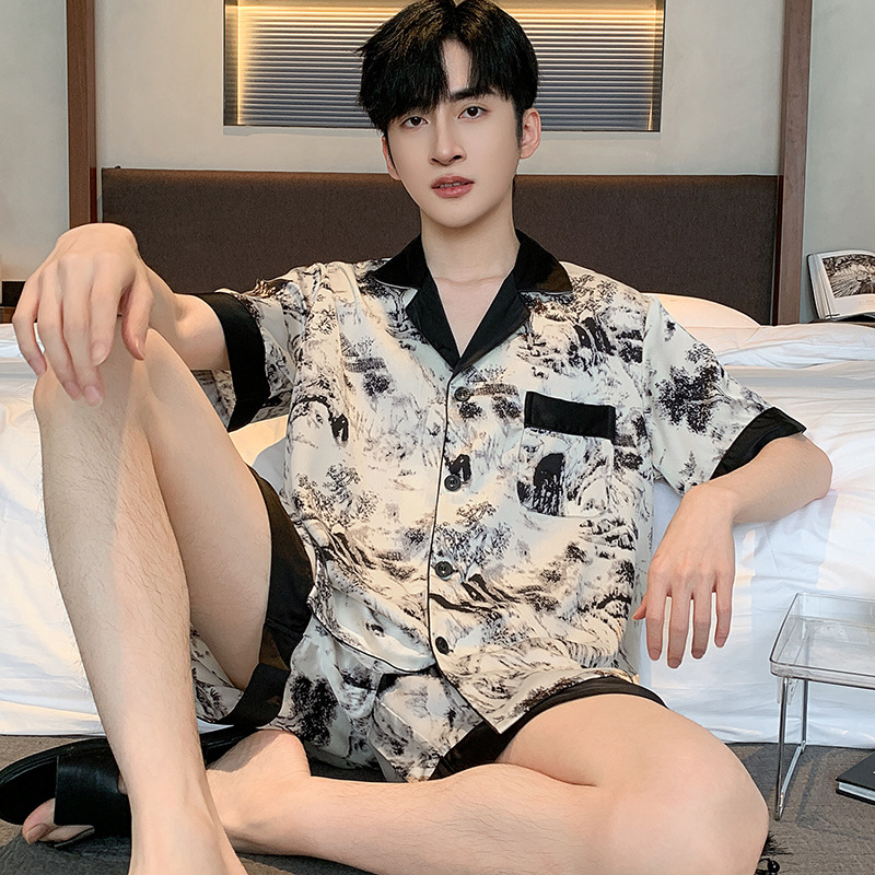 패션 아이스 실크 잠옷 남자의 봄과 가을 긴 짧은 소매 잉크 캐주얼 모조 실크 홈 의류 세트 중국 스타일 책