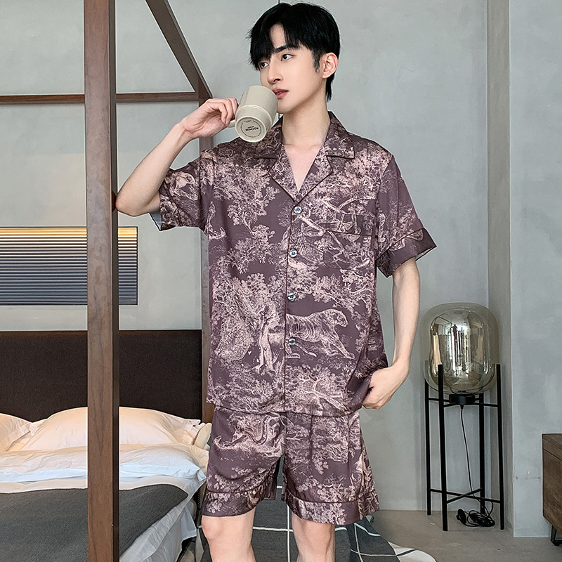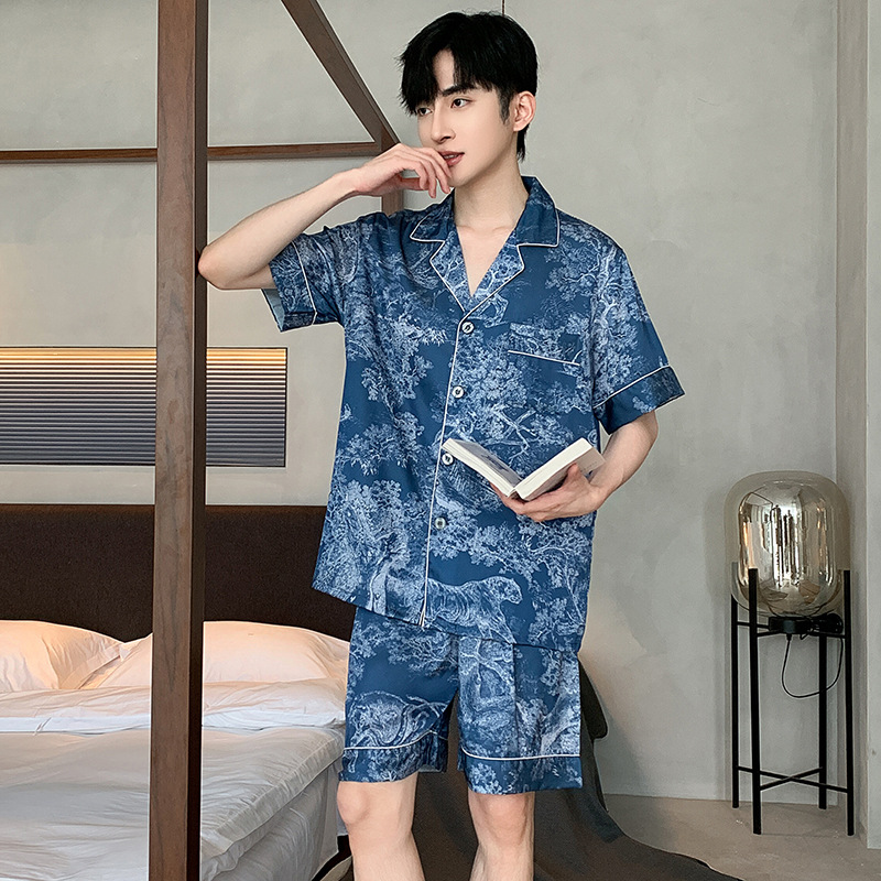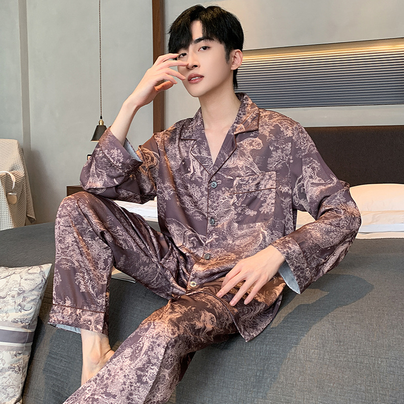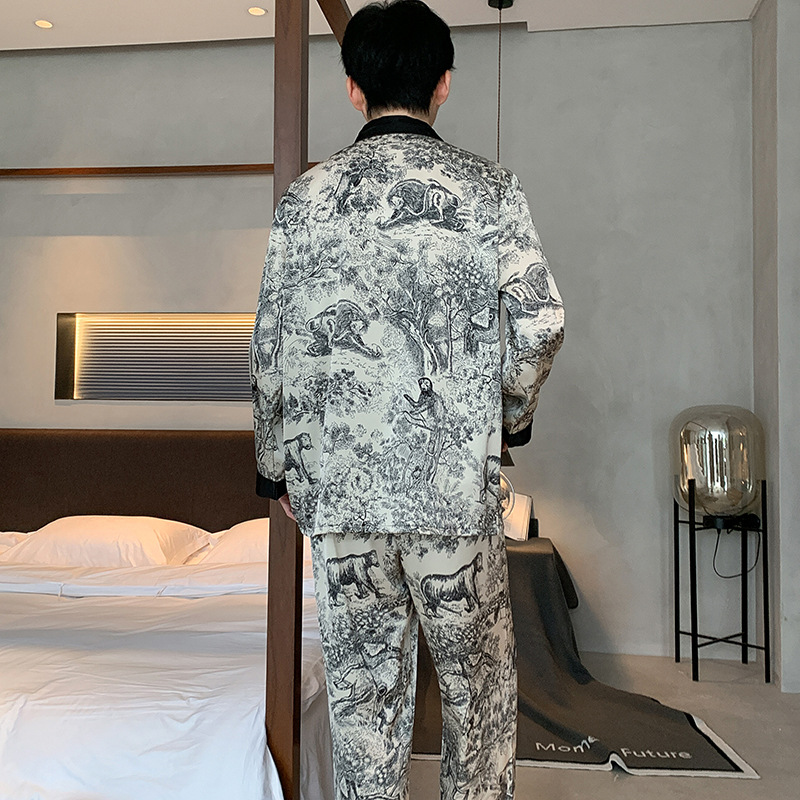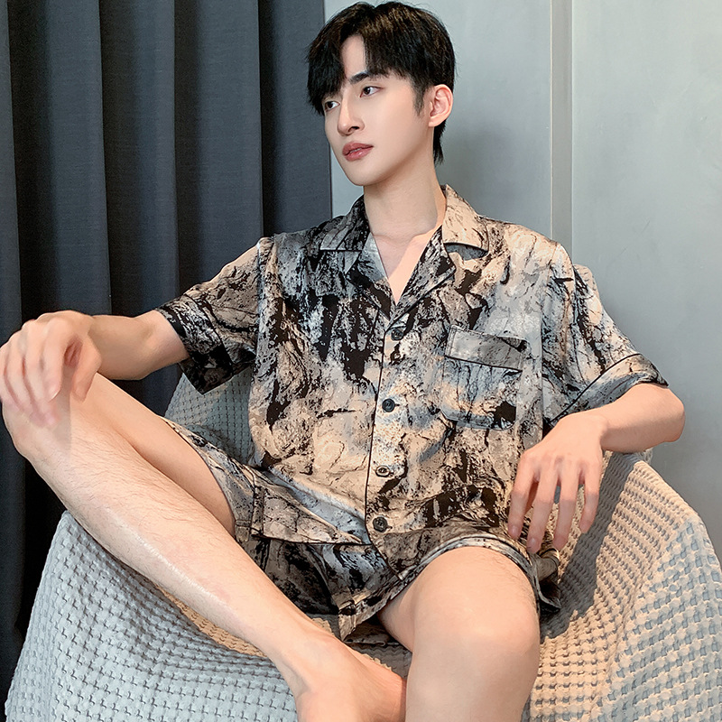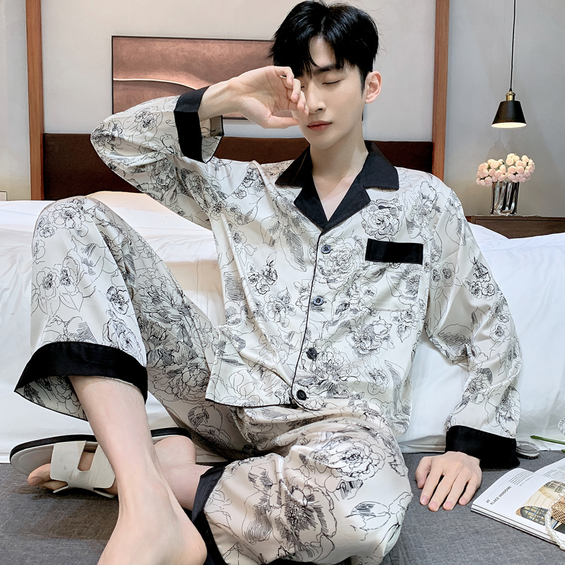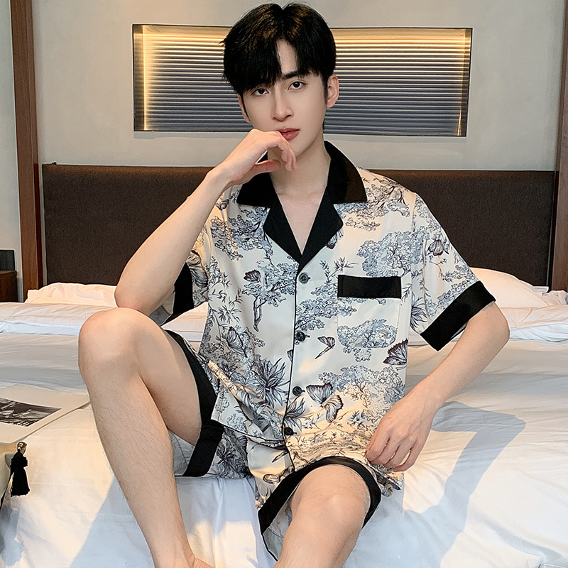 패션 아이스 실크 잠옷 남자의 봄과 가을 긴 짧은 소매 잉크 캐주얼 모조 실크 홈 의류 세트 중국 스타일 책