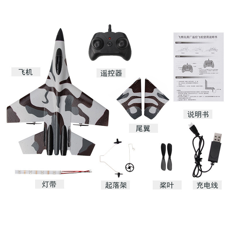 产品明细:飞机*1个,遥控器*1个,锂电池*1个,灯带*1对,起落架*1套,备用螺旋桨*1对,USB充电器*1个,中英文说明书*1本。