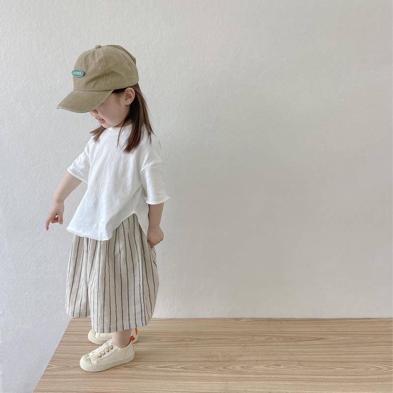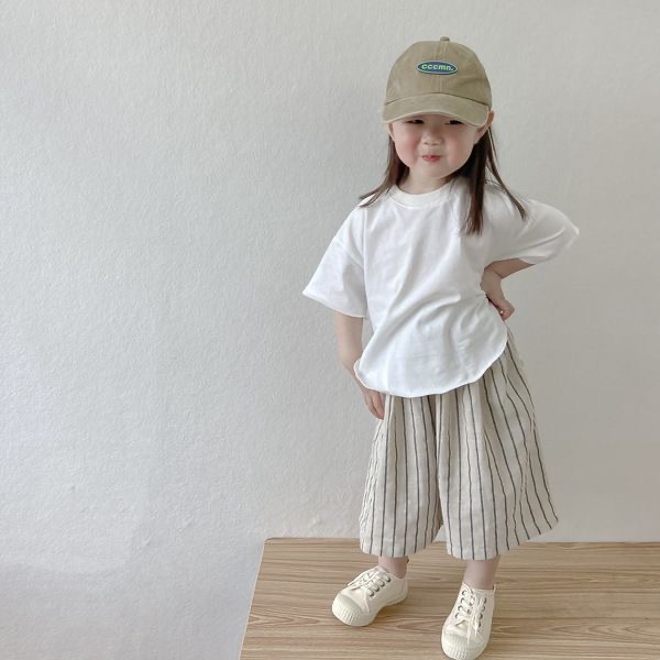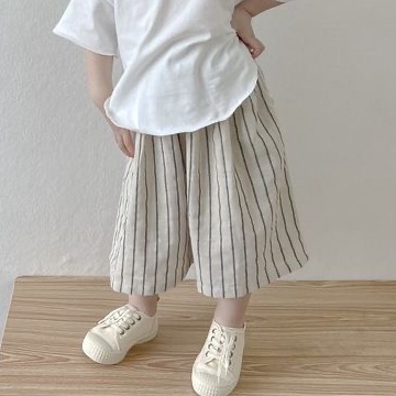 24 새로운 소녀 일본면 느슨한 티셔츠 자른 바지 캐주얼 바지 스트라이프 넓은 다리 바지 여름 얇은 세트스토어 가기