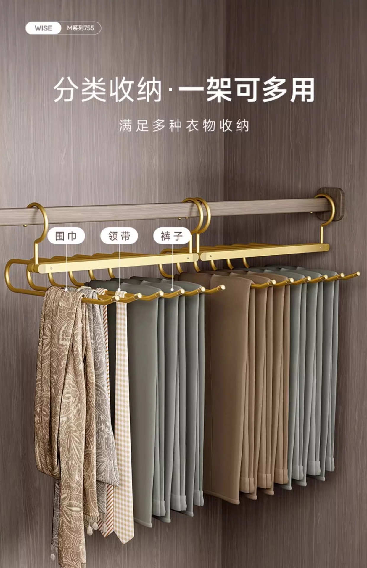 The multifunctional pants rack helps you organize your pants more efficiently and saves space in your closet. It is a 6-tier trouser rack with two racks for 12 pairs of pants at the same time, suitable for slacks,jeans,shorts,scarves,towels,etc. It helps you keep your closet tidy!