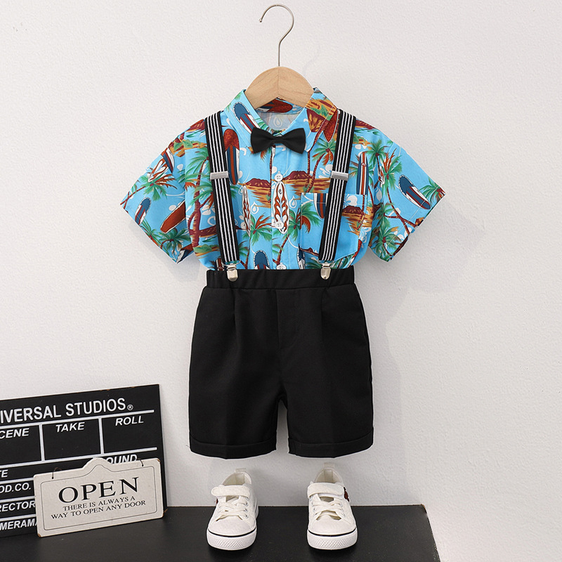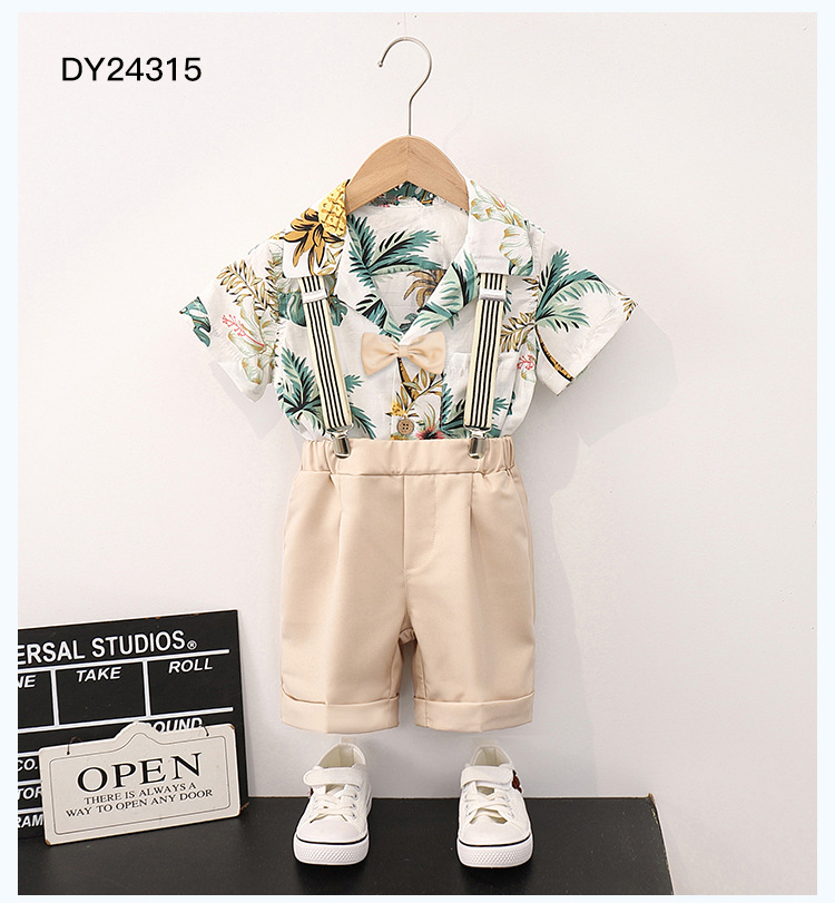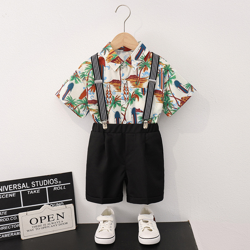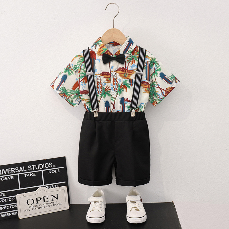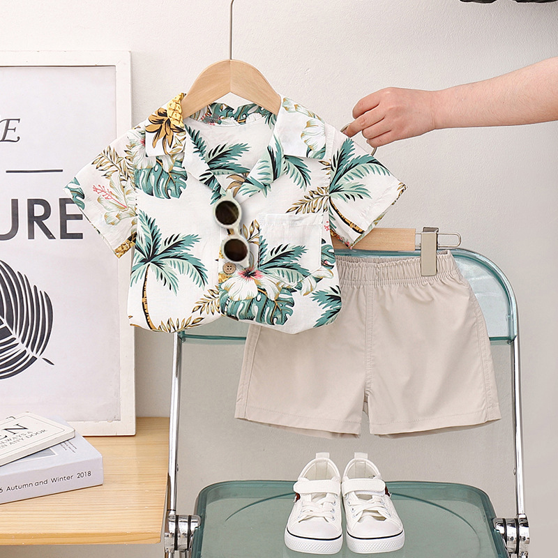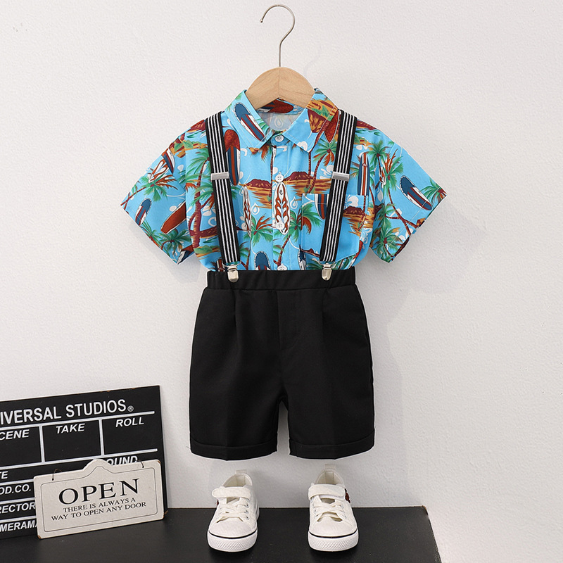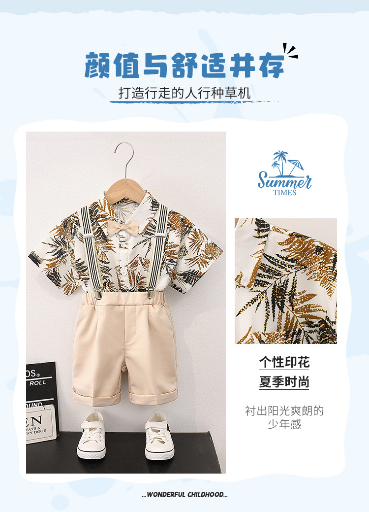 소년 캐주얼 셔츠 여름 새로운 어린이 파이 슈아이 홍콩 스타일 꽃 셔츠 하와이 휴가 스타일 세트 벨트 바지