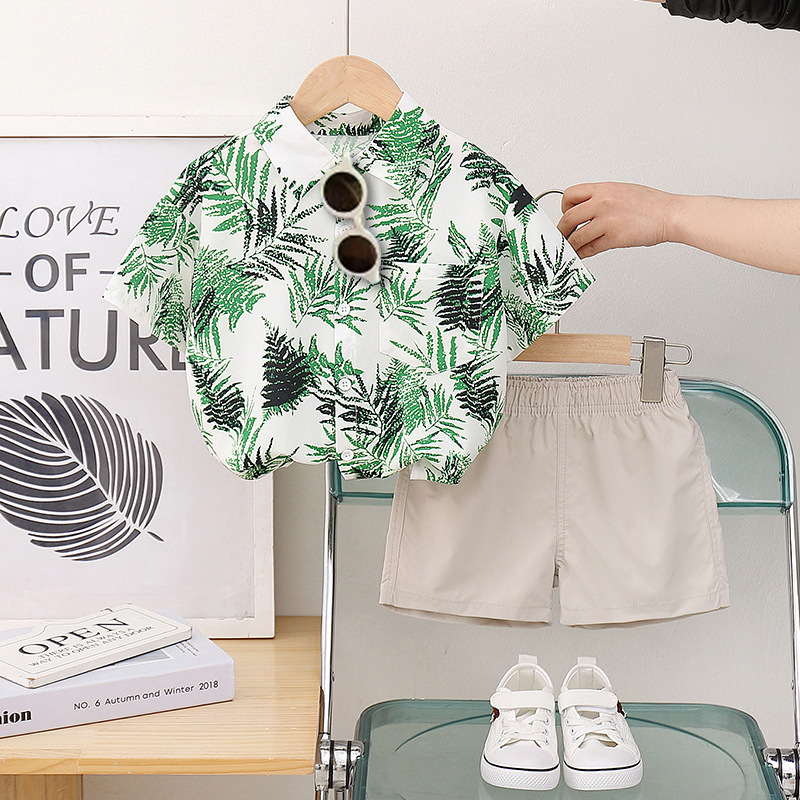 • 녹색 잎 셔츠 카키 반바지 3 세트 [DY24332]