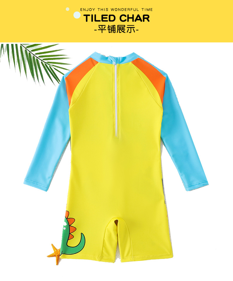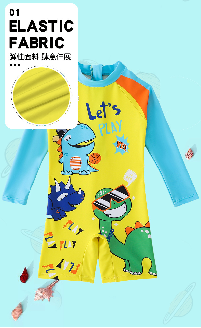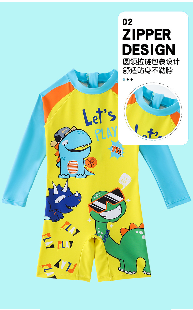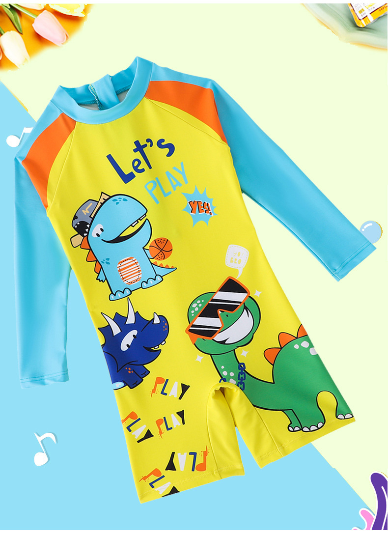 어린이 수영복 소년 긴팔 점프수트 2025 신상 노란색 공룡 프린트 지퍼 수영복 소년 수영복