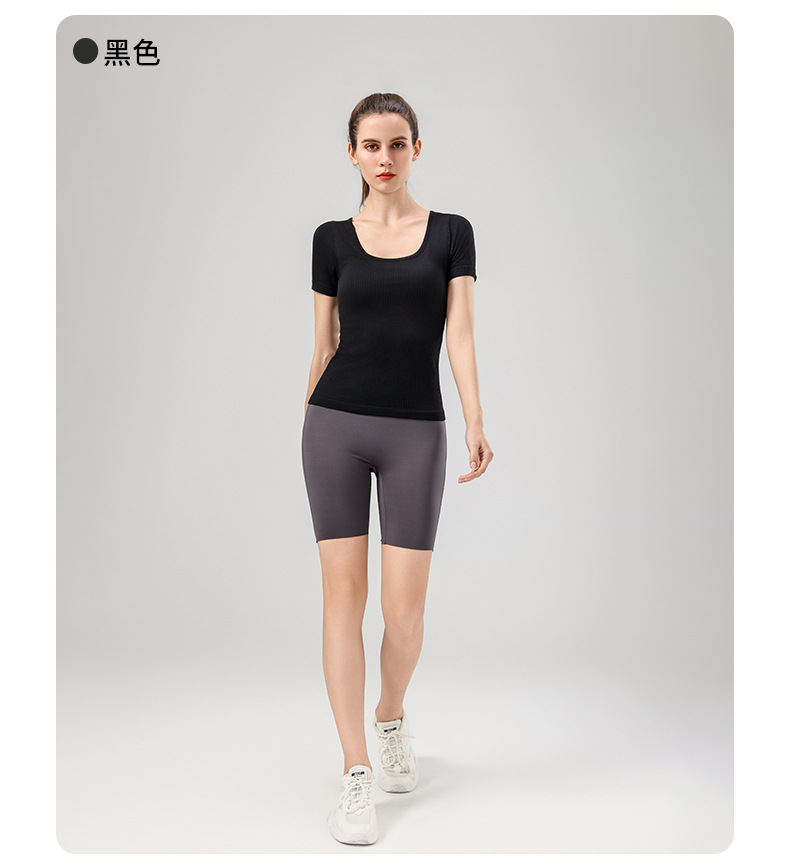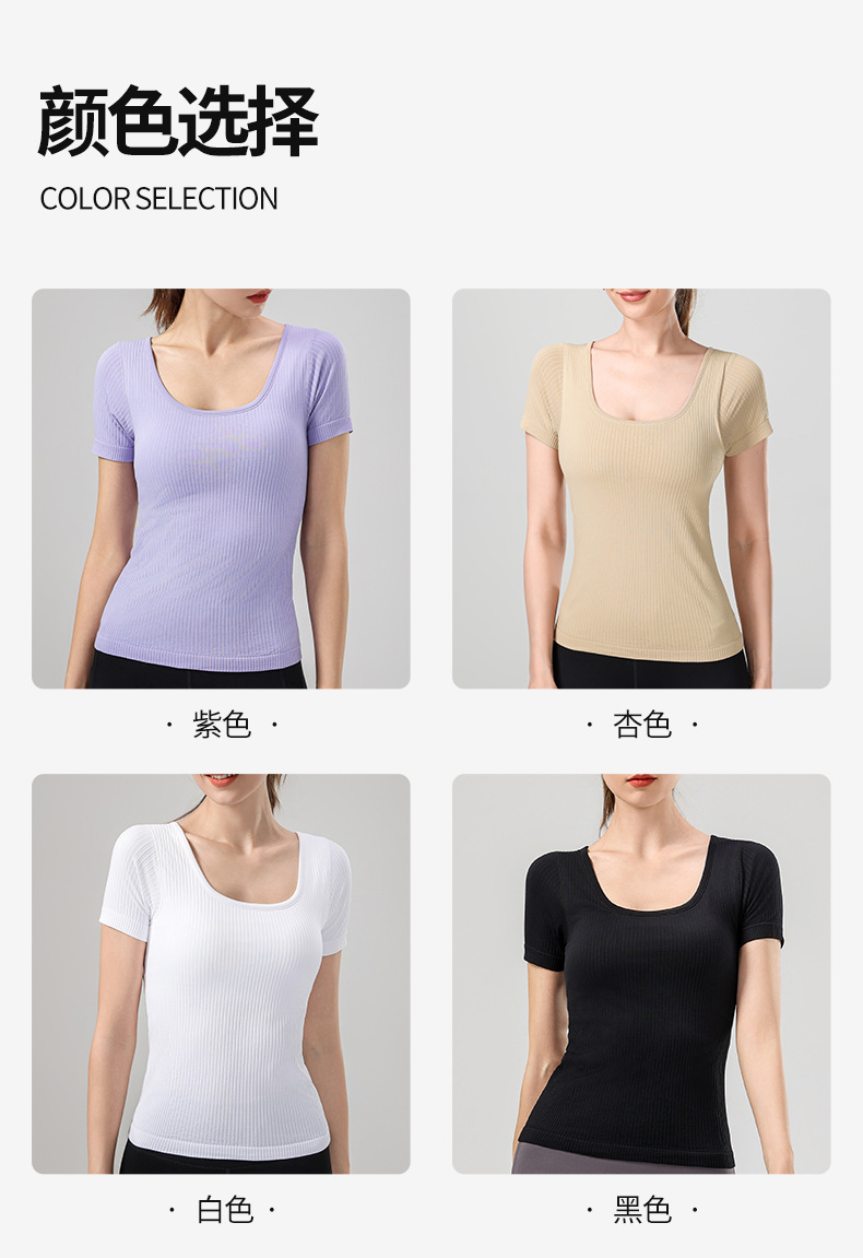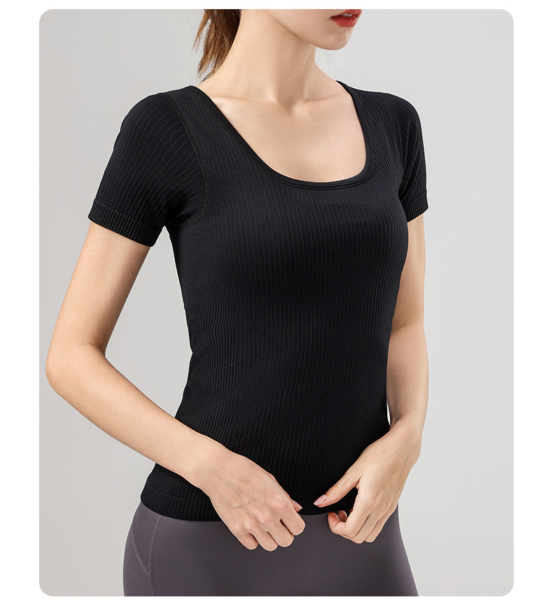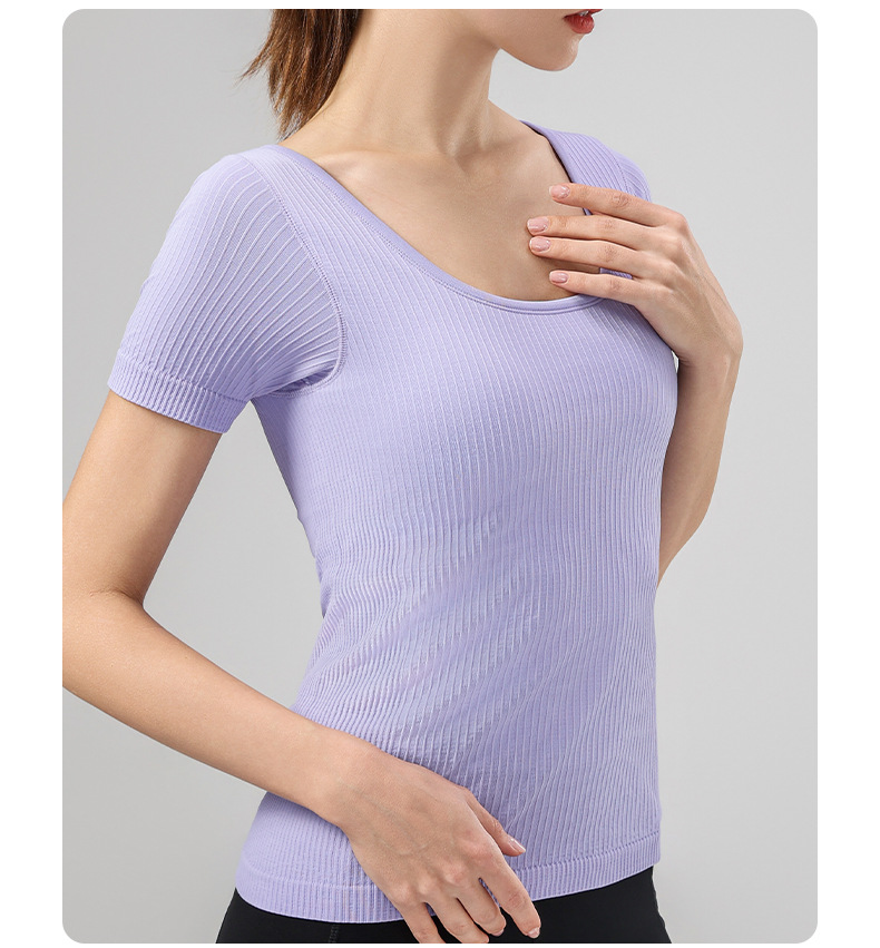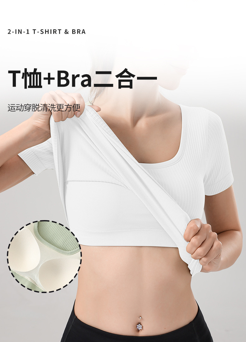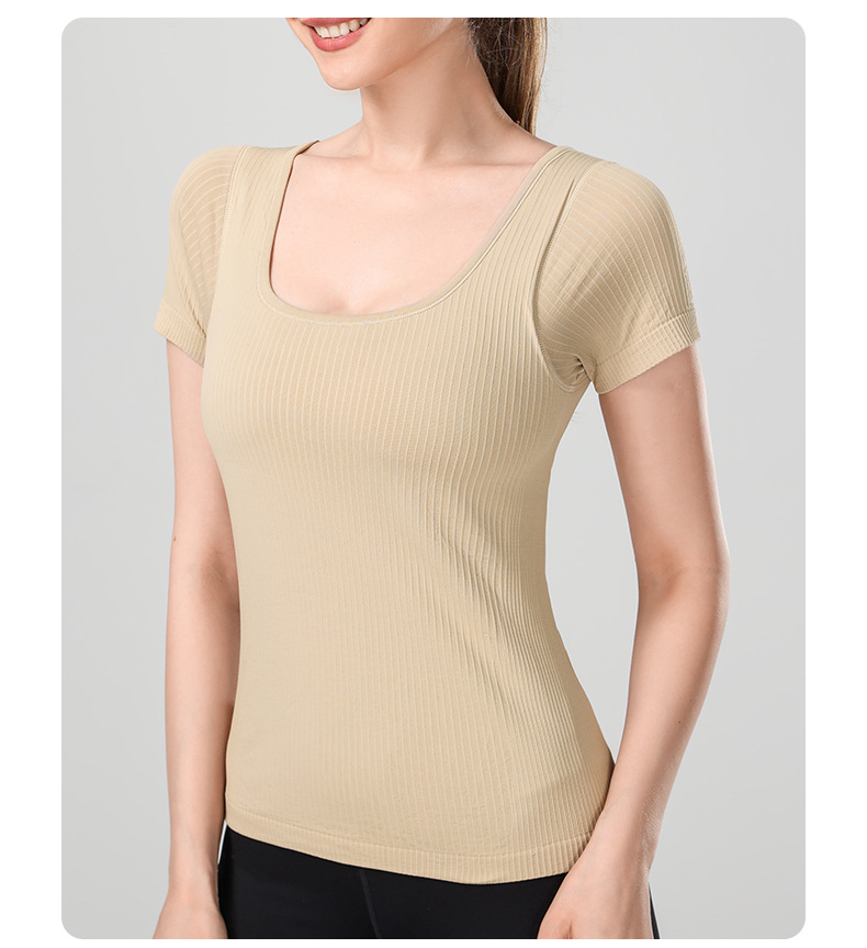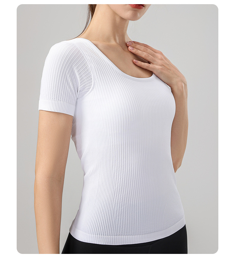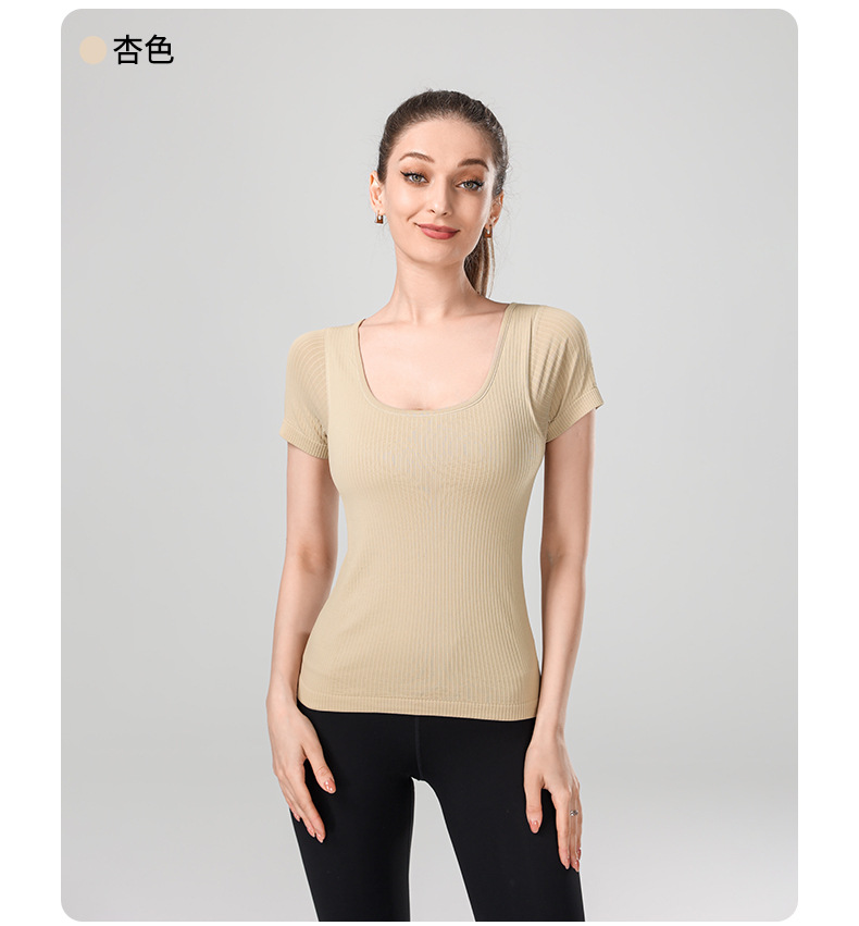 니트 골지 요가복 여성용 반팔 일체형 컵 편안한 고탄성 스포츠 티셔츠 여성용 속건성 피트니스 상의