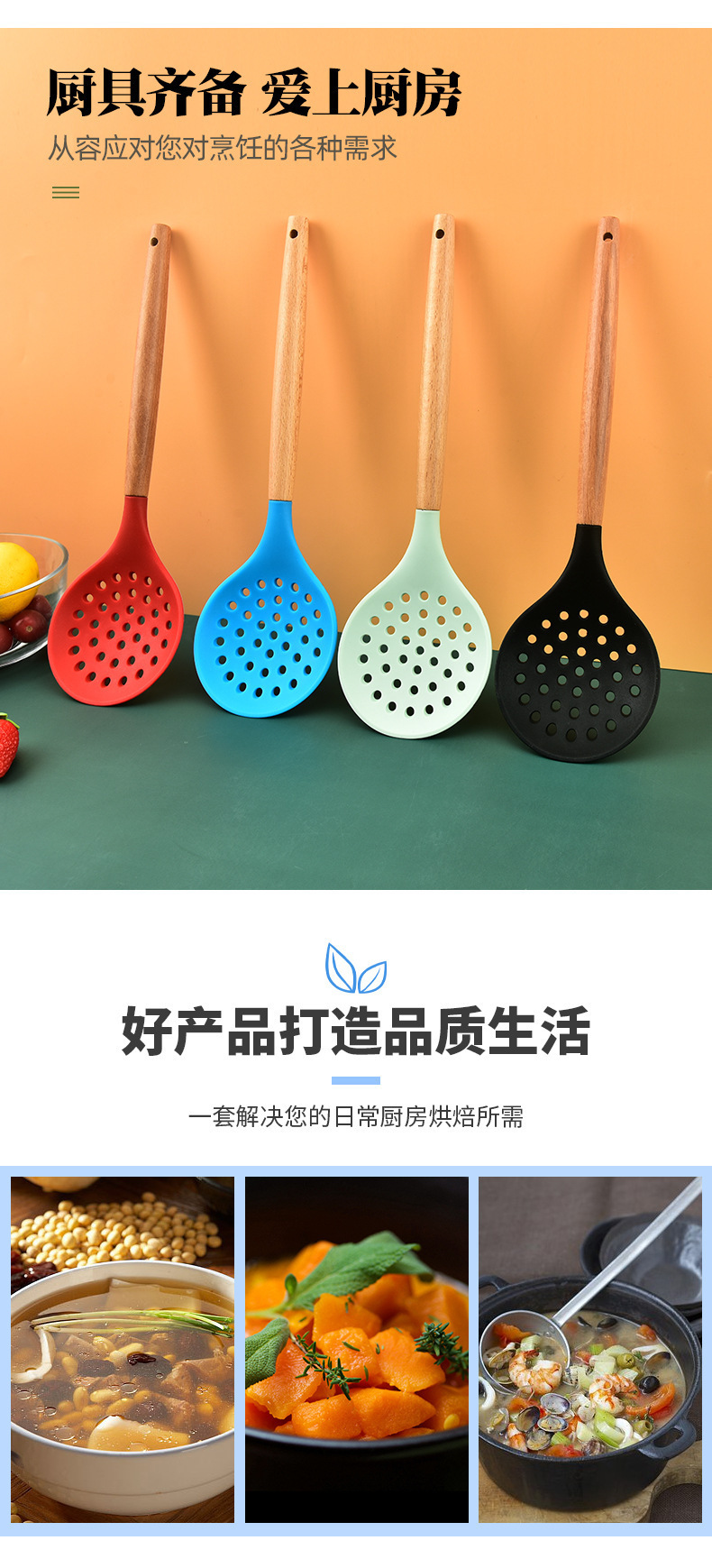 공장 도매 실리콘 울타리 나무 손잡이 소쿠리 가정용 냄비 숟가락 필터 수프 슬래그 스푼 주방 도구