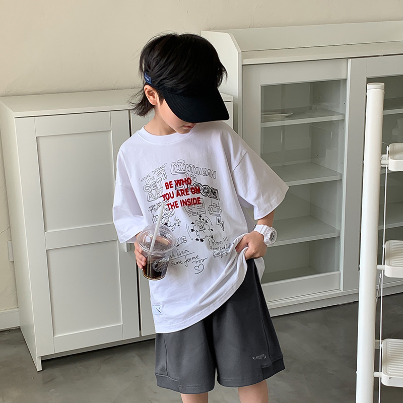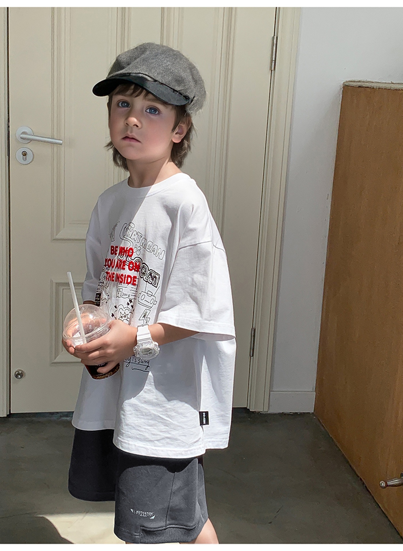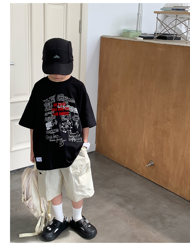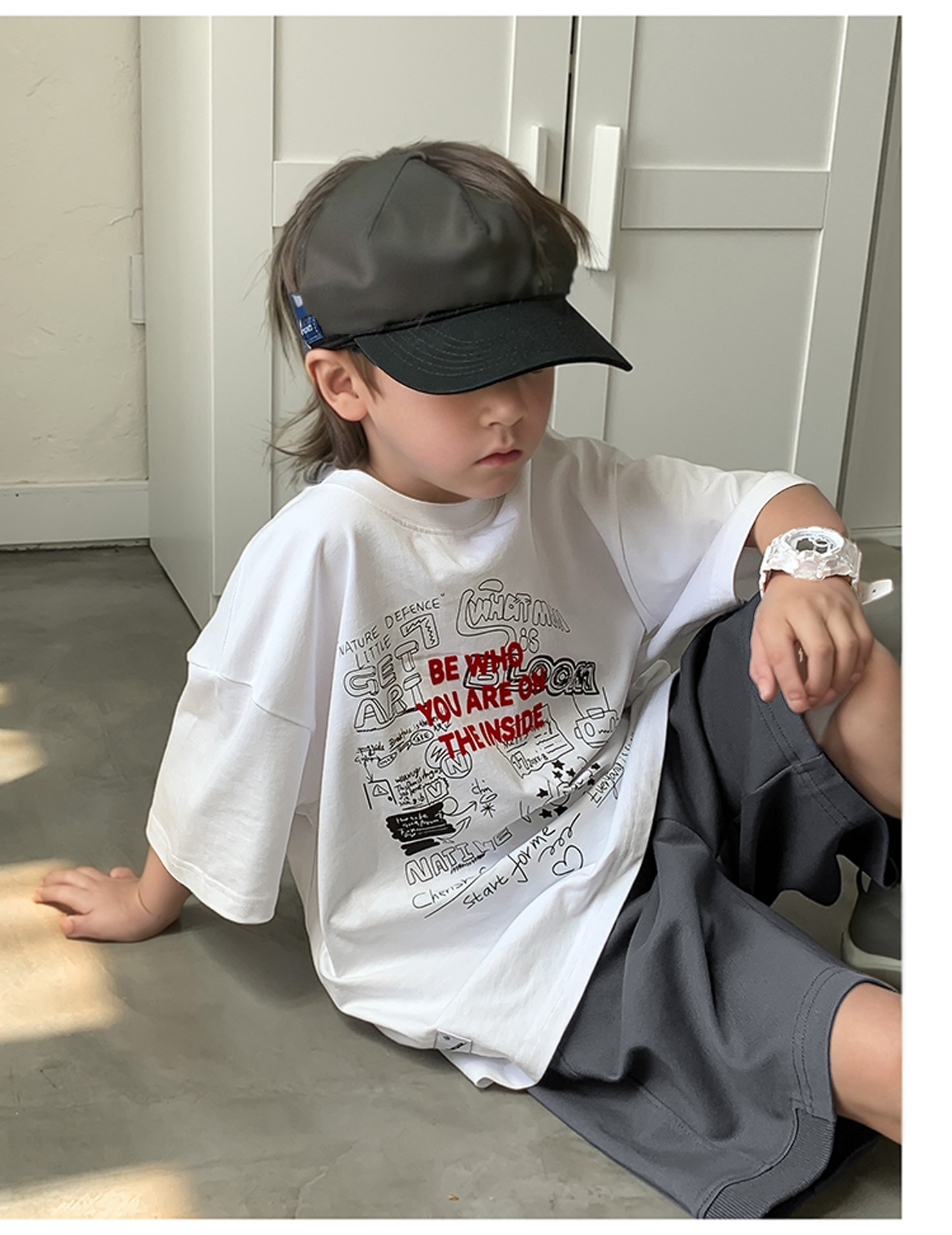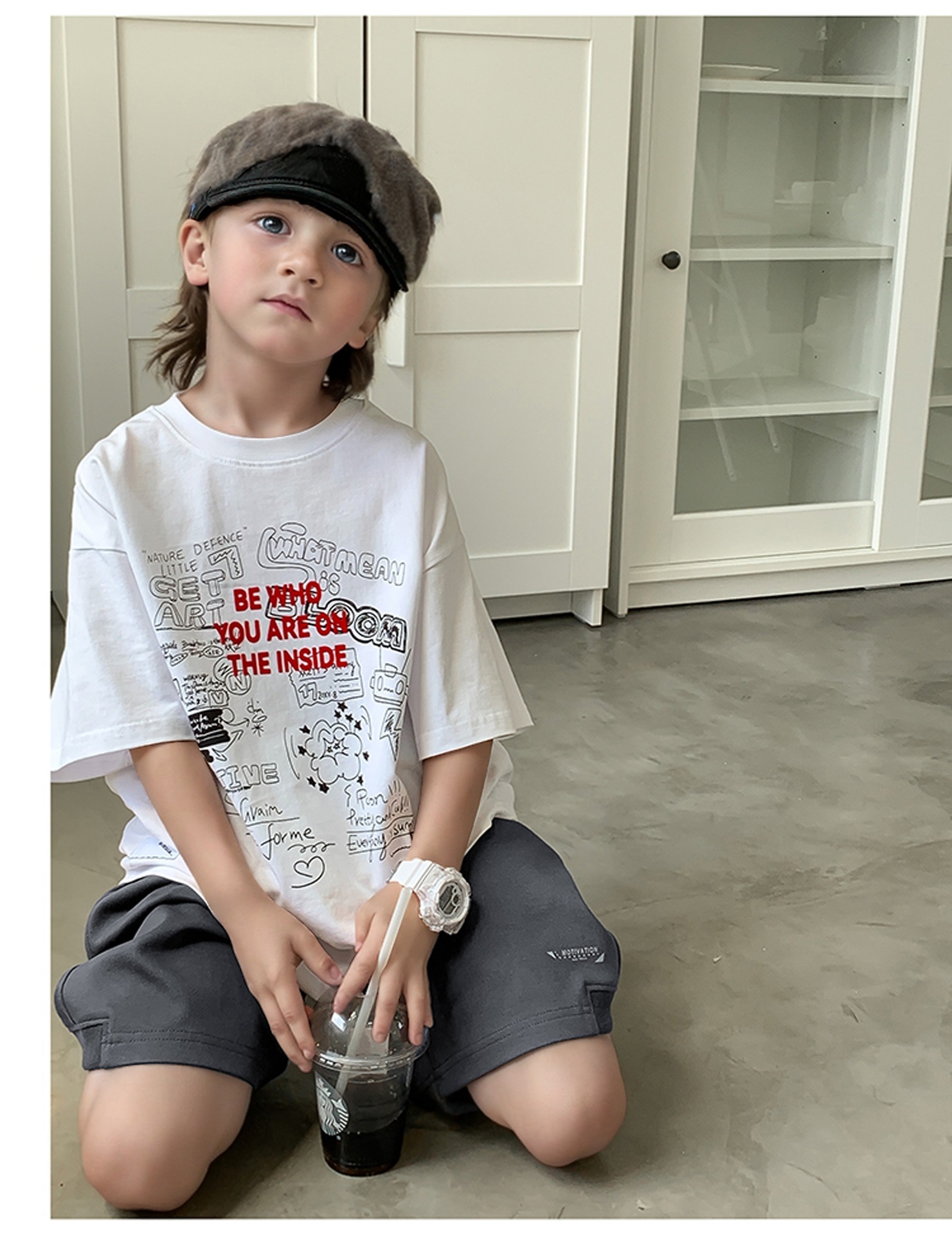 2025 소년과 소녀를위한 새로운 여름 옷 라운드 넥 티셔츠 반팔 유행 어린이 반팔 한국 스타일 베이비 탑 남성 유행스토어 가기