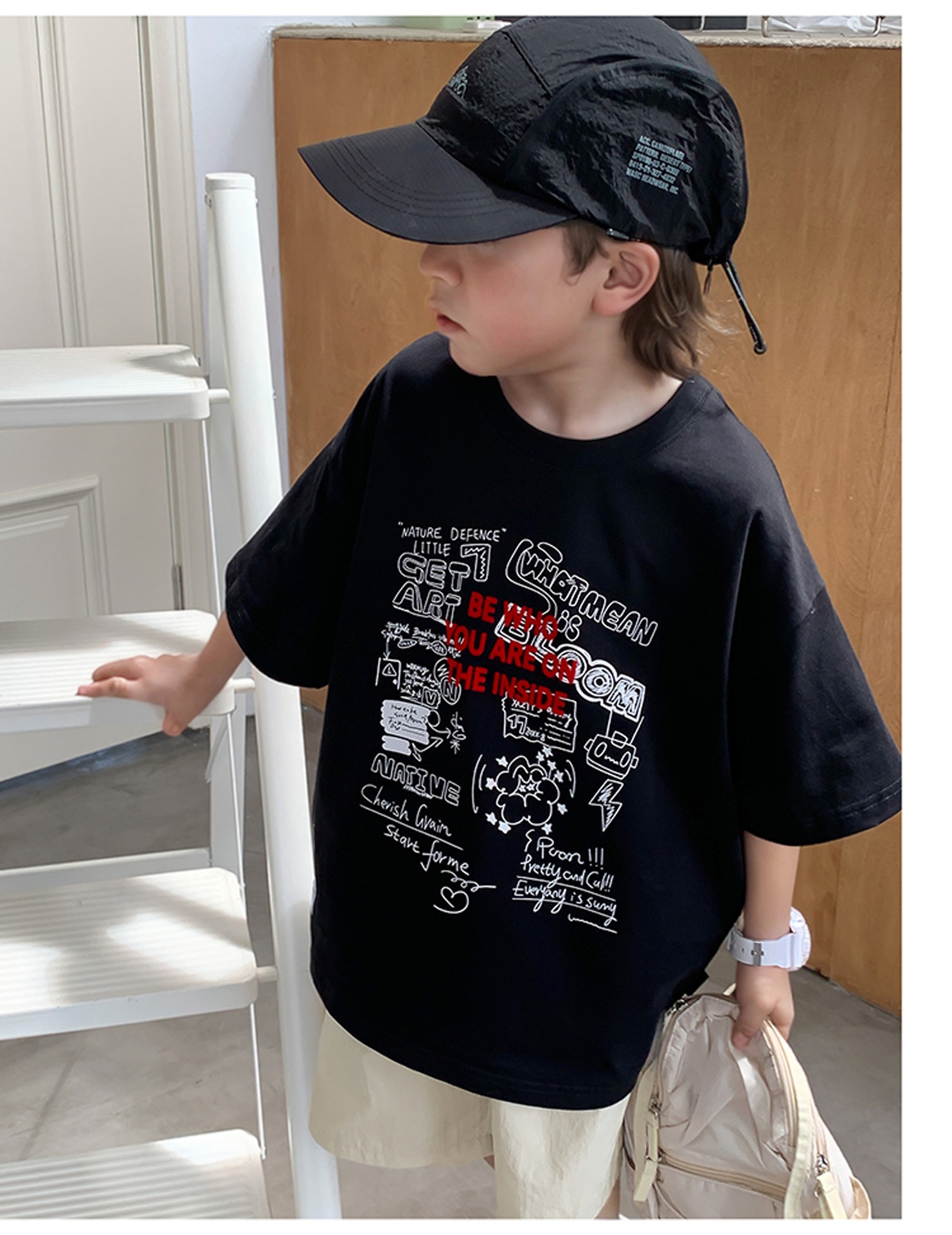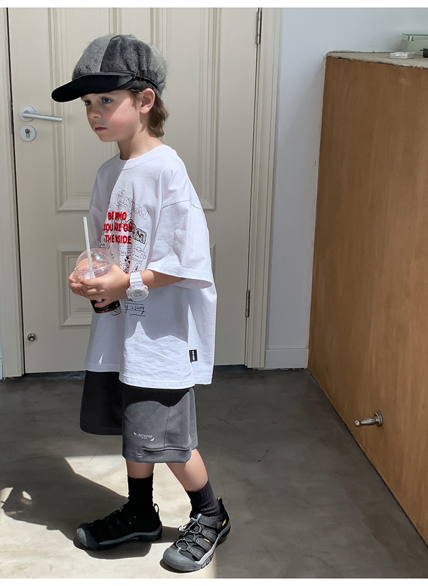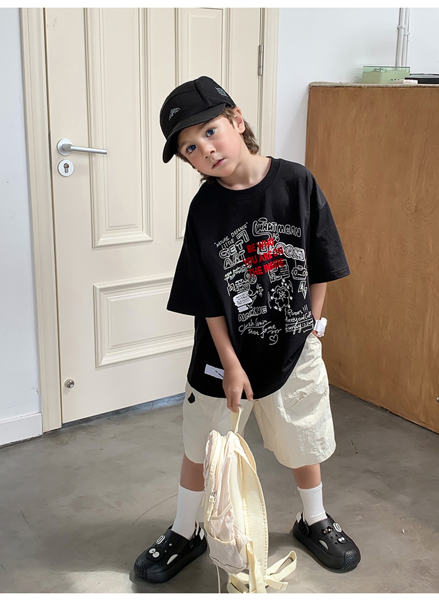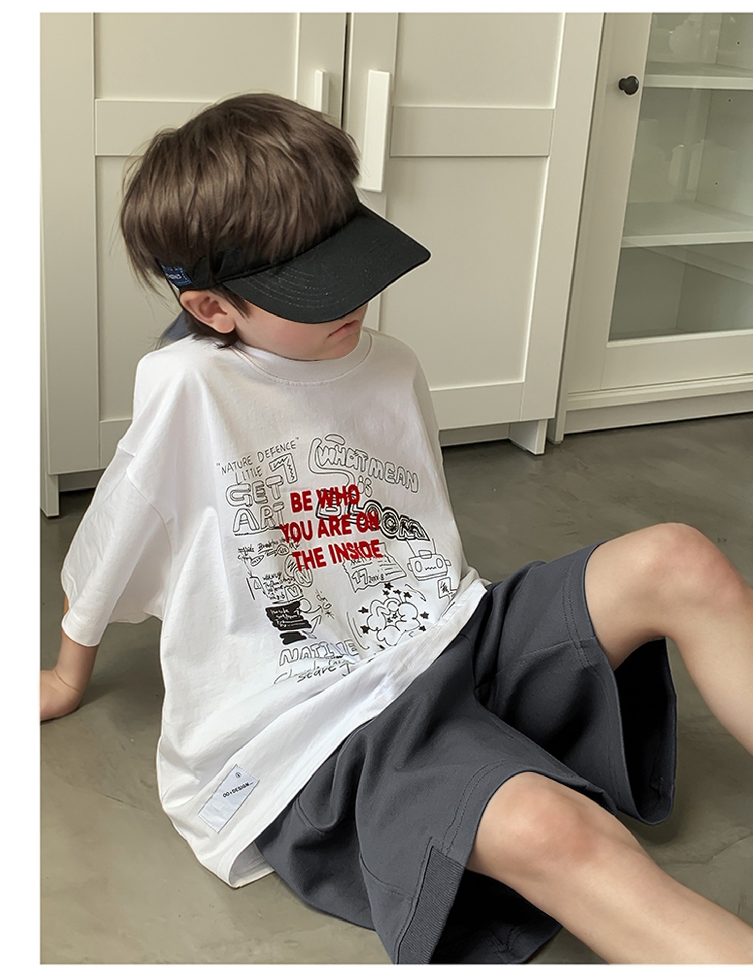 2025 소년과 소녀를위한 새로운 여름 옷 라운드 넥 티셔츠 반팔 유행 어린이 반팔 한국 스타일 베이비 탑 남성 유행스토어 가기