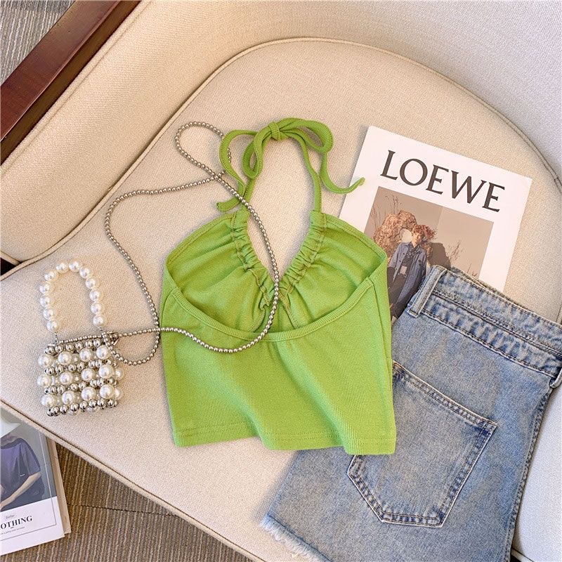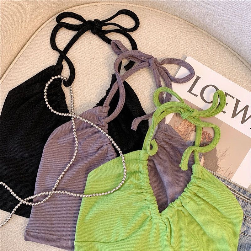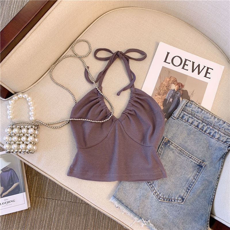 2024 Summer New Girls 유럽과 미국 스타일의 백리스 레이스 업 조끼 높은 허리 짧은베이스 목 매달린 작은 슬링 아우터 웨어