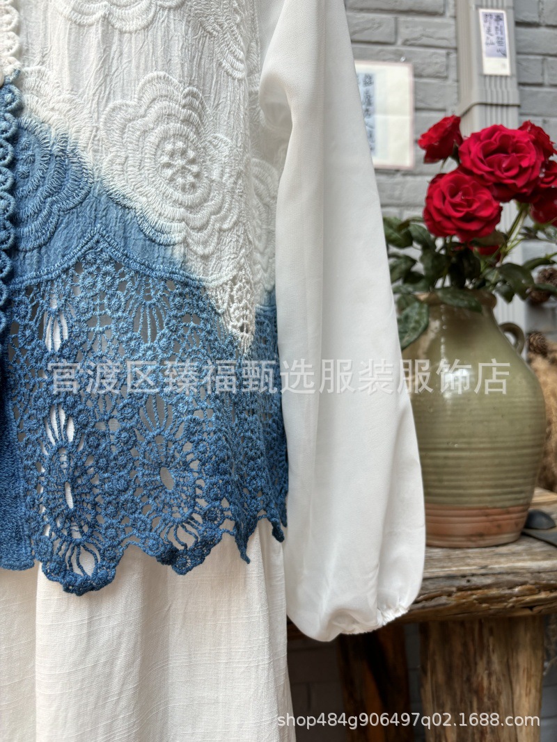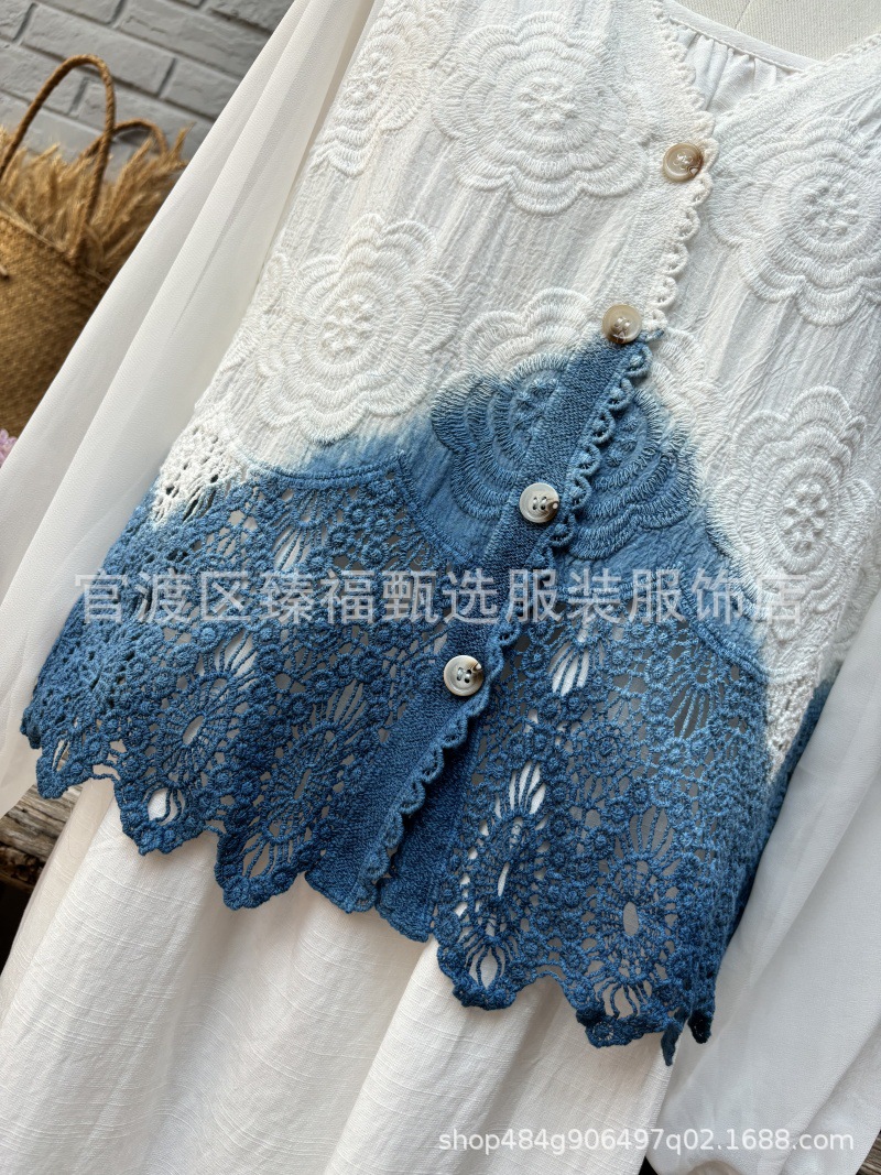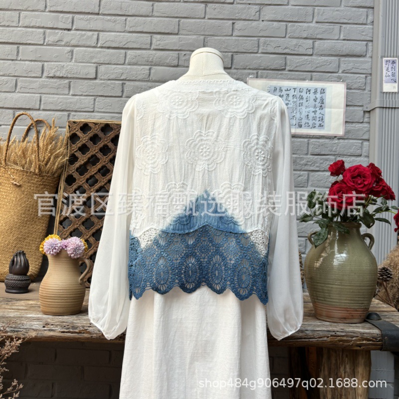 Wen Chuang 관광 선물 니트 할로우 자수 쉬폰 소매 블루 염료 타이 블루 및 화이트 염료 코트 카디건 선 스크린