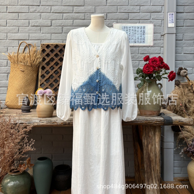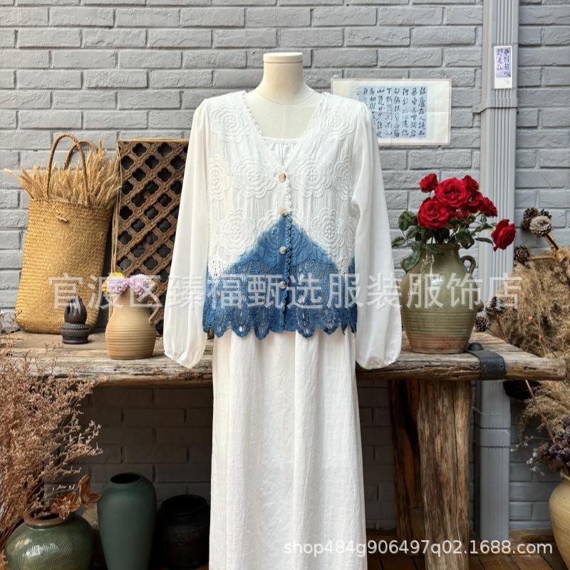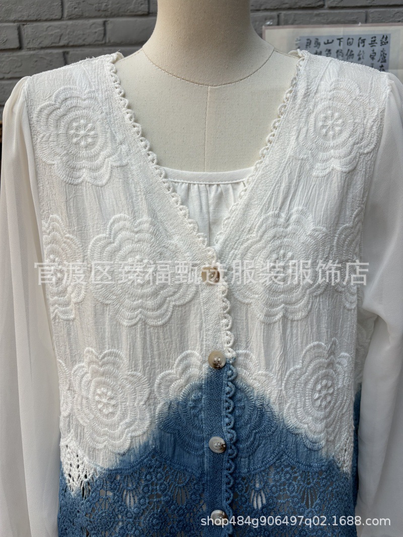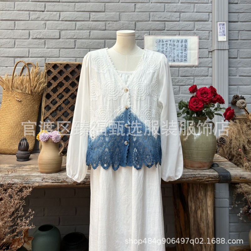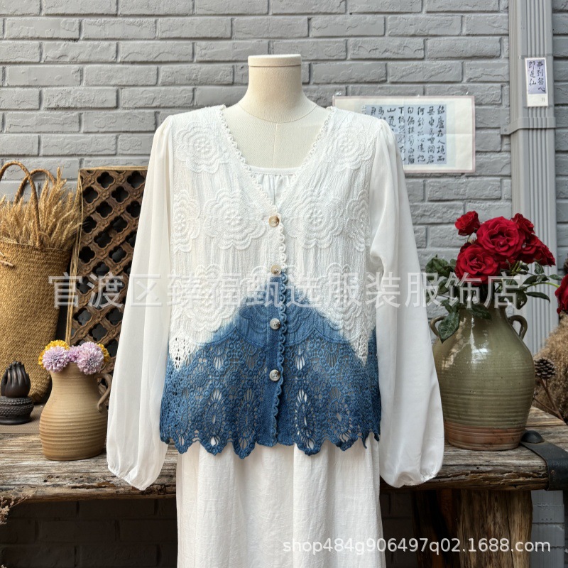 Wen Chuang 관광 선물 니트 할로우 자수 쉬폰 소매 블루 염료 타이 블루 및 화이트 염료 코트 카디건 선 스크린스토어 가기