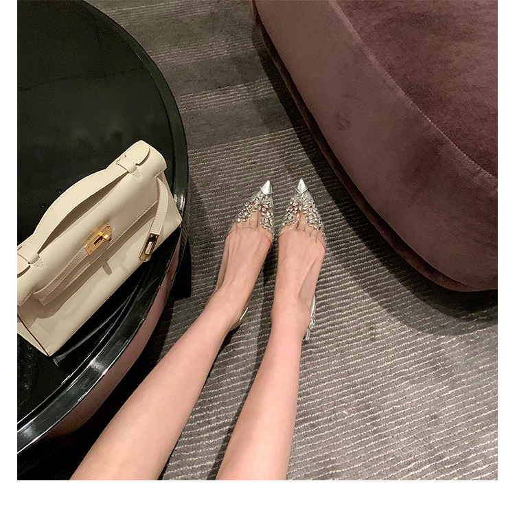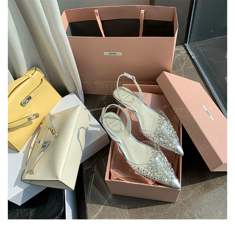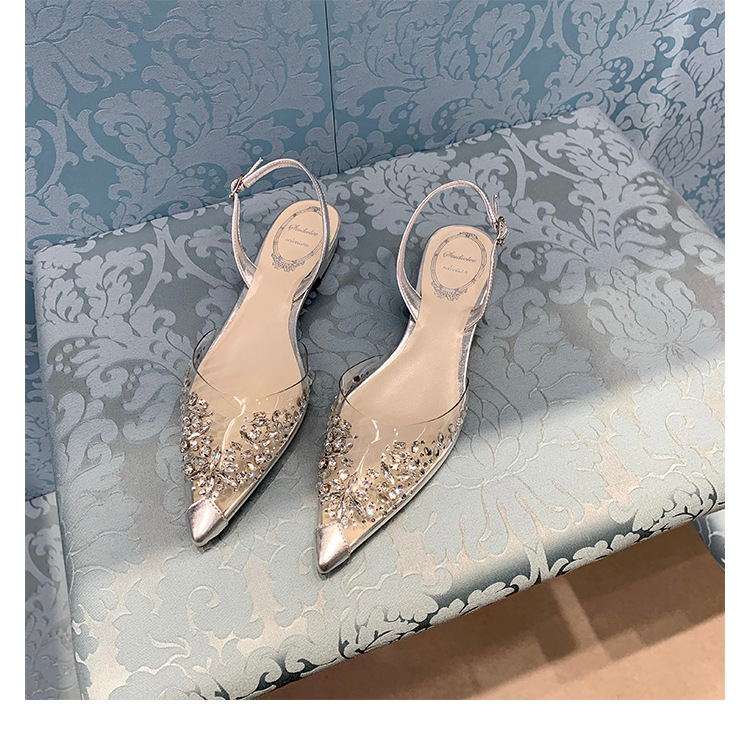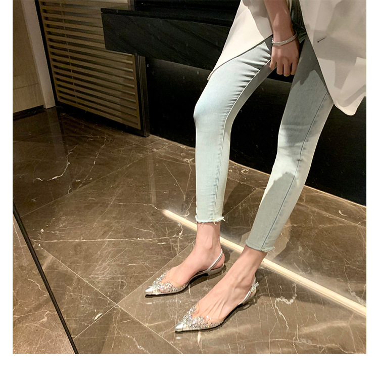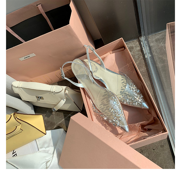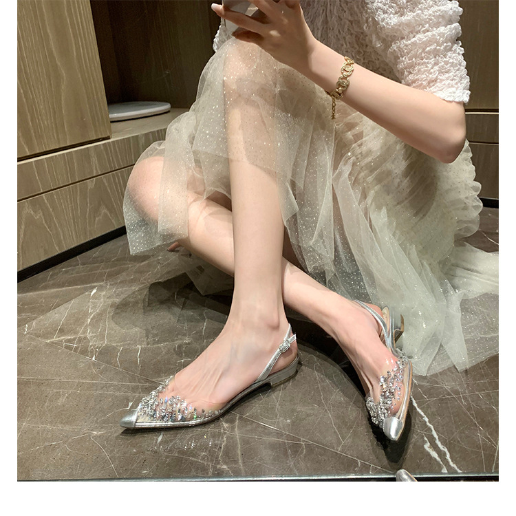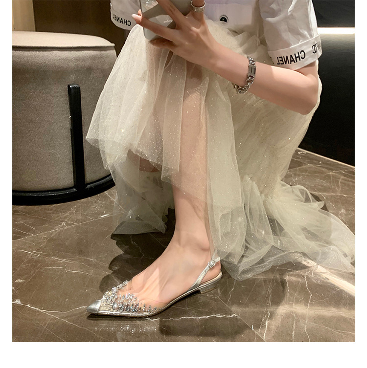 2025 봄과 여름 새로운 투명 라인 석 지적 발가락 낮은 굽 샌들 여성 요정 스타일 틈새 Baotou 라인 석 플랫 신발