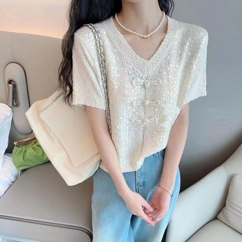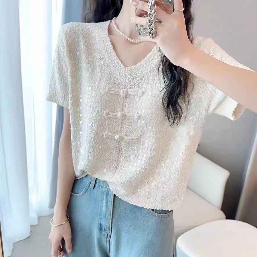 2024 새로운 여름 니트 짧은 소매 중공업 디자인 Sequin 여성을위한 새로운 중국 스타일 국가 스타일 버클 패션 탑