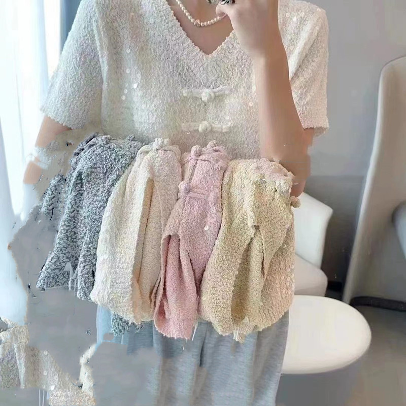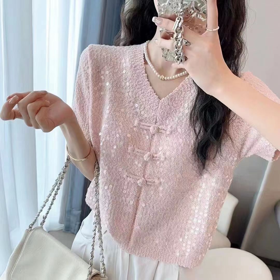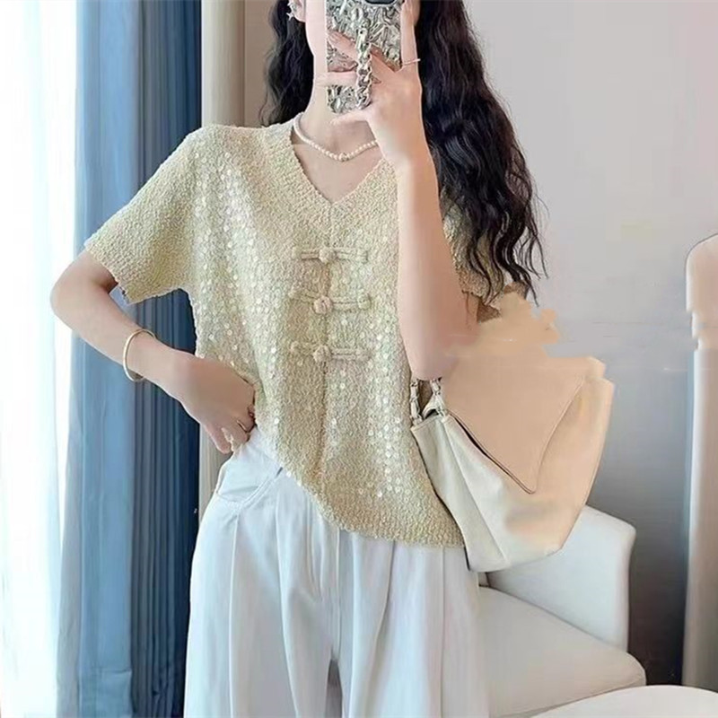 2024 새로운 여름 니트 짧은 소매 중공업 디자인 Sequin 여성을위한 새로운 중국 스타일 국가 스타일 버클 패션 탑스토어 가기
