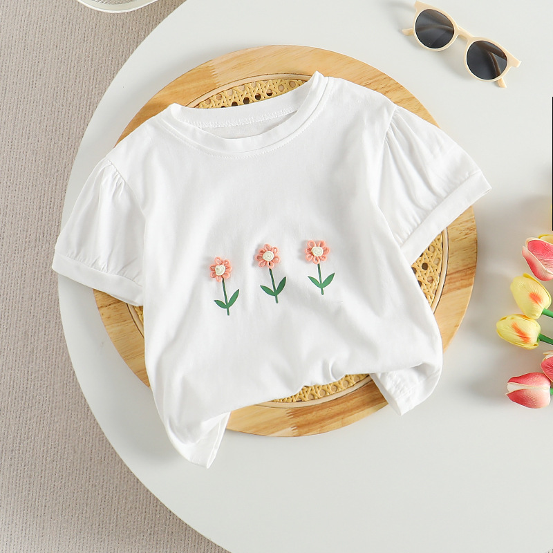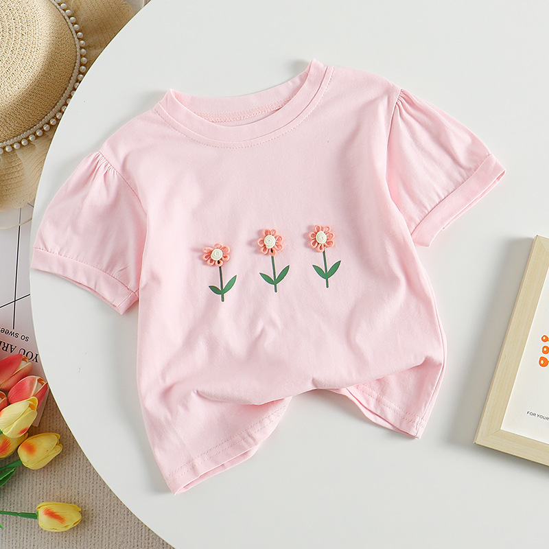 여자 여름 원피스 한국 반팔 티셔츠 공주 서양식 귀여운 아기 3 차원 작은 꽃 반소매 톱 T 어린이 패션