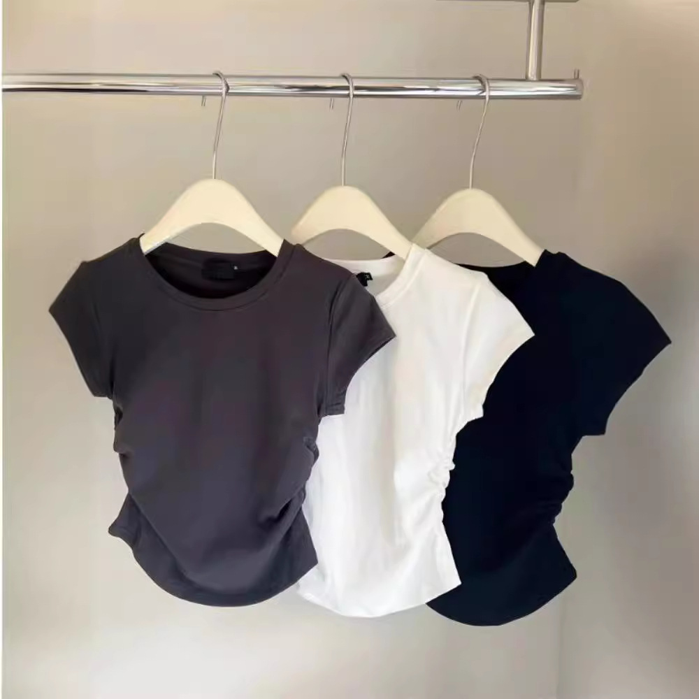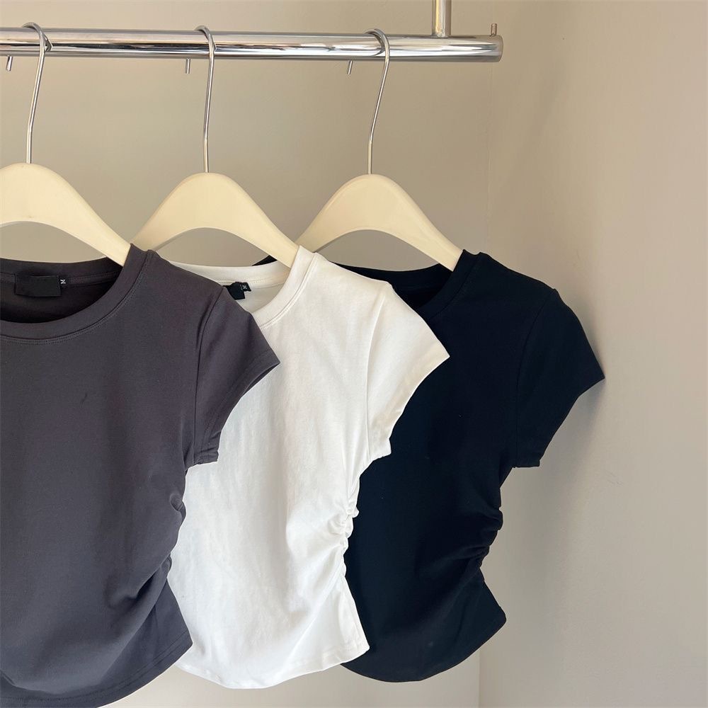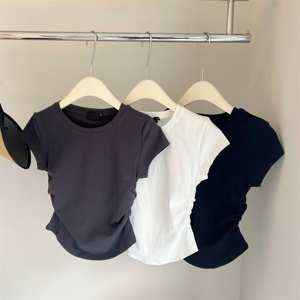 여아 여름 신상 심플 슬림핏 짧은 순면 주름 티셔츠 2026 한국판 라운드넥 반팔 캐주얼 티셔츠스토어 가기