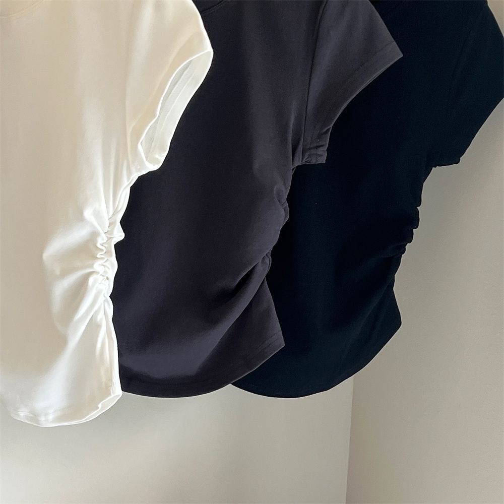 여아 여름 신상 심플 슬림핏 짧은 순면 주름 티셔츠 2026 한국판 라운드넥 반팔 캐주얼 티셔츠