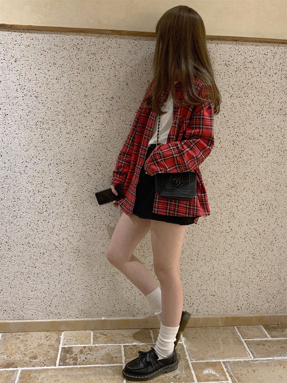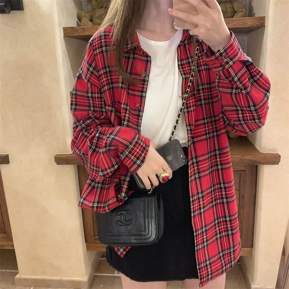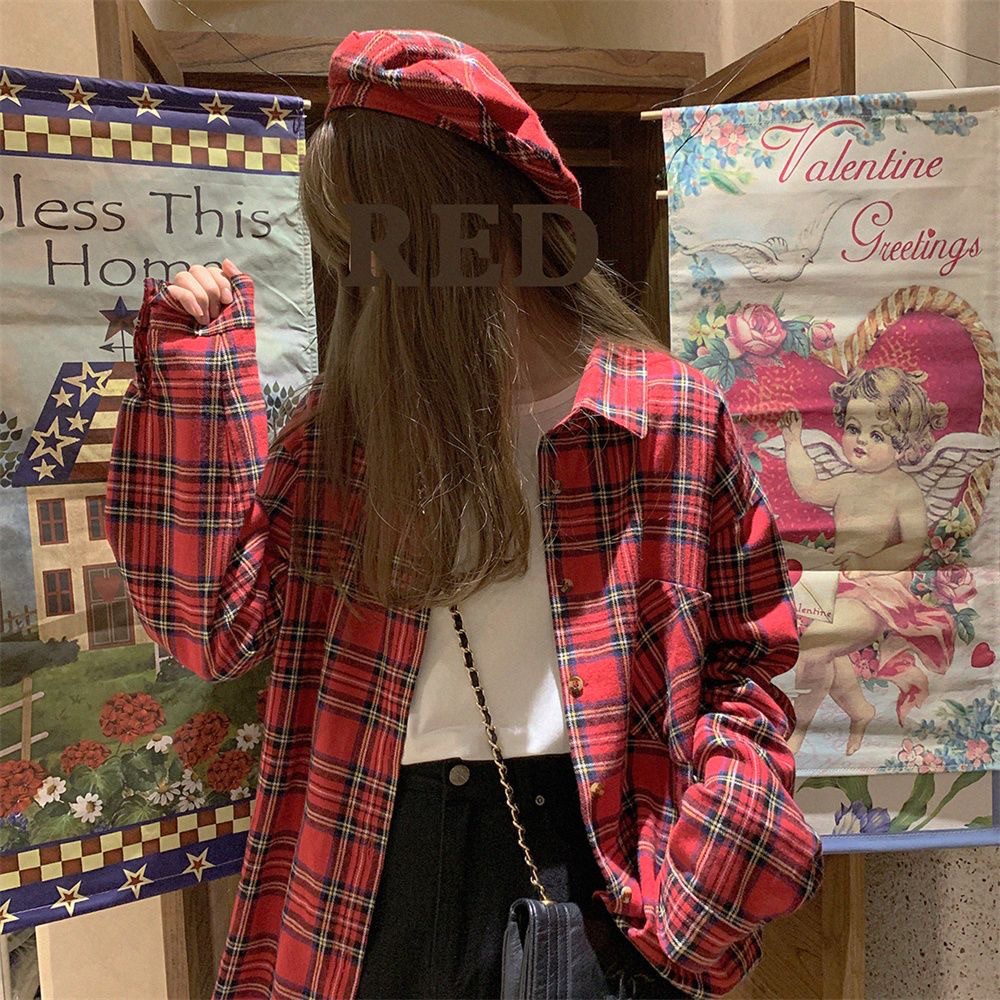 스크러스트 레드 플레이드 캐주얼 올 매치 루즈 체크 셔츠 레드 셔츠 라이트 럭셔리 홍콩 스타일 빈티지