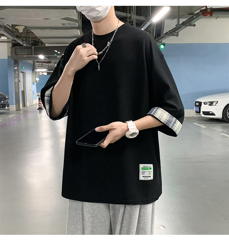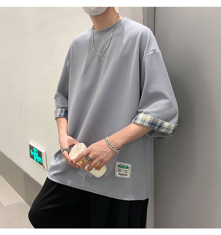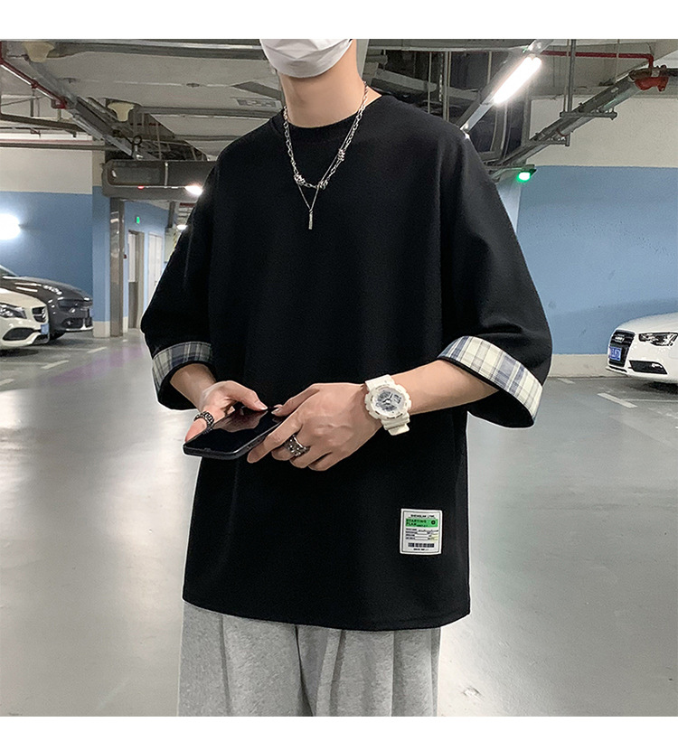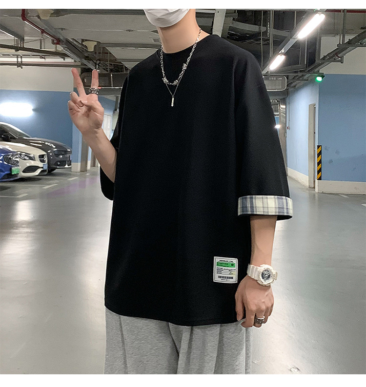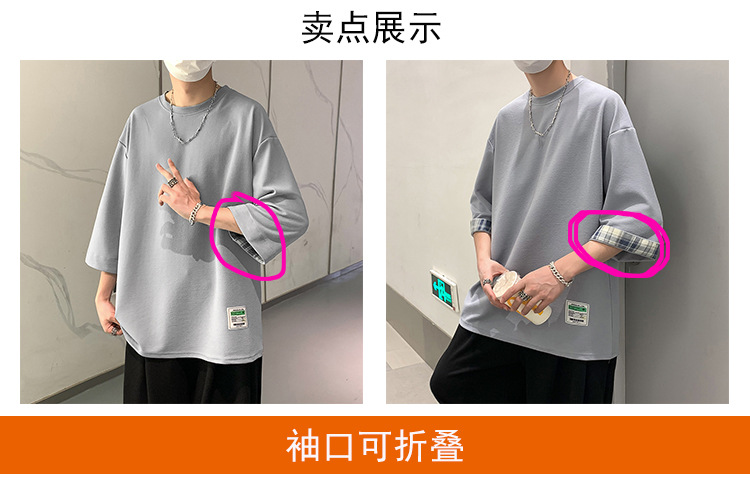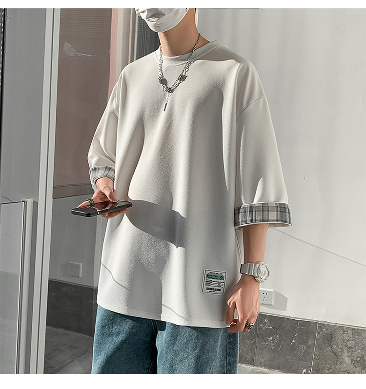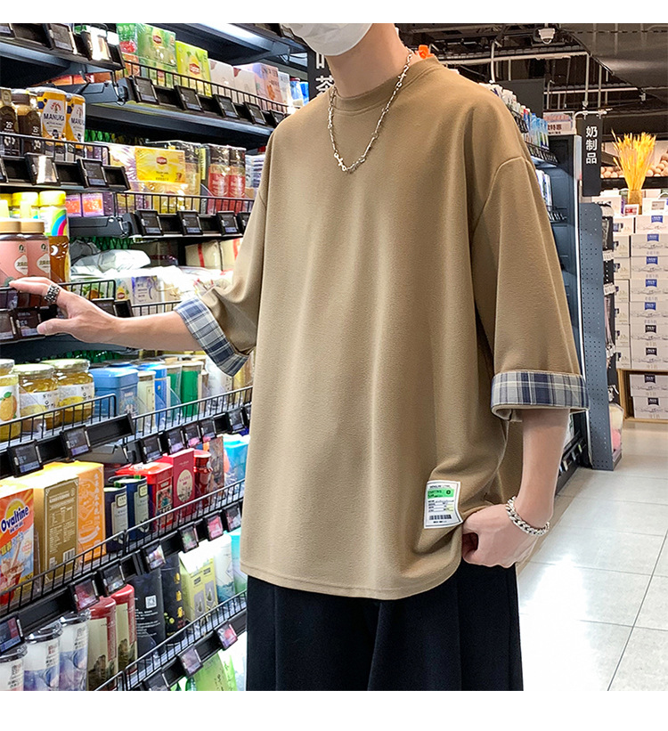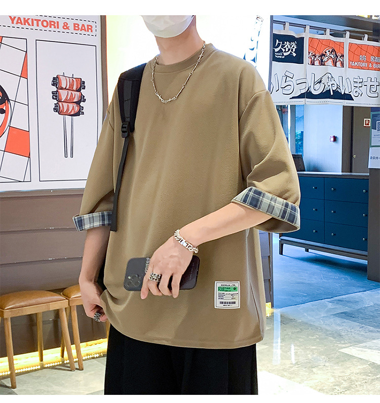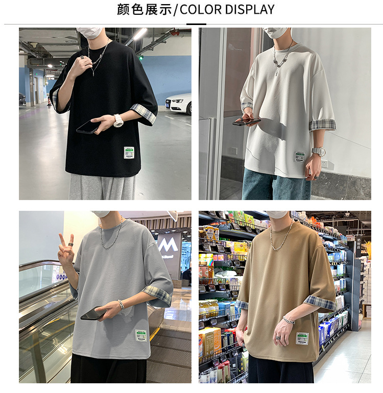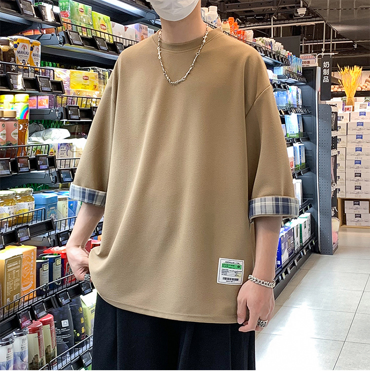 여름 홍콩 스타일 일본 플러스 사이즈 남성용 팻 루즈 컬러 매칭 커프 미드 슬리브 세븐 슬리브 티셔츠 탑스토어 가기