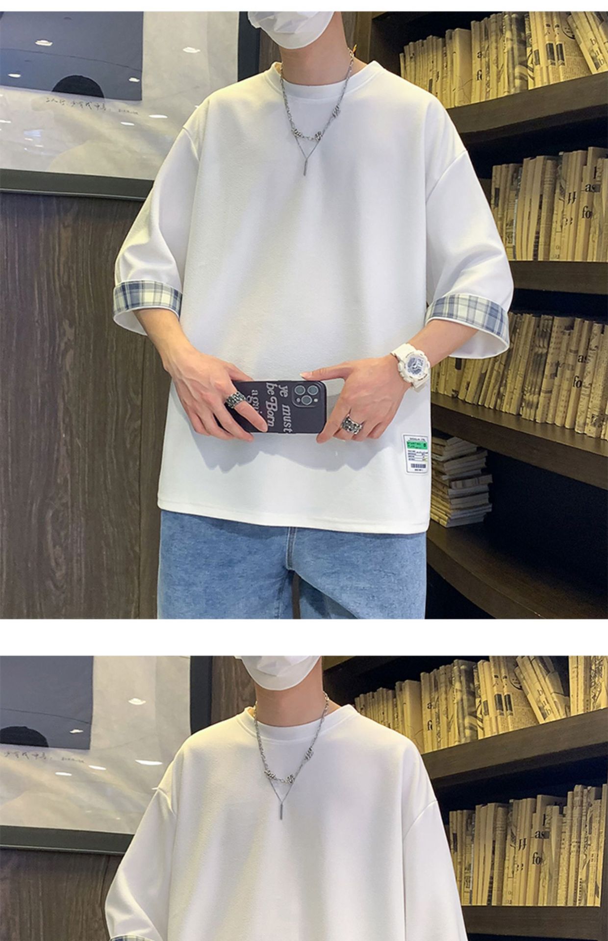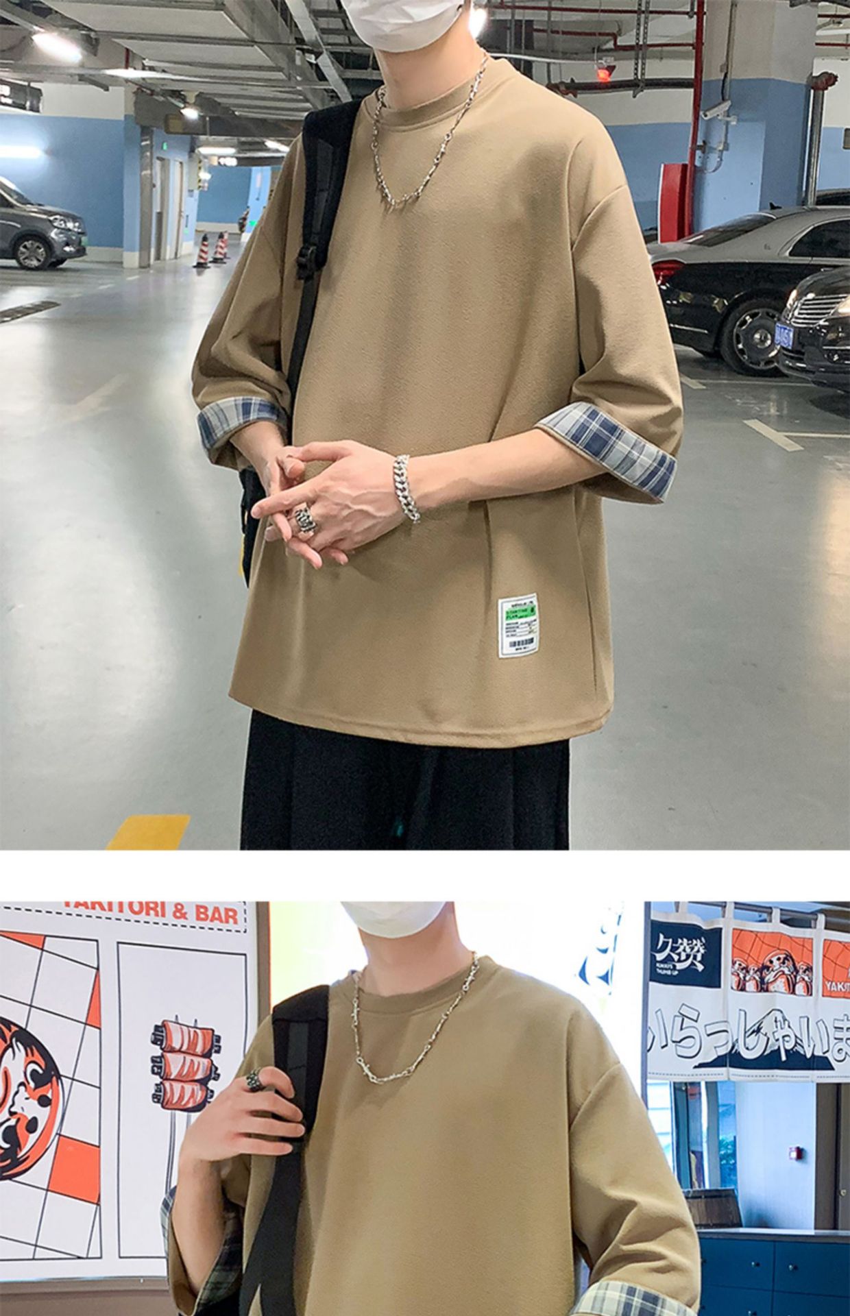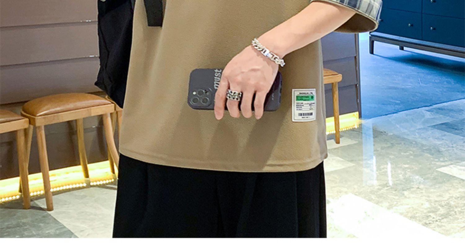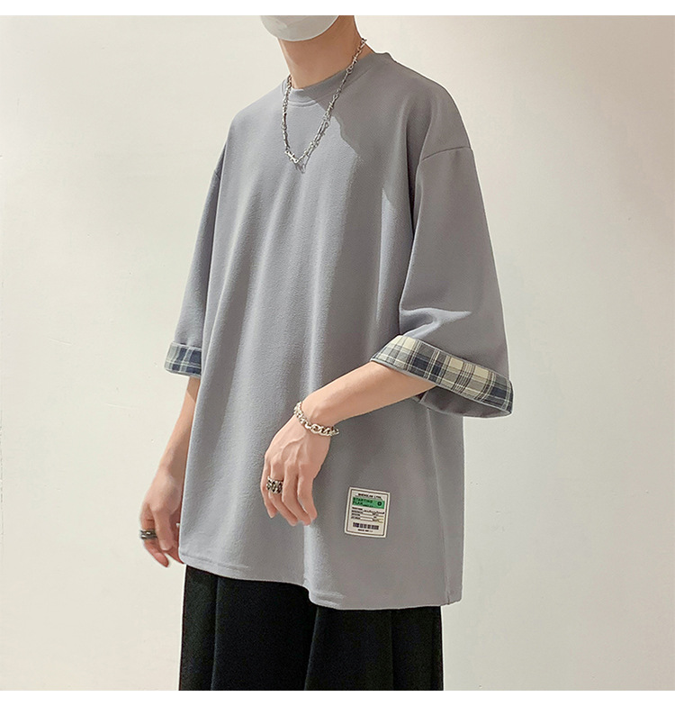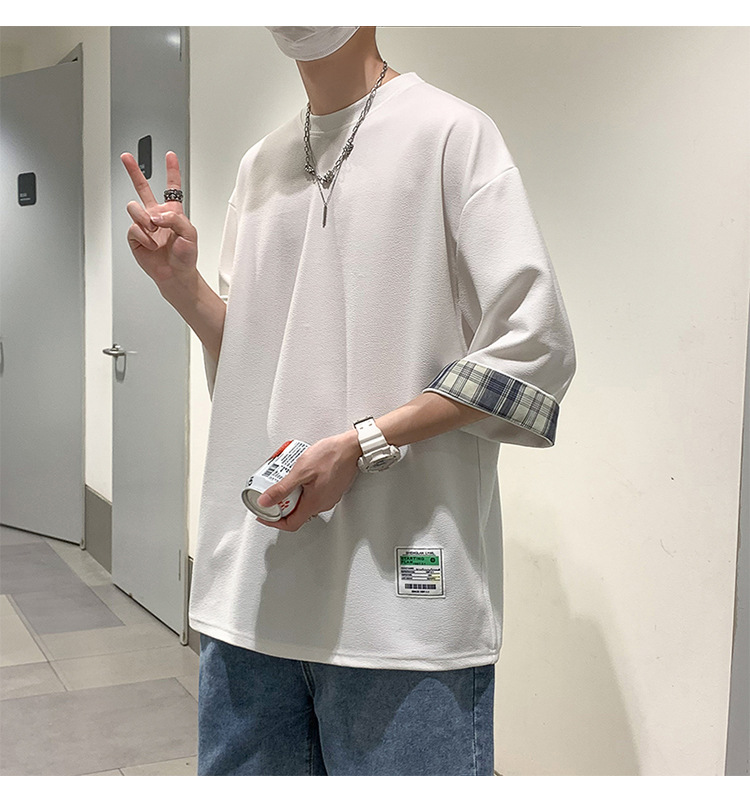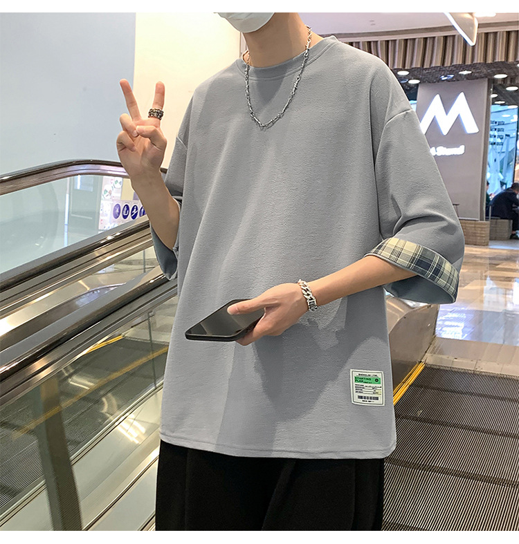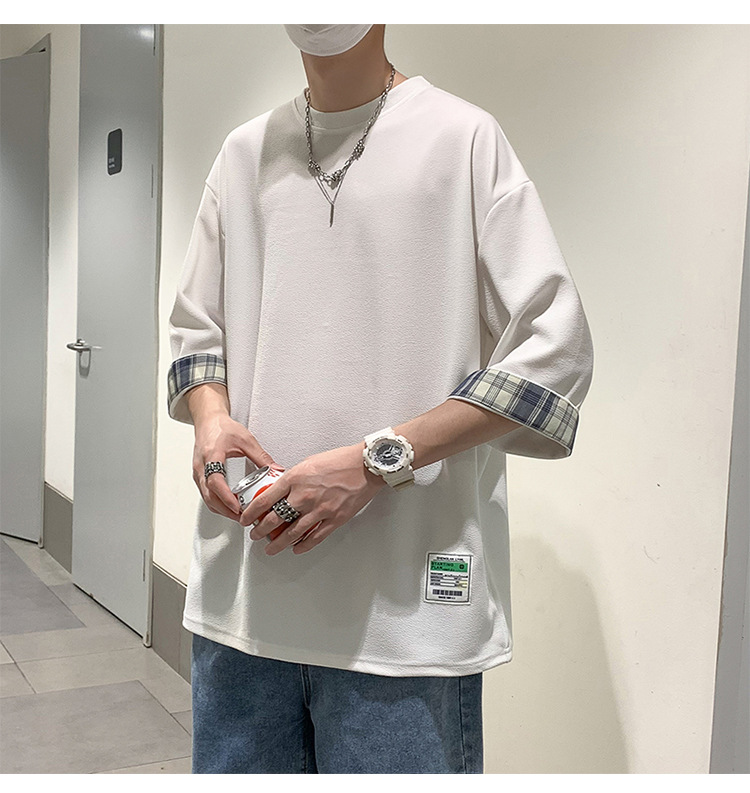 여름 홍콩 스타일 일본 플러스 사이즈 남성용 팻 루즈 컬러 매칭 커프 미드 슬리브 세븐 슬리브 티셔츠 탑스토어 가기