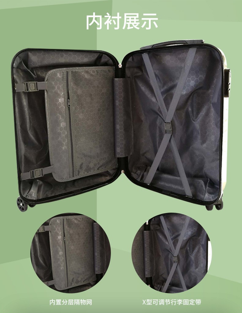 拉杆箱主箱体材质为ABS,板材厚度为2.1-2.2毫米,需要加厚材质的客户可以联系客服询价~