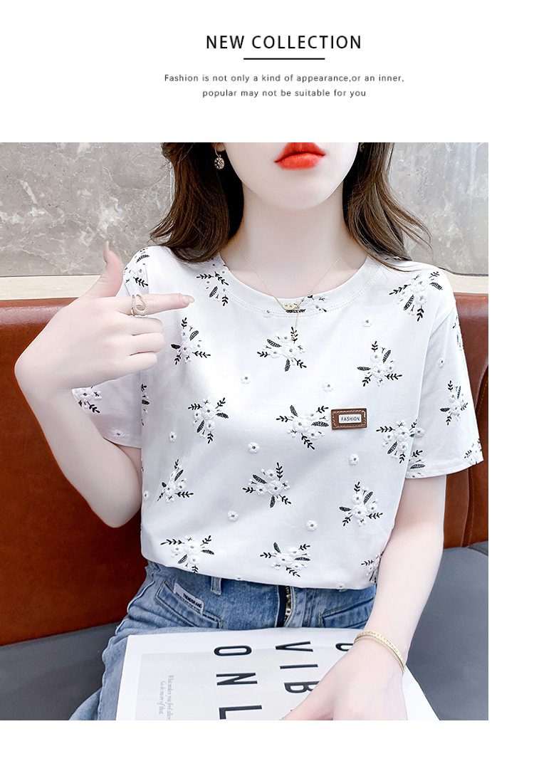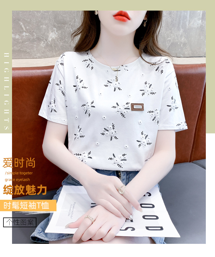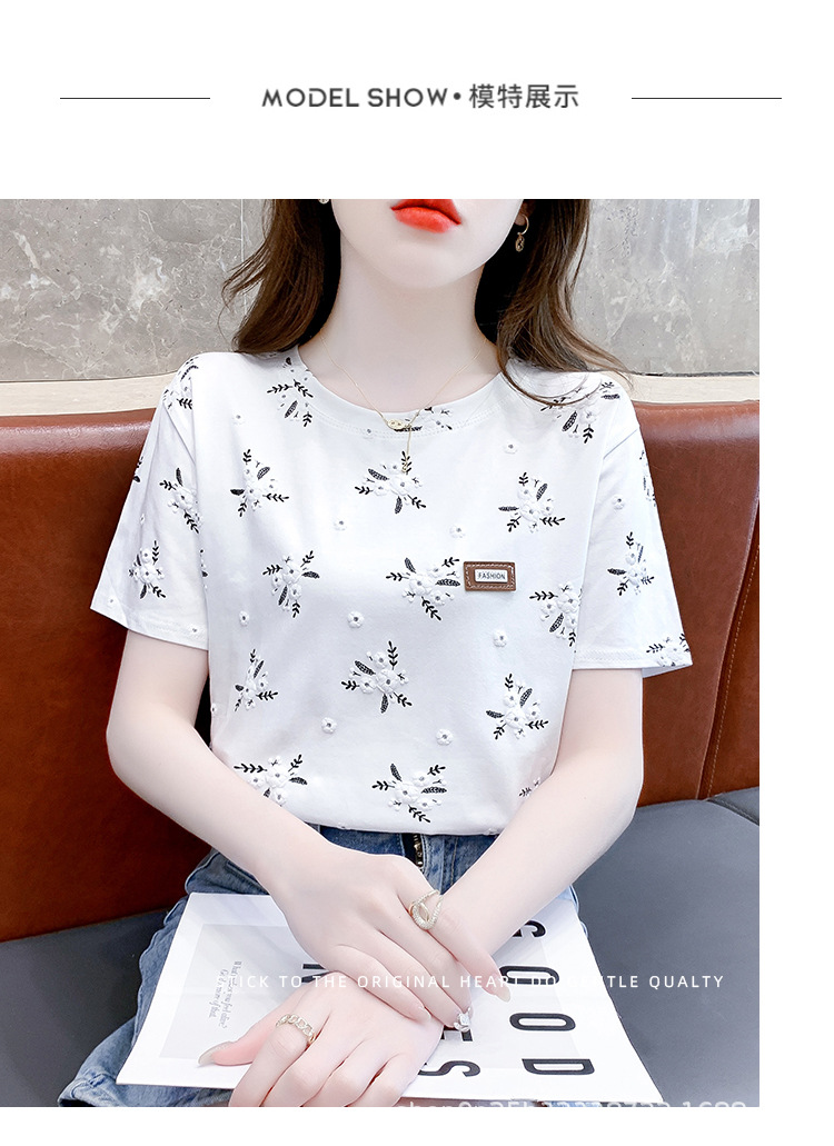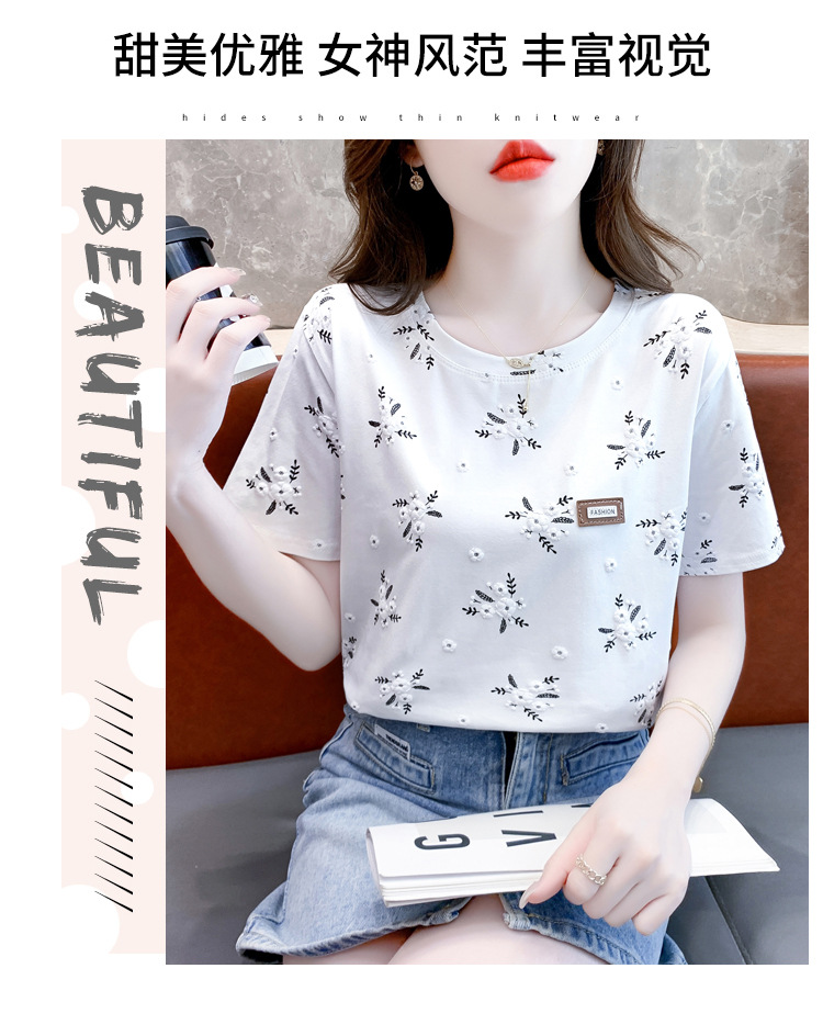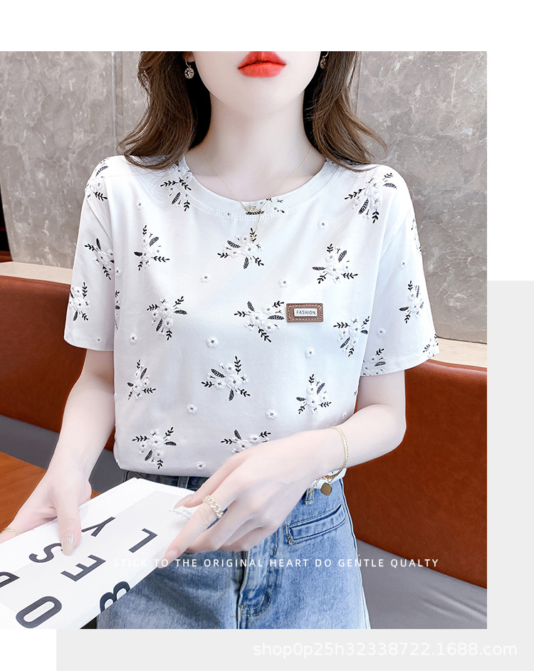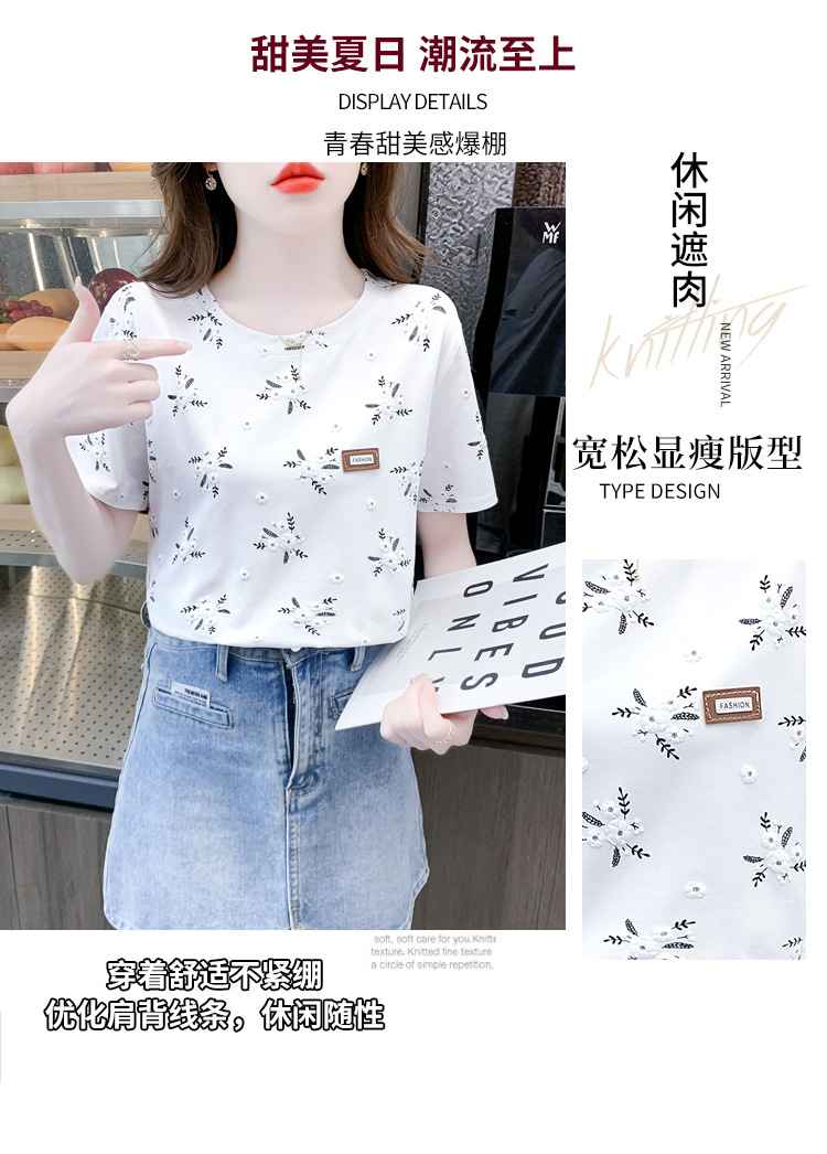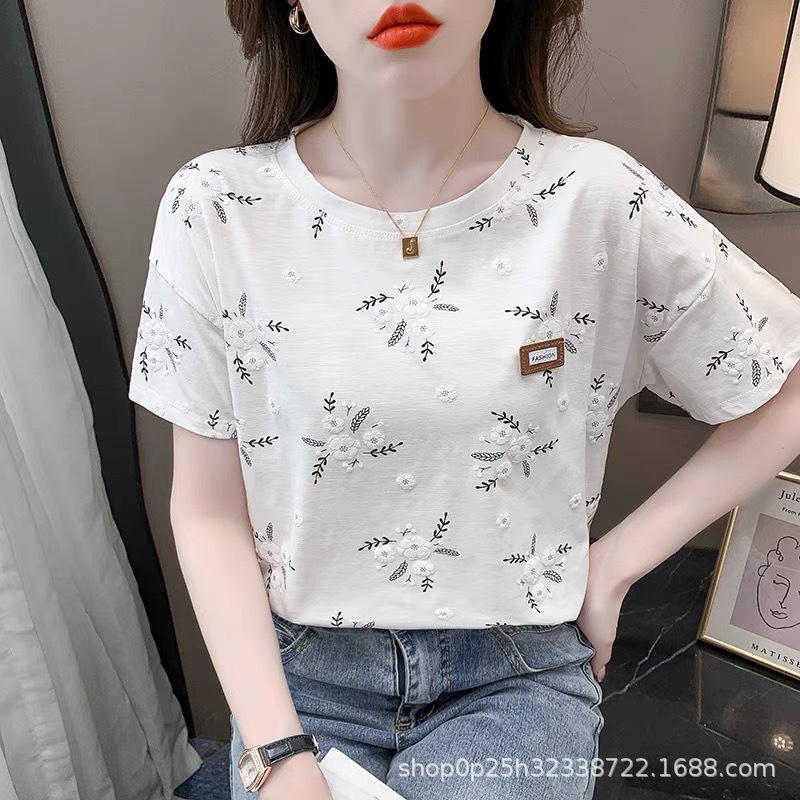 반팔 티셔츠 레이디스 화이트 2024 새로운 한국 스타일 느슨한 라운드 넥 Ins 트렌디 크리에이티브 반소매 이너 탑 트렌디스토어 가기
